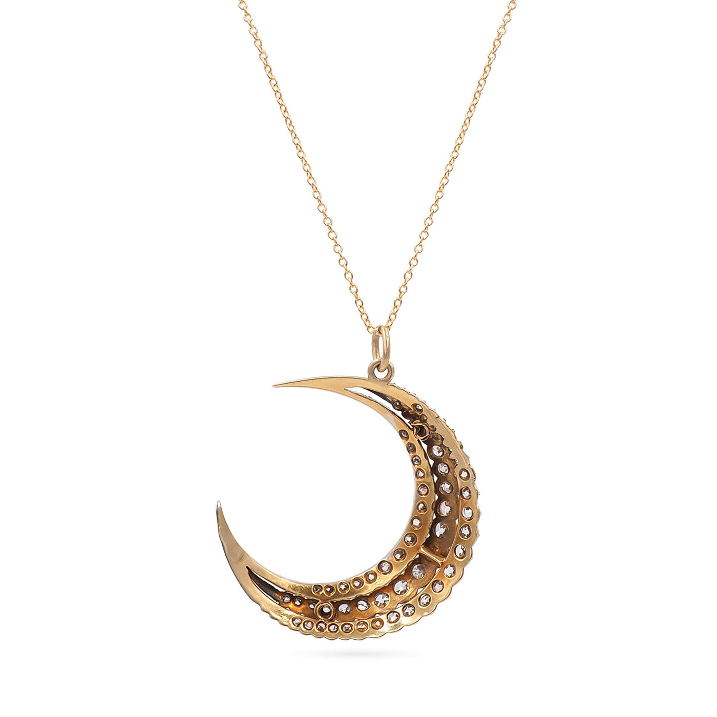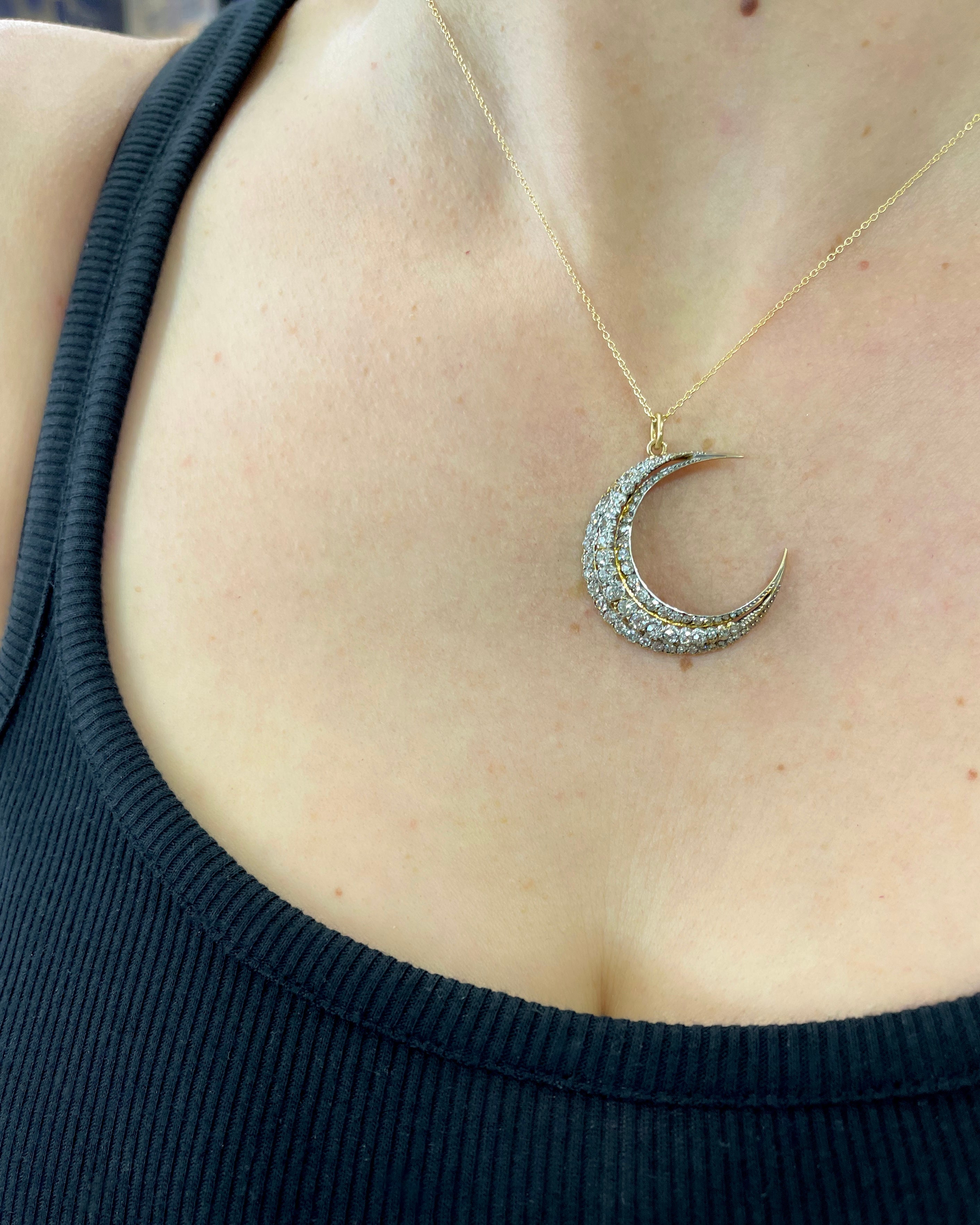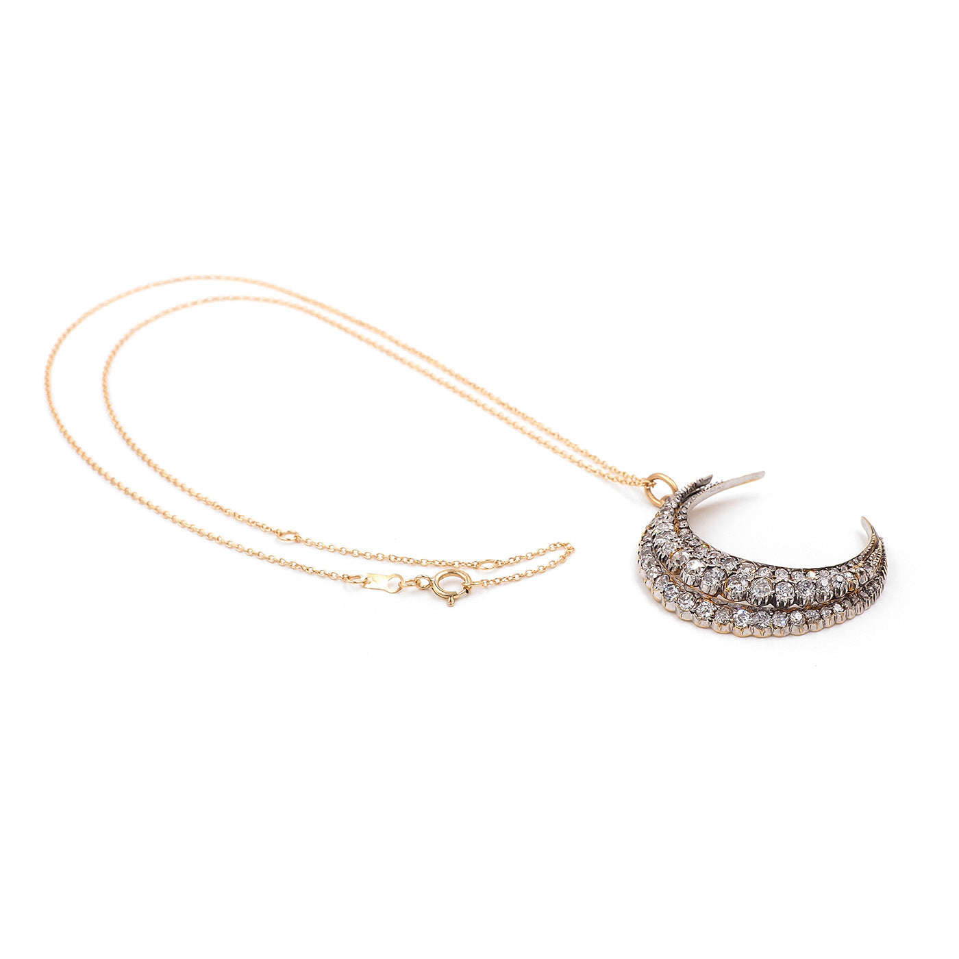 Victorian era 1.50 Ctw. Diamond Crescent Moon Pendant Necklace composed of 18k yellow gold and silver. The crescent moon is set with 71 diamonds -- a combination of Old European Cut and Rose Cut diamonds weighing approximately 1.50 carats in total. The pendant has a silver top, 18k gold back. The crescent measures approximately 1 3/8" tall by 1 1/4" wide and weighs 5.22 grams. Circa 1880.