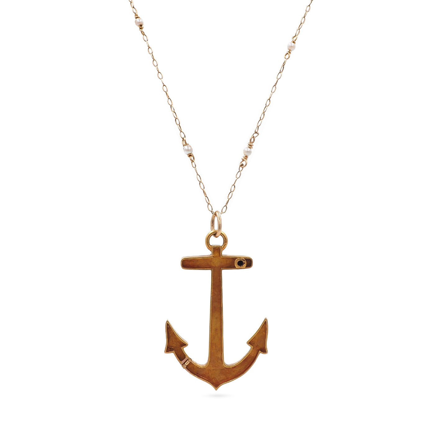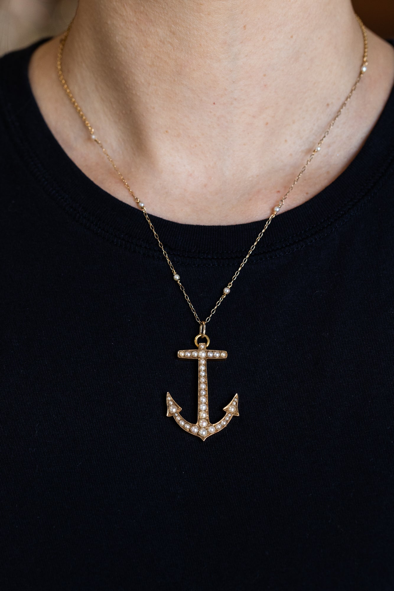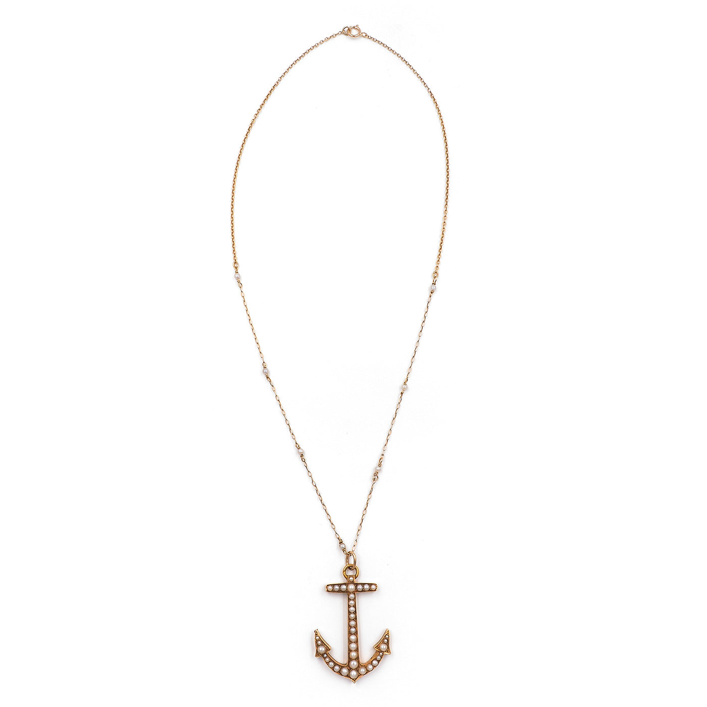 French Victorian era Pearl Anchor Pendant composed of 18k yellow gold, on a pearl-set 14k yellow gold chain. The anchor-shaped pendant features pearls throughout and measures approximately 1 3/4" tall by 1 1/8" wide; weighs 5.9 grams. Hallmarked for French origin. Circa 1900.