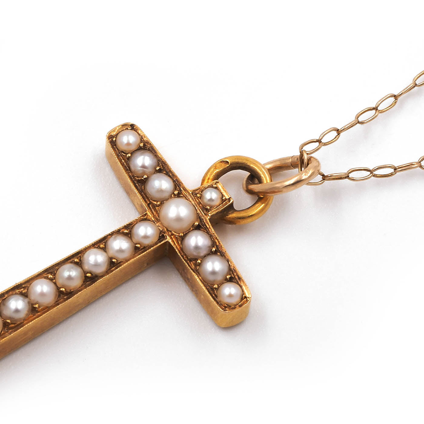The pendant comes on an antique 14k gold chain that features alternating pearls and chain; measures approximately 18 1/2" long and weighs grams. With an O-ring clasp.