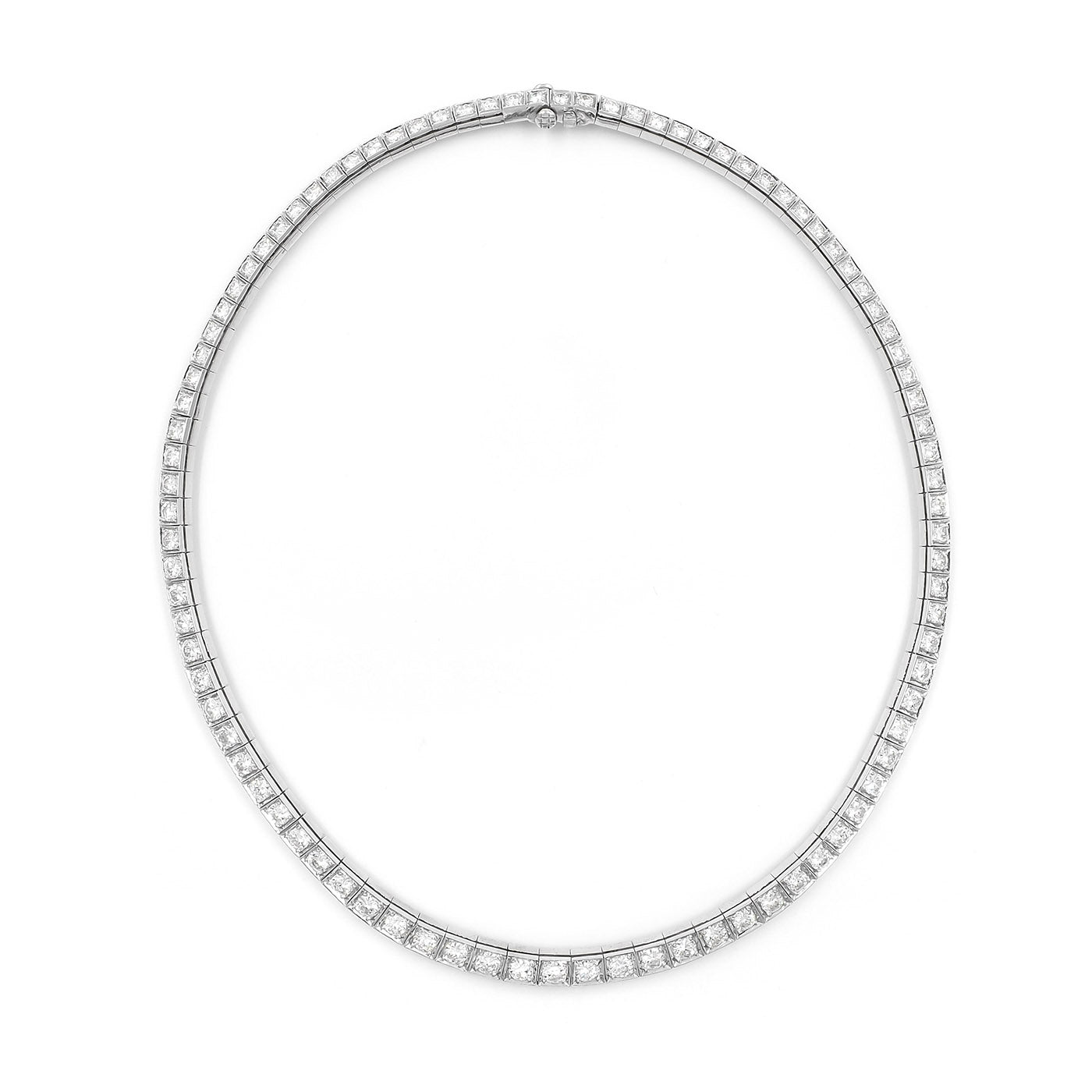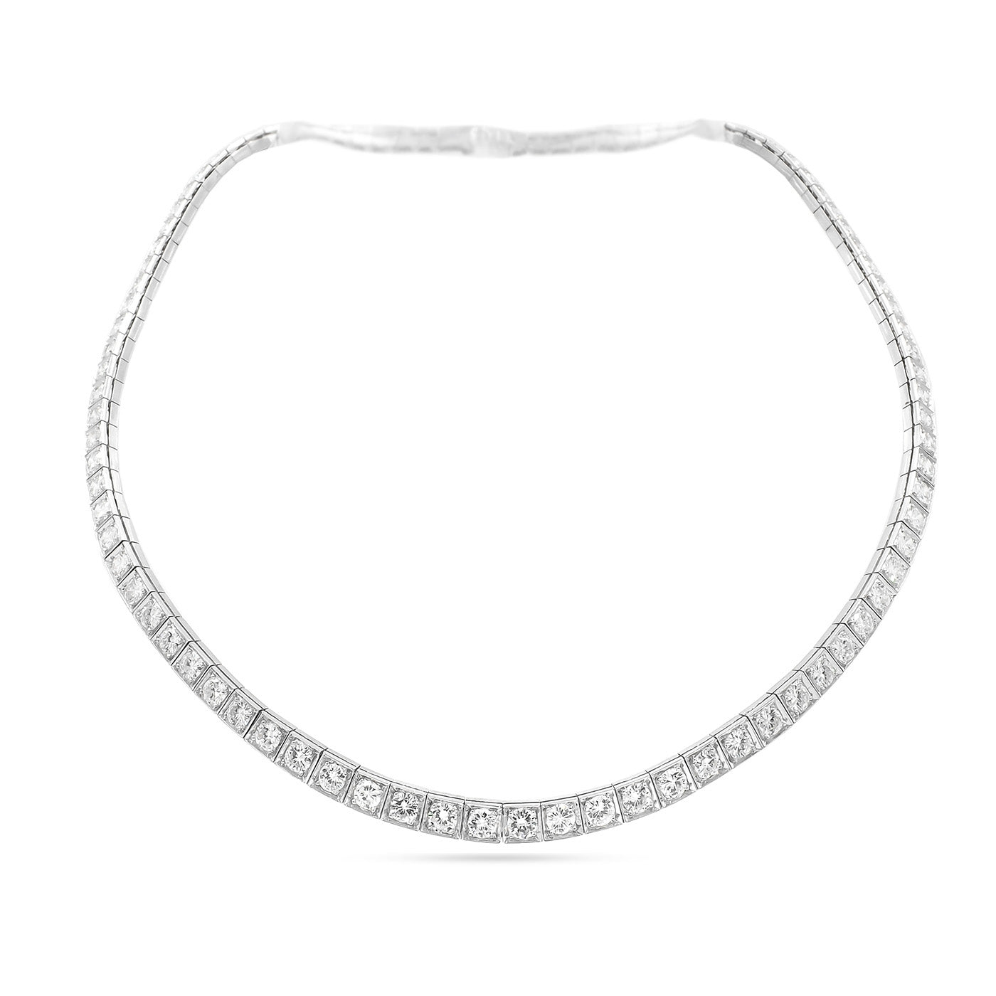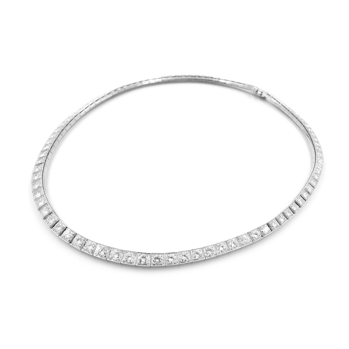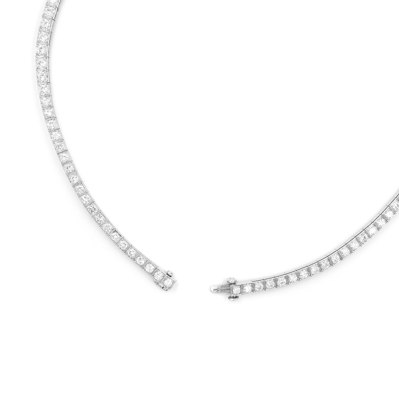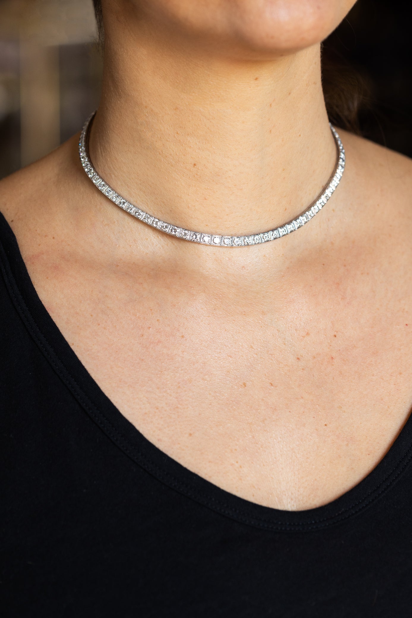 Mid-Century 13.50 Ctw. Round Brilliant Cut Diamond Collar Necklace composed of platinum. Featuring 92 Round Brilliant Cut diamonds weighing approximately 13.50 carats in total, with colors estimated to be J-K-L and clarities estimated to be VS2-SI2 (with a few I1 stones towards the back). The diamonds are set into individual square-shaped links with fine milgrain details, and the necklace has a slightly graduated design to it (measures approximately 4.9 mm wide at the front and 3.4 mm wide at back). Necklace weighs 32.16 grams; measures approximately 14 7/8" long. With a push to close clasp and latch. Circa 1950-1960.
