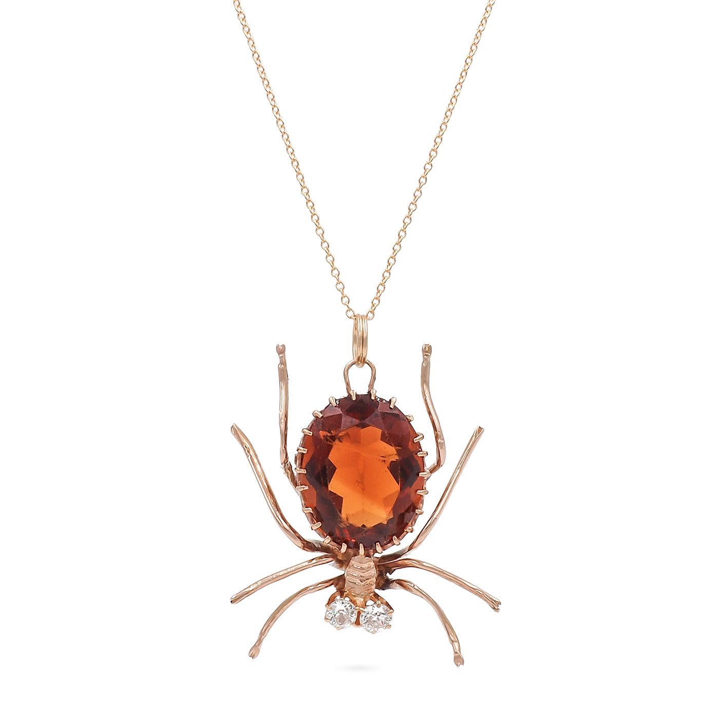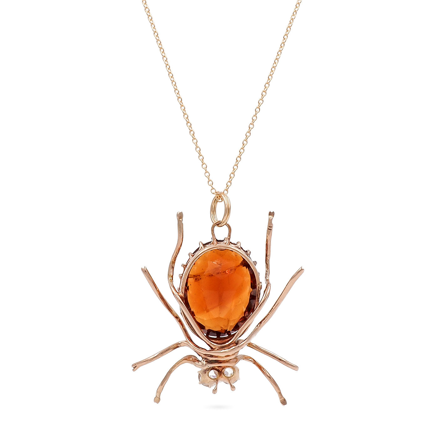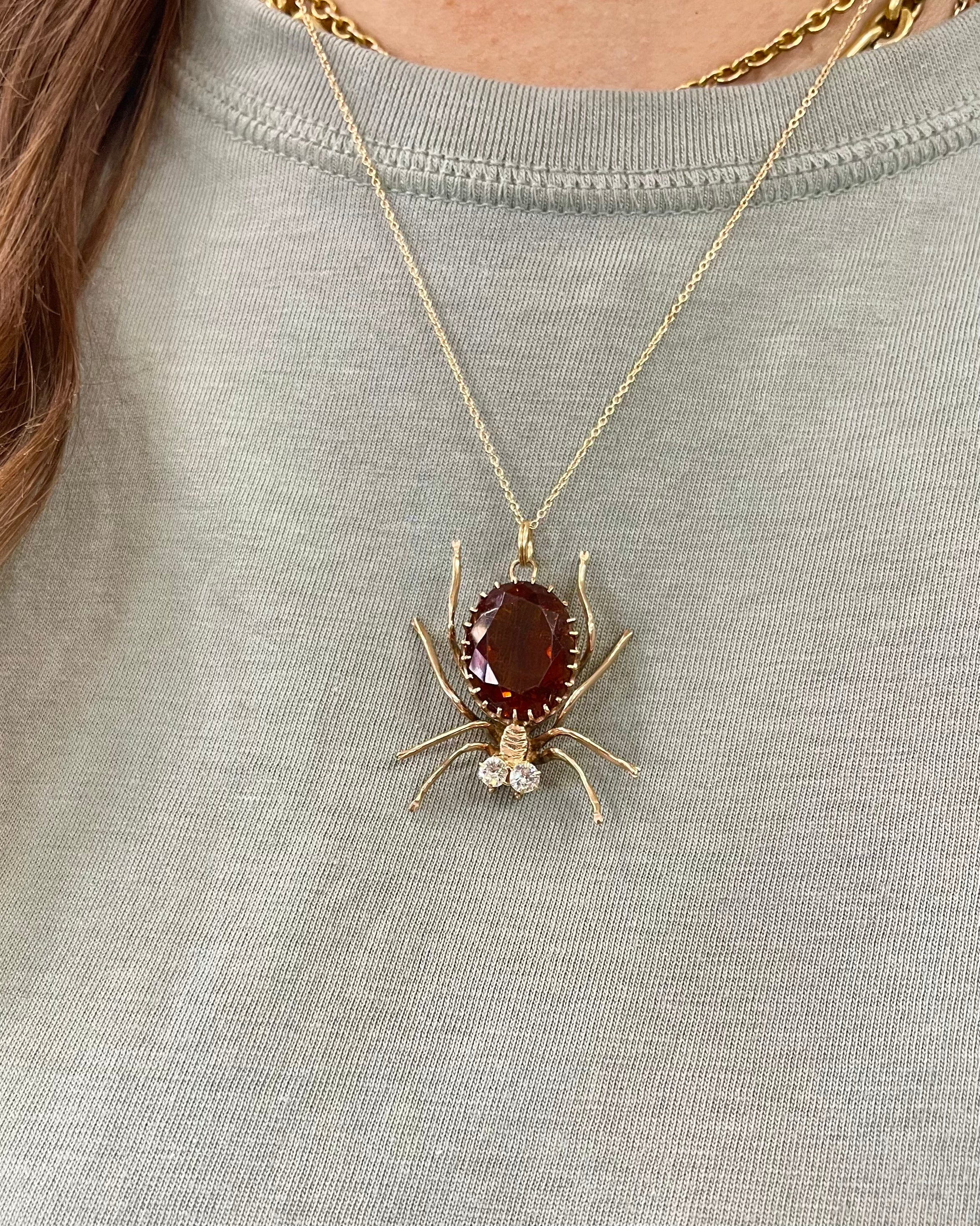 Retro 10.75 Ct. Citrine & Diamond Spider Pendant Necklace composed of 14k yellow gold, on a 14k yellow gold chain. With a central orangish-brown natural Oval Cut citrine that is estimated to weigh approximately 10.75 carats. There are 2 bright Old European Cut diamonds set as the spider's eyes, estimated to weigh approximately 0.30 carats in total. The spider pendant measures approximately 1 1/2" tall by 1.25" wide; weighs 7.2 grams. Circa 1940's.