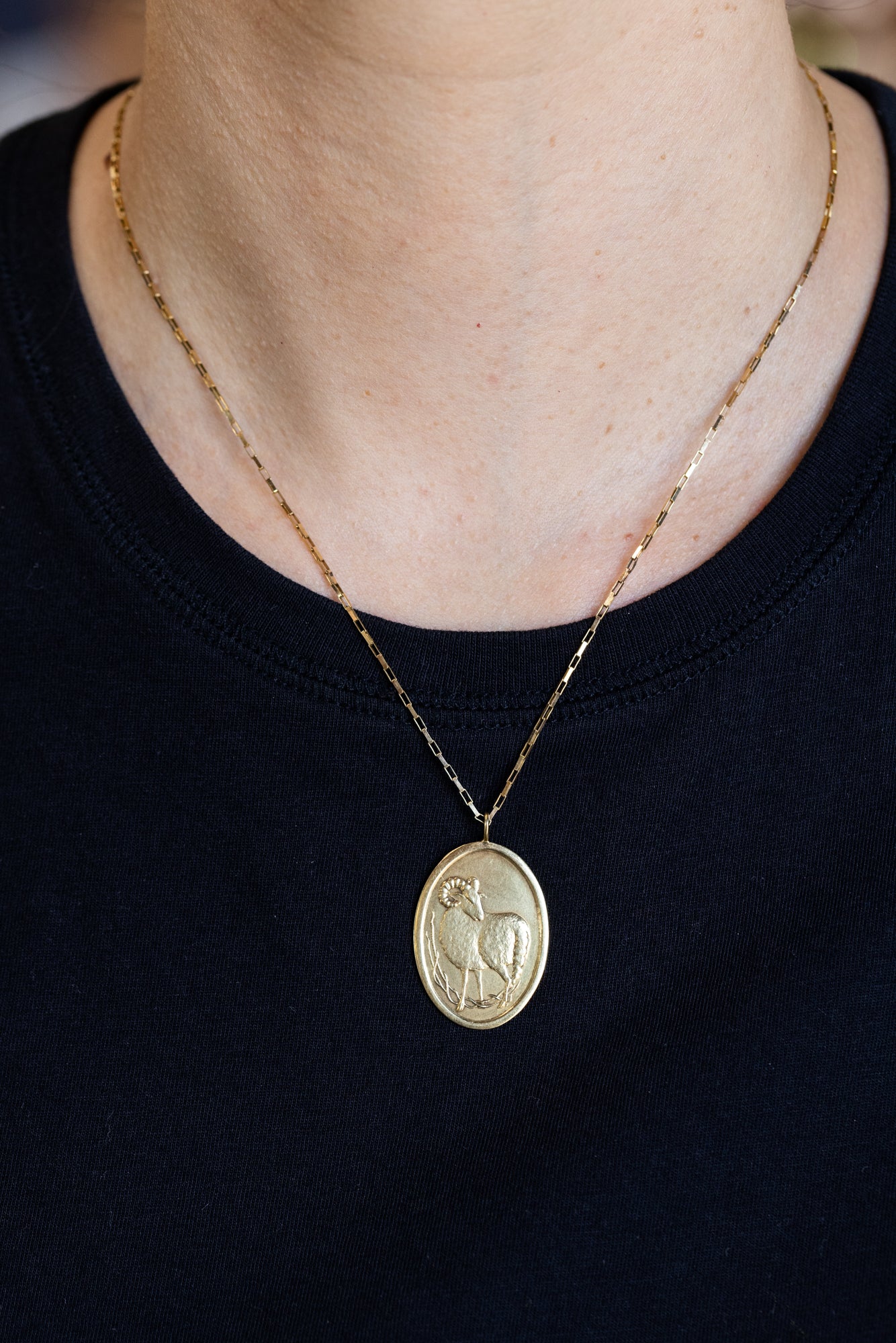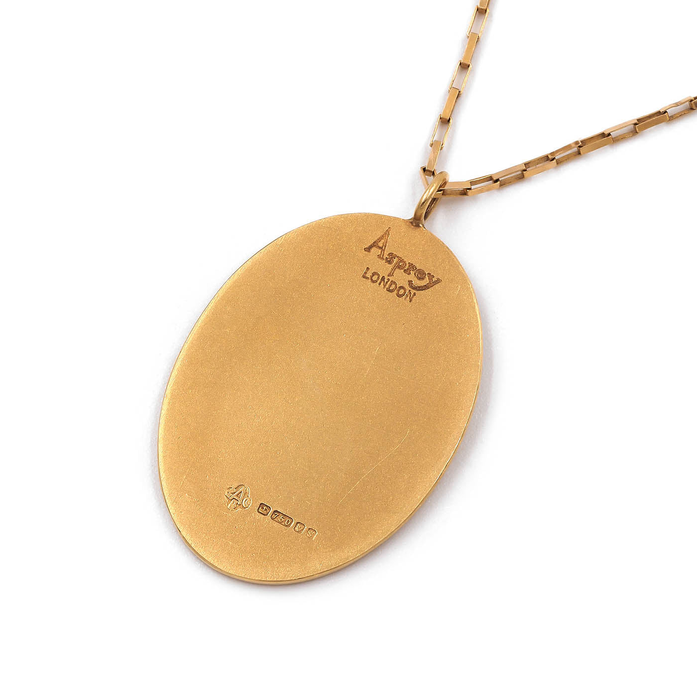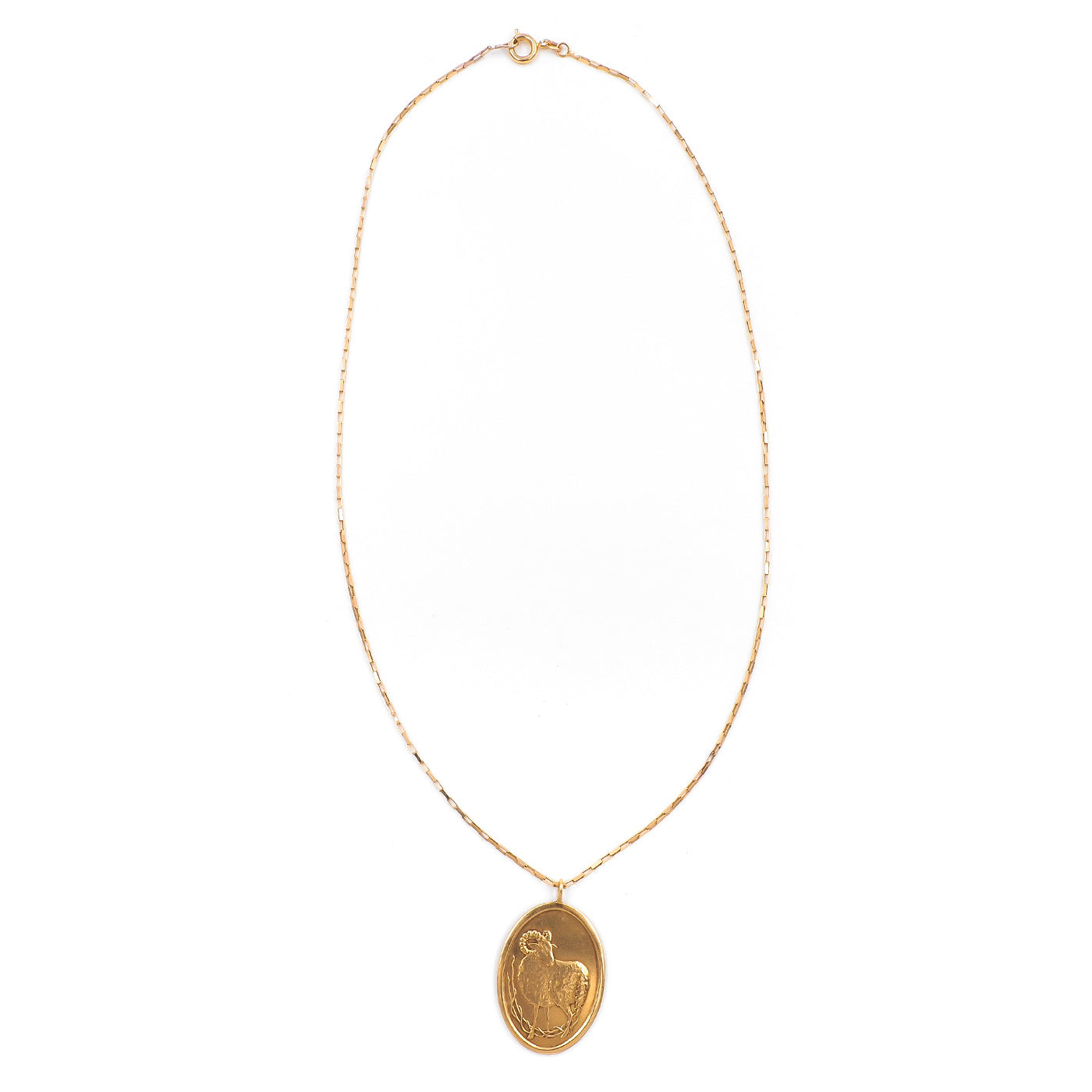 English Vintage 'Aries' Pendant Necklace by Asprey London, composed of 18k yellow gold on a 14k yellow gold chain. The oval-shaped gold pendant depicts a standing ram, representative of the Aries zodiac. The oval pendant measures approximately 1 1/4" tall by 7/8" wide; weighs 9.4 grams. Stamped for 'Asprey London'; hallmarked for English origin. Circa 1970's.