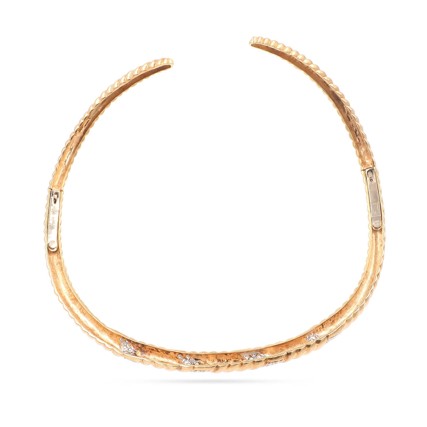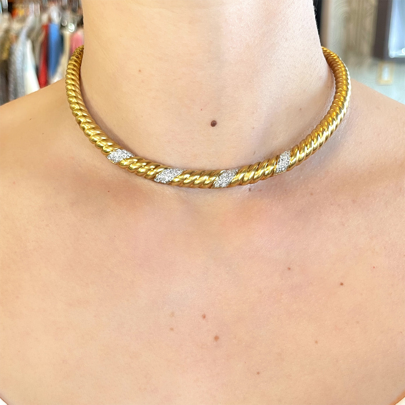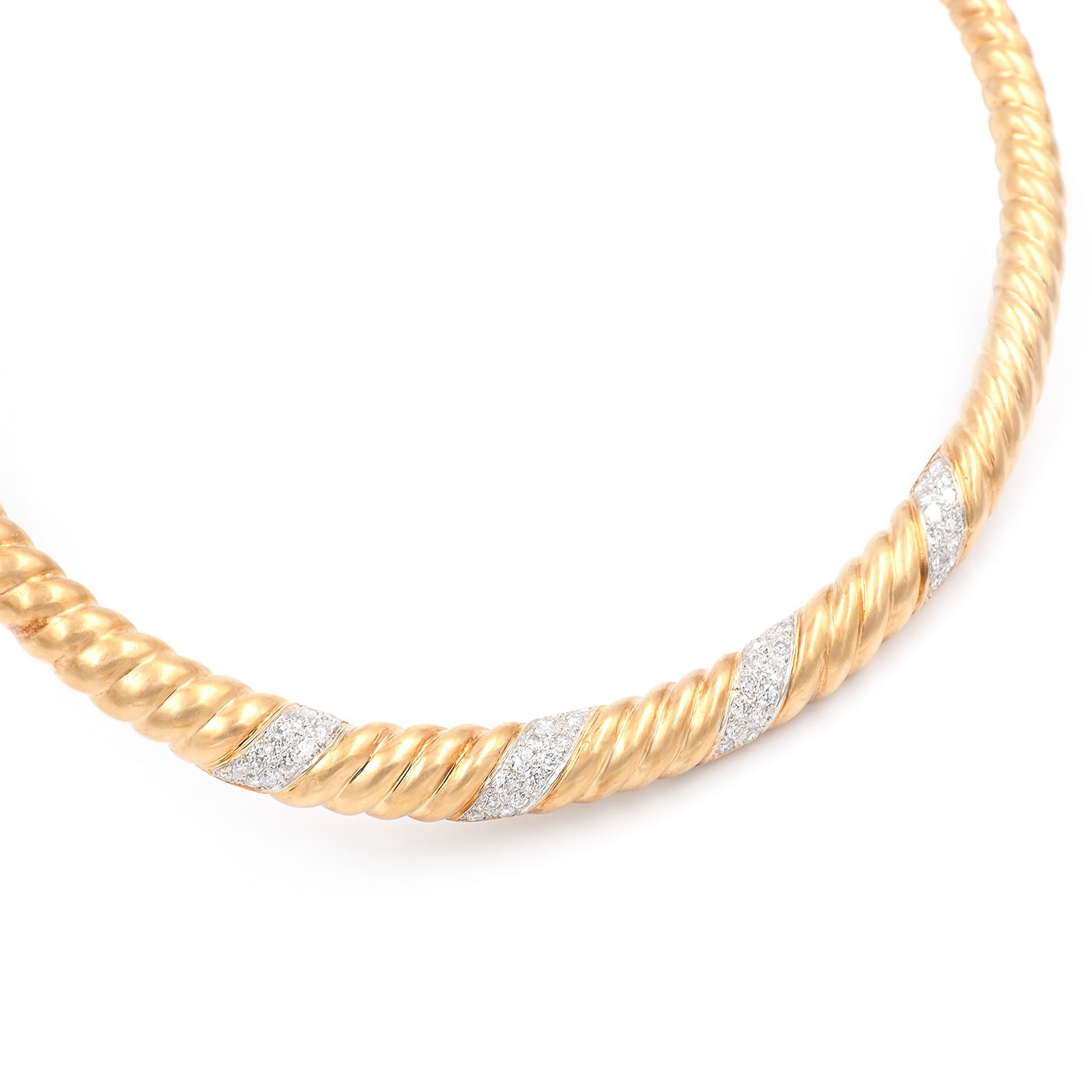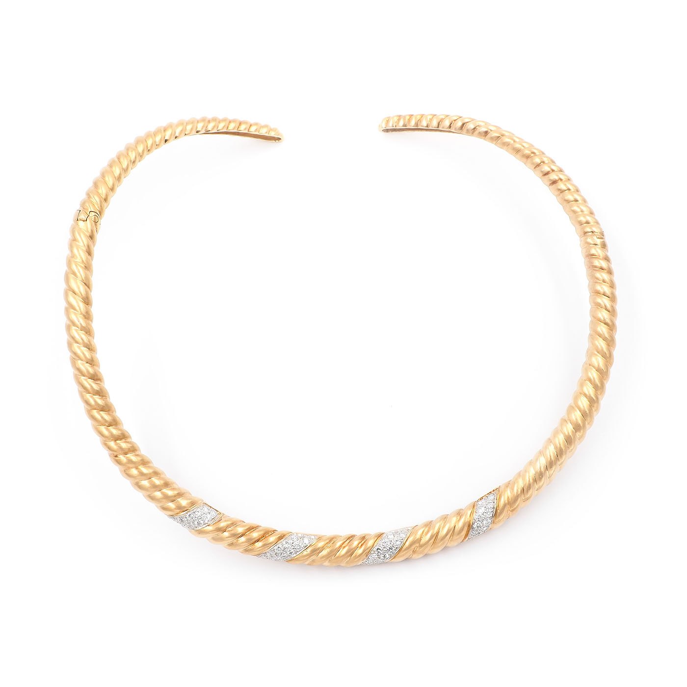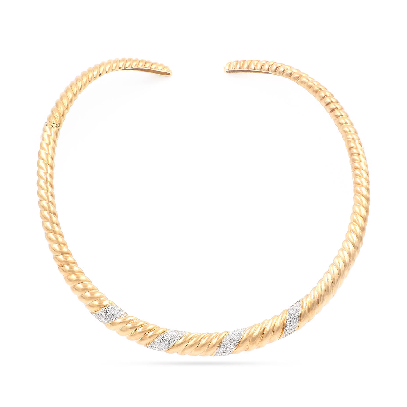 Italian Vintage Diamond Twist Gold Collar Necklace composed of 18k yellow gold. Set with 48 Round Brilliant Cut diamonds weighing approximately 1.00 carat in total; weighs 65 grams. With a slightly graduated design, measures approximately 8 mm wide at the front and 5.5 mm wide at the back. A portion of the back hinges up so the necklace can be put on and taken off. Fits like an approximately 15” long collar necklace. Stamped for Italian origin. Circa 1980’s.
