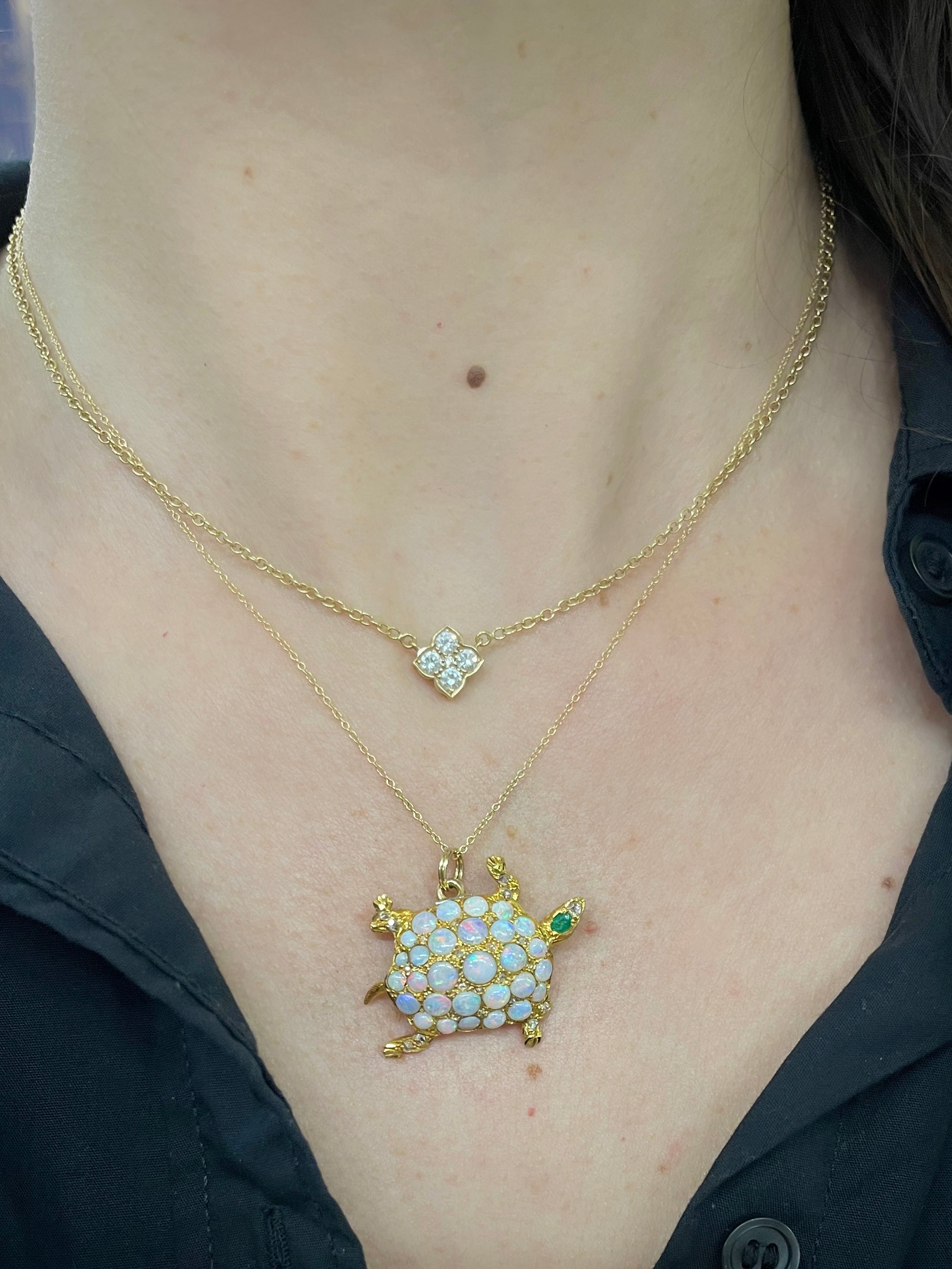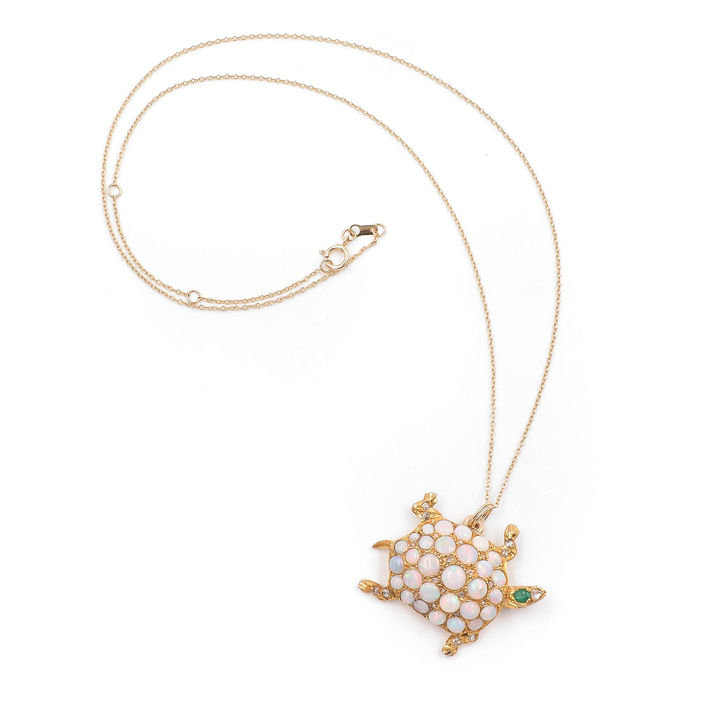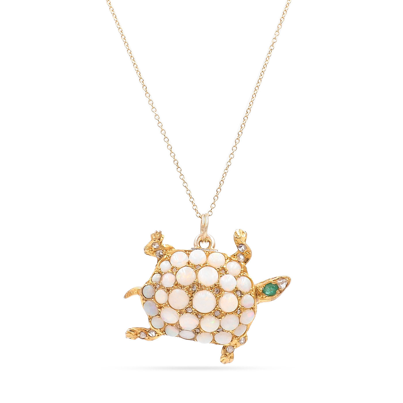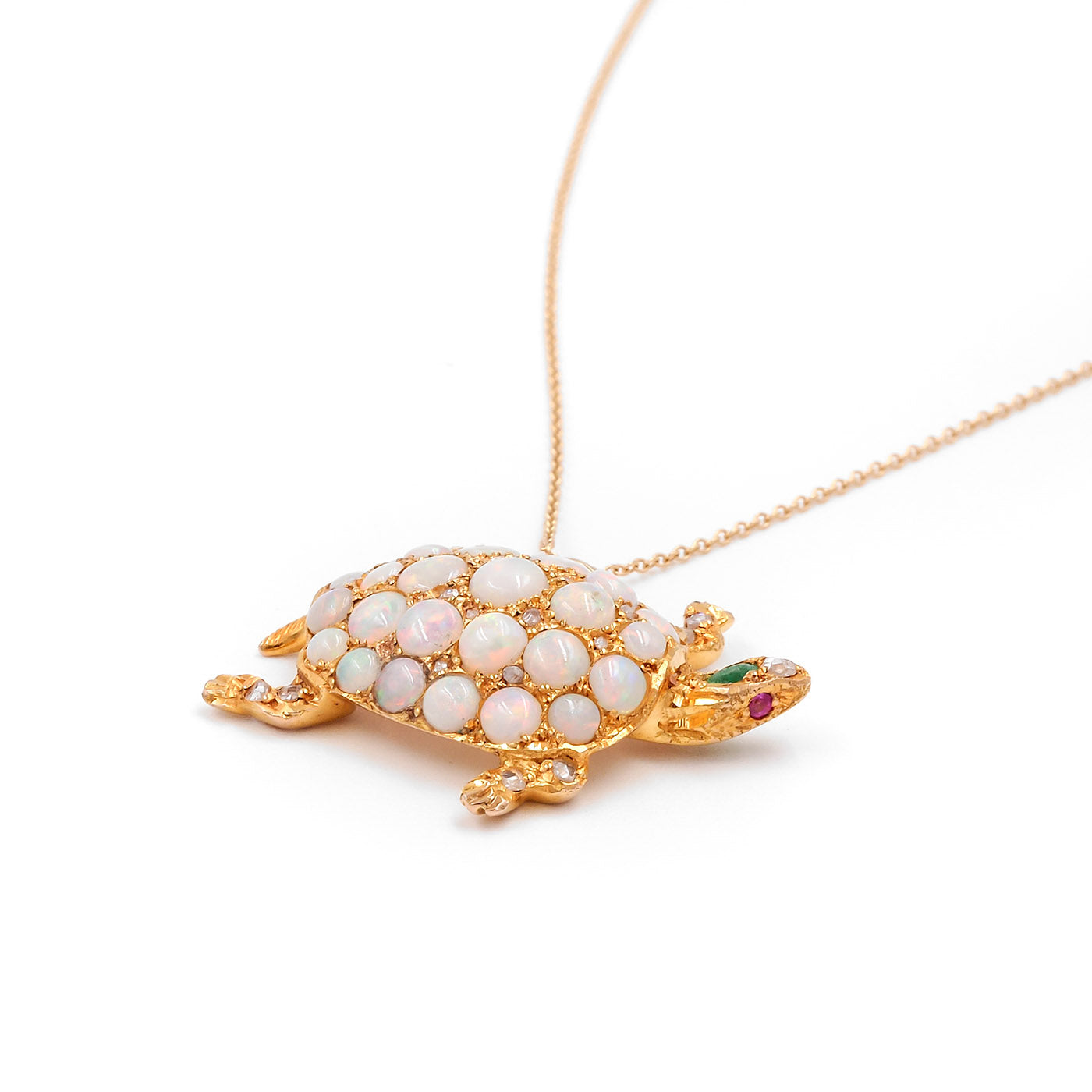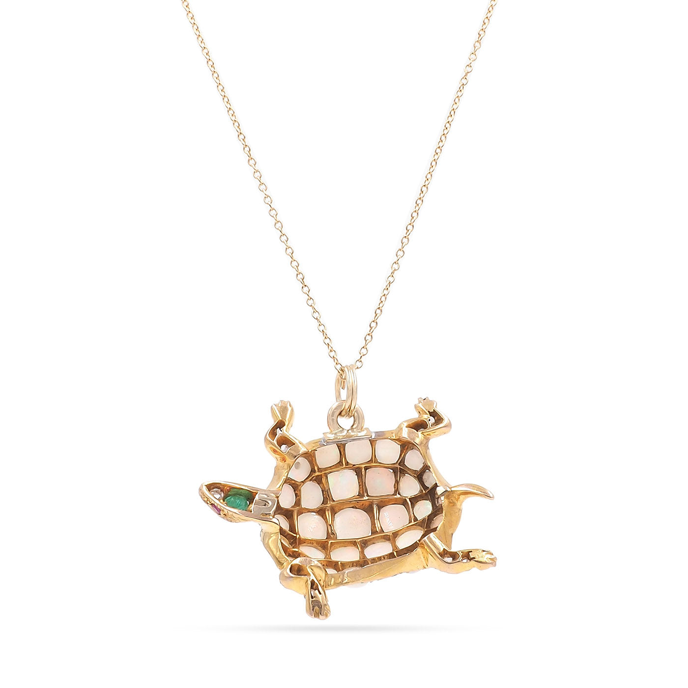 Early Victorian era Gemstone Turtle Pendant Necklace composed of 14k yellow gold, on an 18k yellow gold chain. With opals, as well as 22 Rose Cut diamonds weighing approximately 0.10 carats in total, 1 emerald weighing approximately 0.10 carats, and 2 rubies weighing approximately 0.02 carats in total. The turtle pendant measures approximately 1" tall by 1.25" wide; weighs 6.3 grams. Circa 1900.