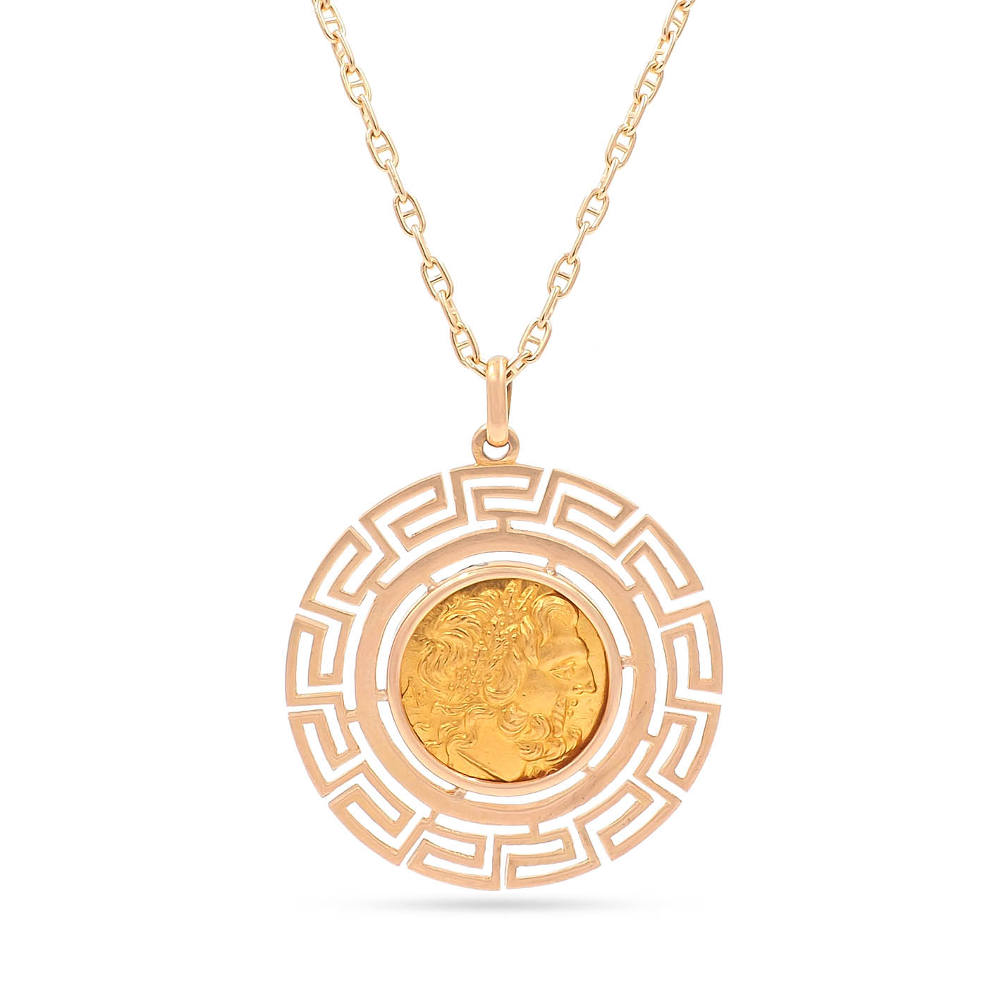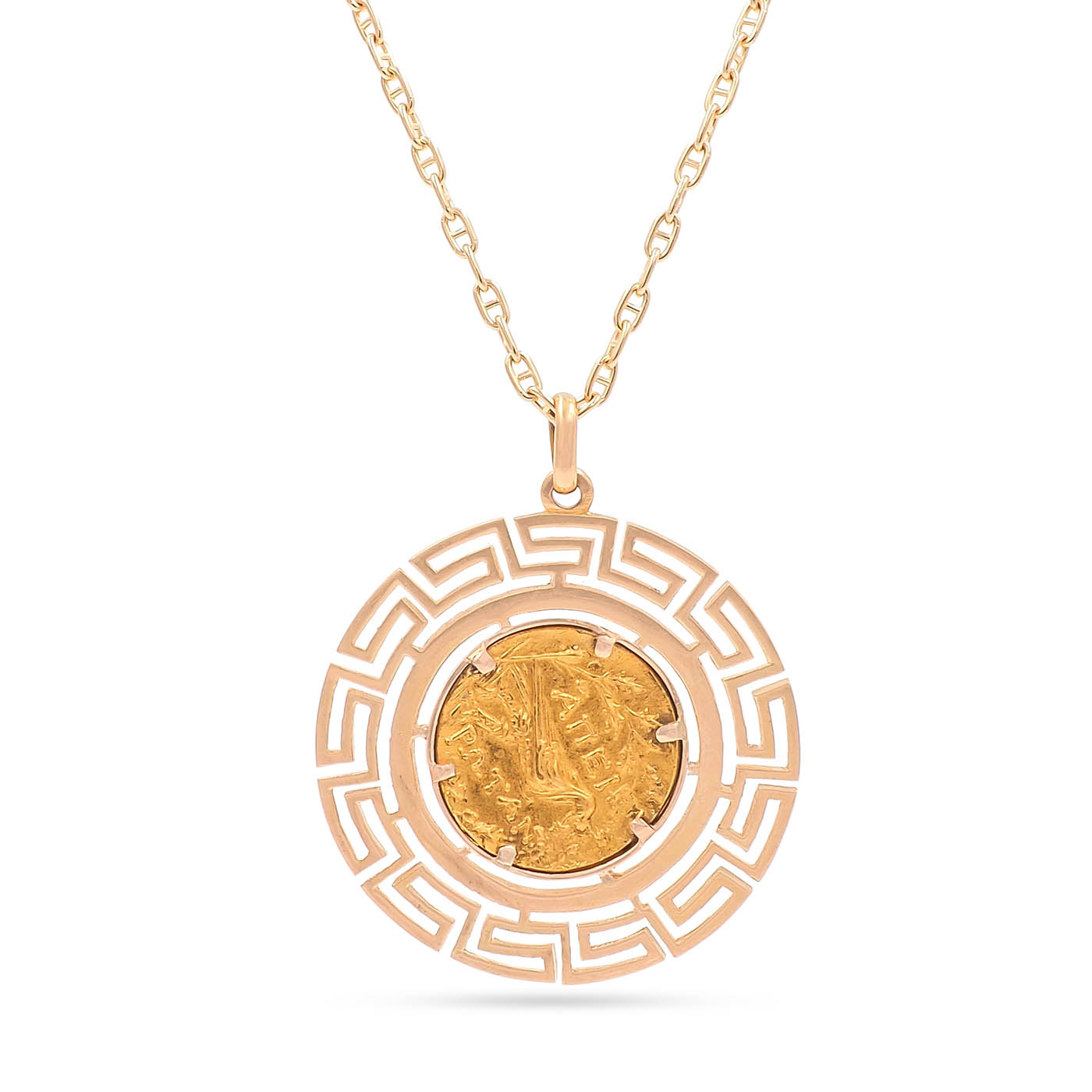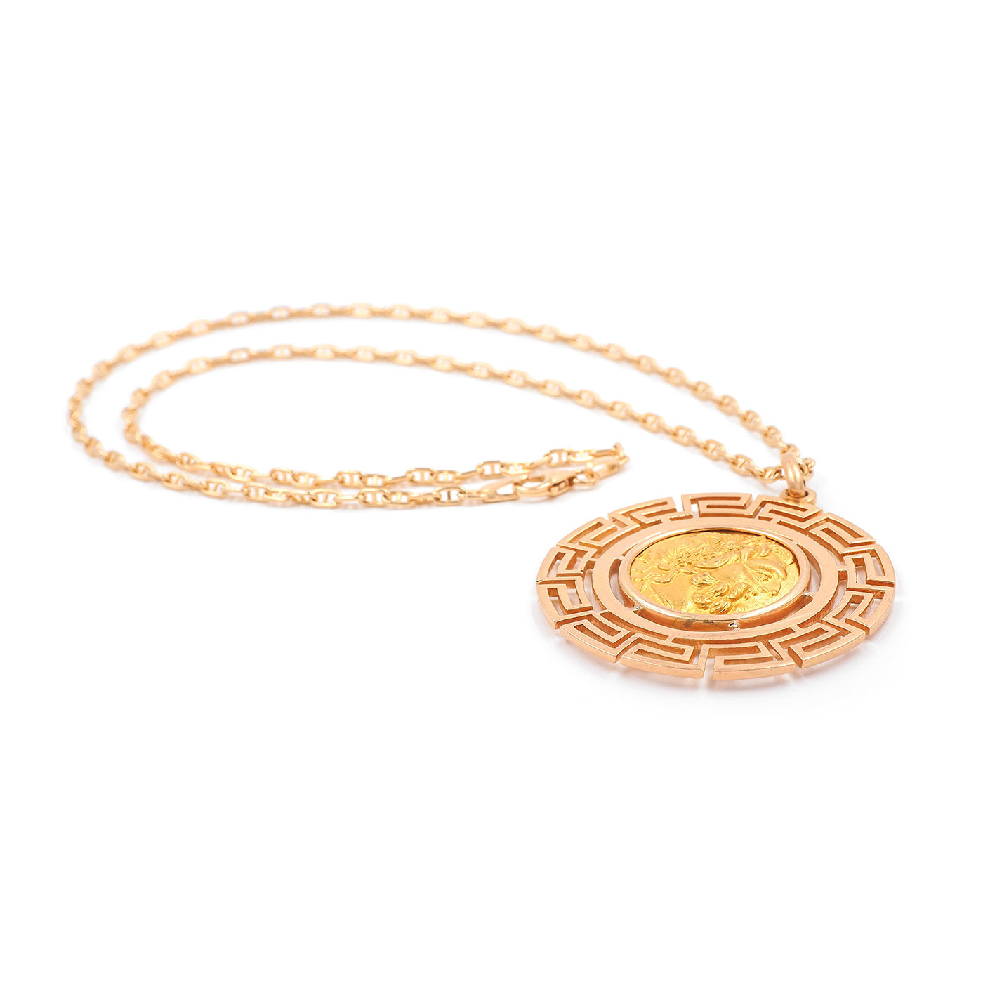 Vintage Greek Key Motif Coin Pendant Necklace, composed of a 22k yellow gold coin in an 18k yellow gold setting upon an 18k yellow gold chain. The pendant features a double-sided Greek coin set within a round setting that has a Greek Key motif. The front of the coin is depicting a man’s side profile and the back depicting a standing bird figure. The pendant measures approximately 1 1/2″ in diameter; weighs 10.1 grams. The Greek Key motif setting is circa 1960’s.