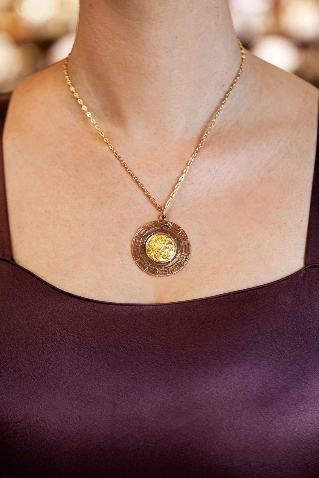 Vintage Greek Key Motif Coin Pendant Necklace