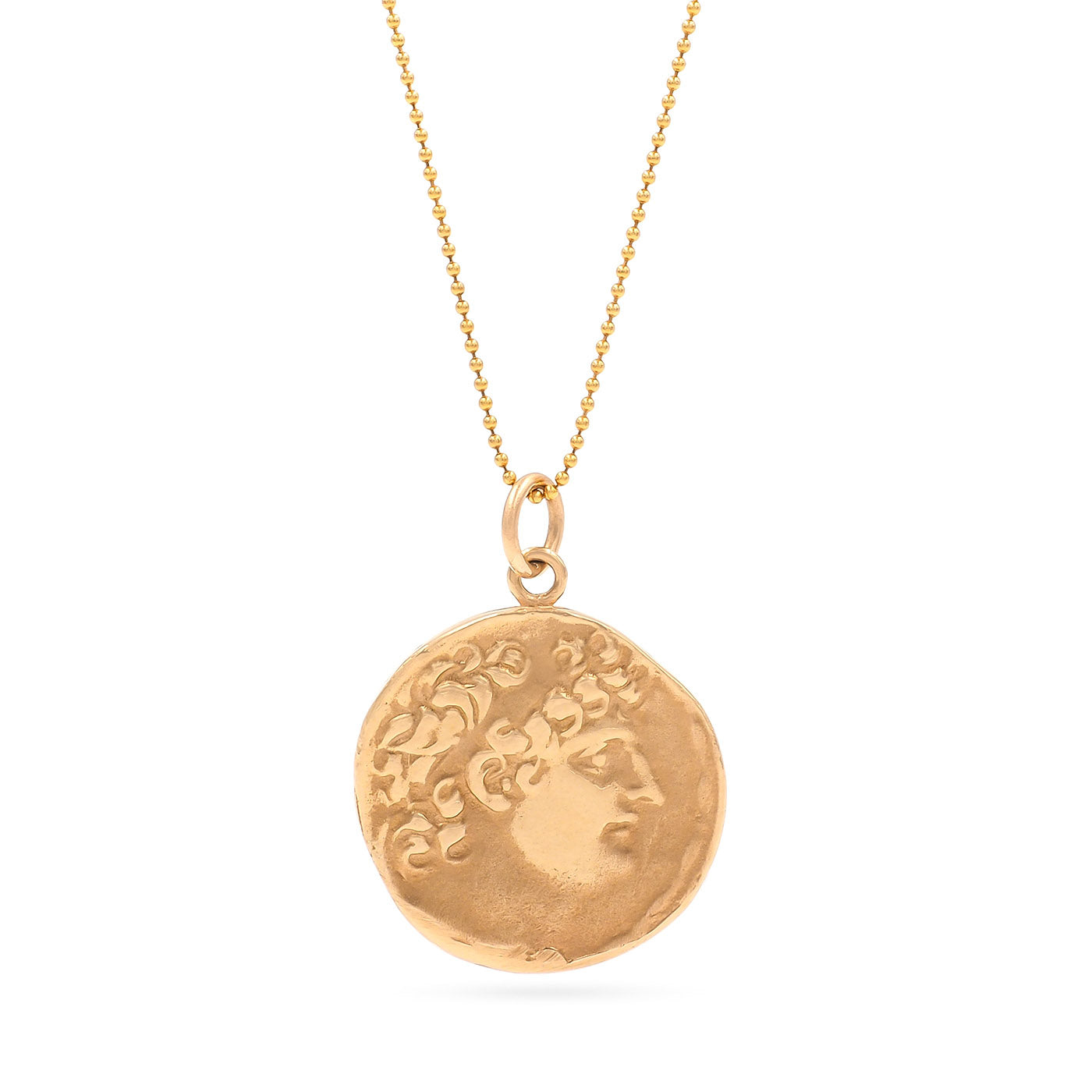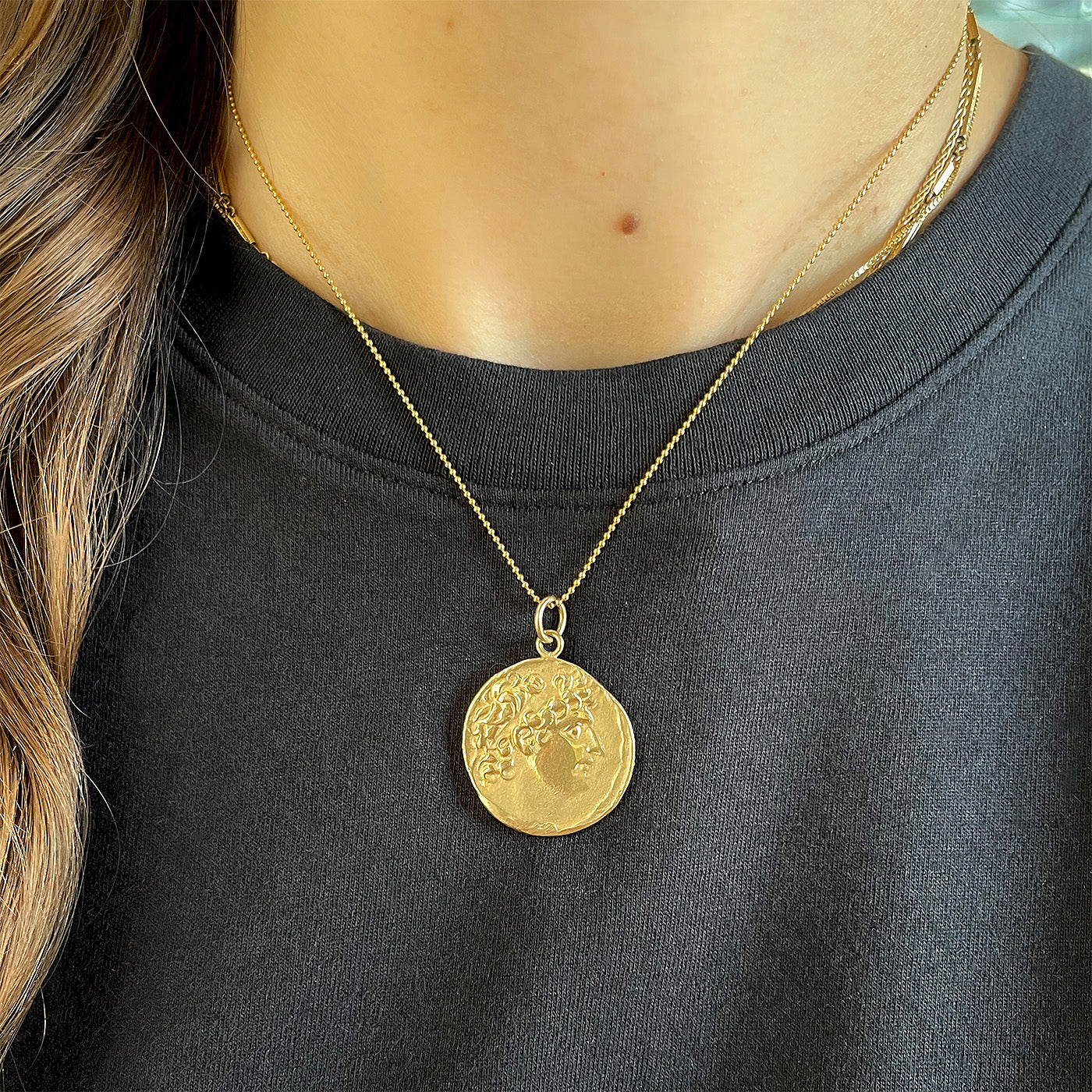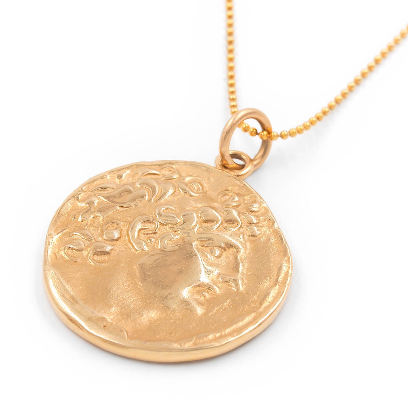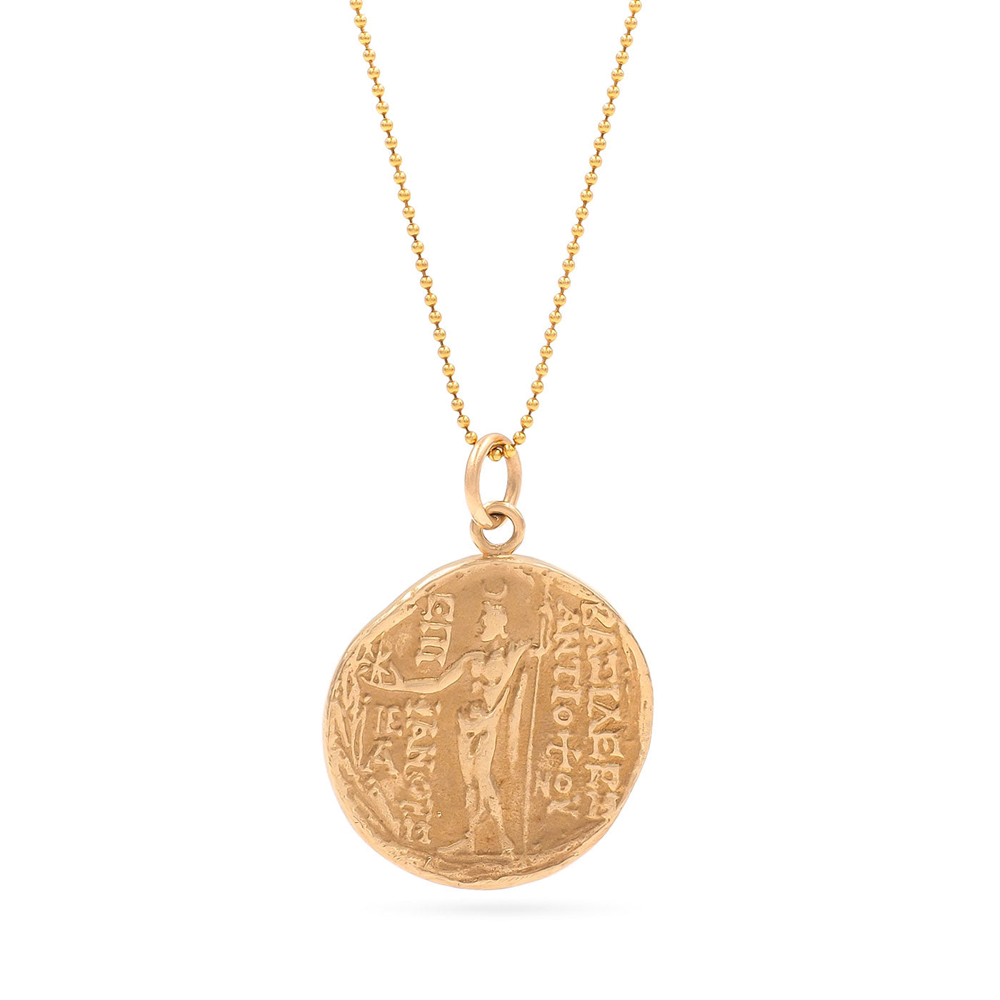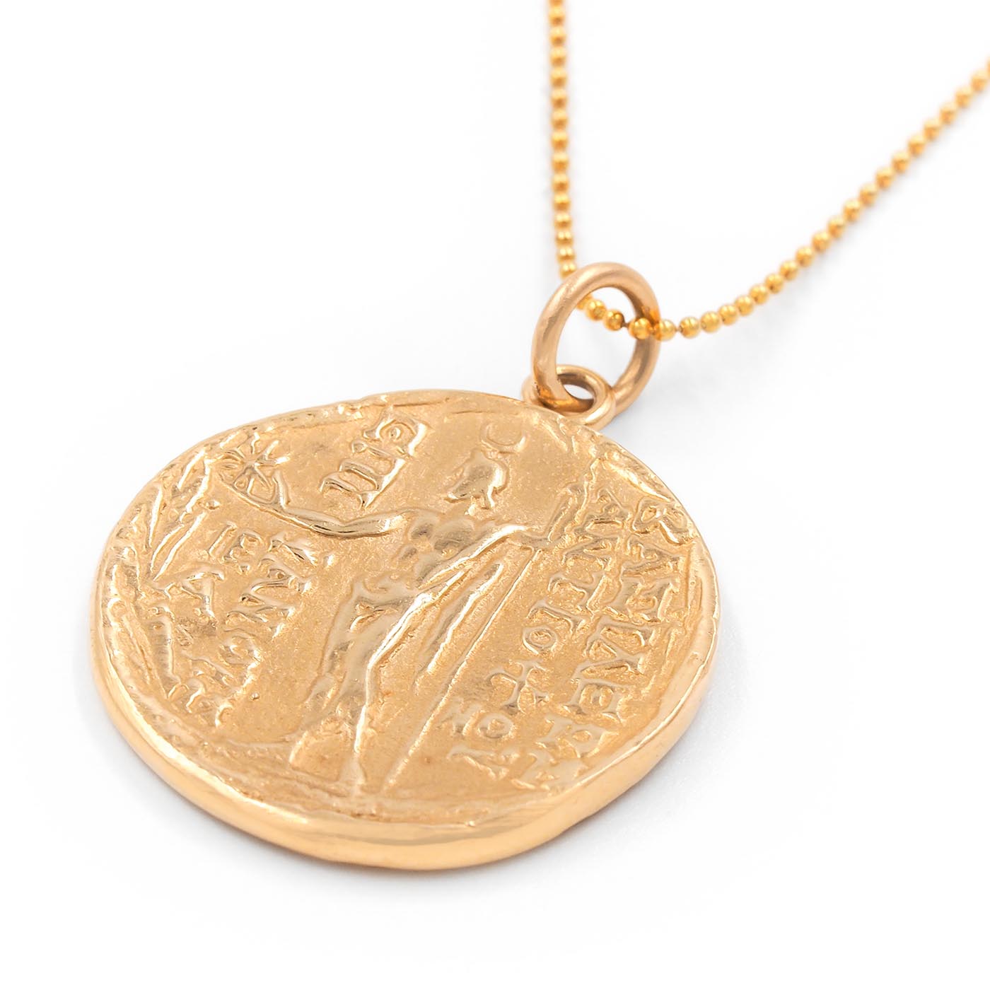 Vintage Greek Style Coin Pendant Necklace, composed of 14k yellow gold on a 14k yellow gold chain. The pendant is a reproduction modeled after an ancient Greek coin, with the front featuring a man’s side profile and the back featuring a standing figure. The pendant measures approximately 25 mm in diameter; weighs 10.8 grams. Circa 1990’s.