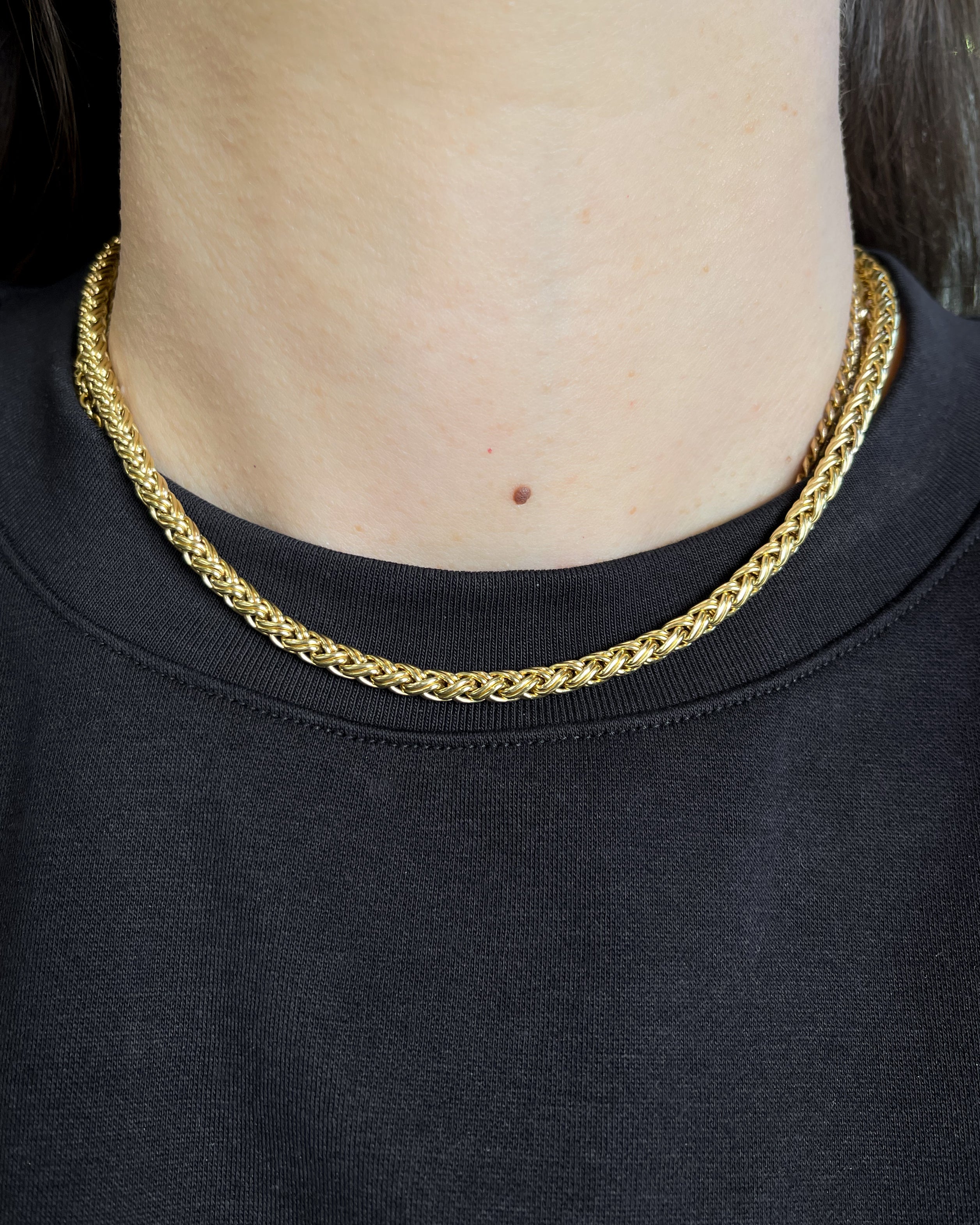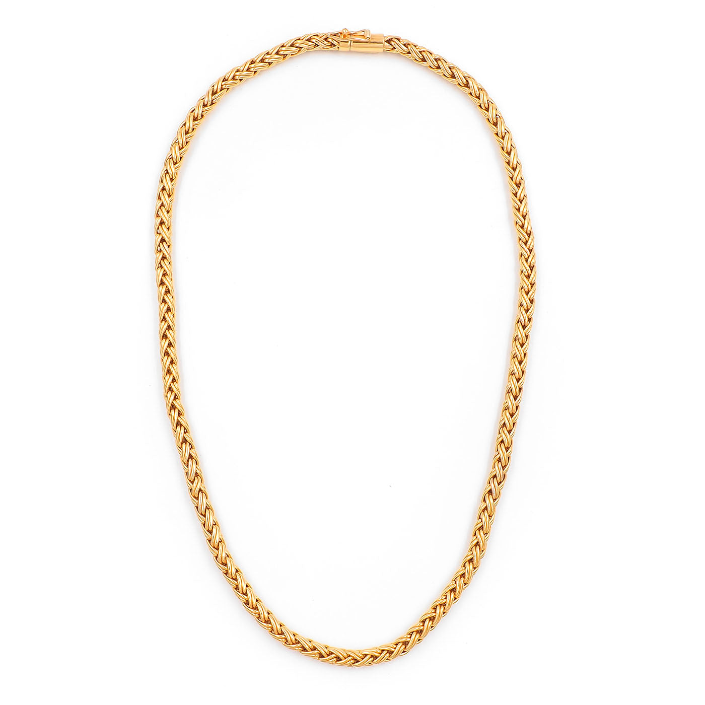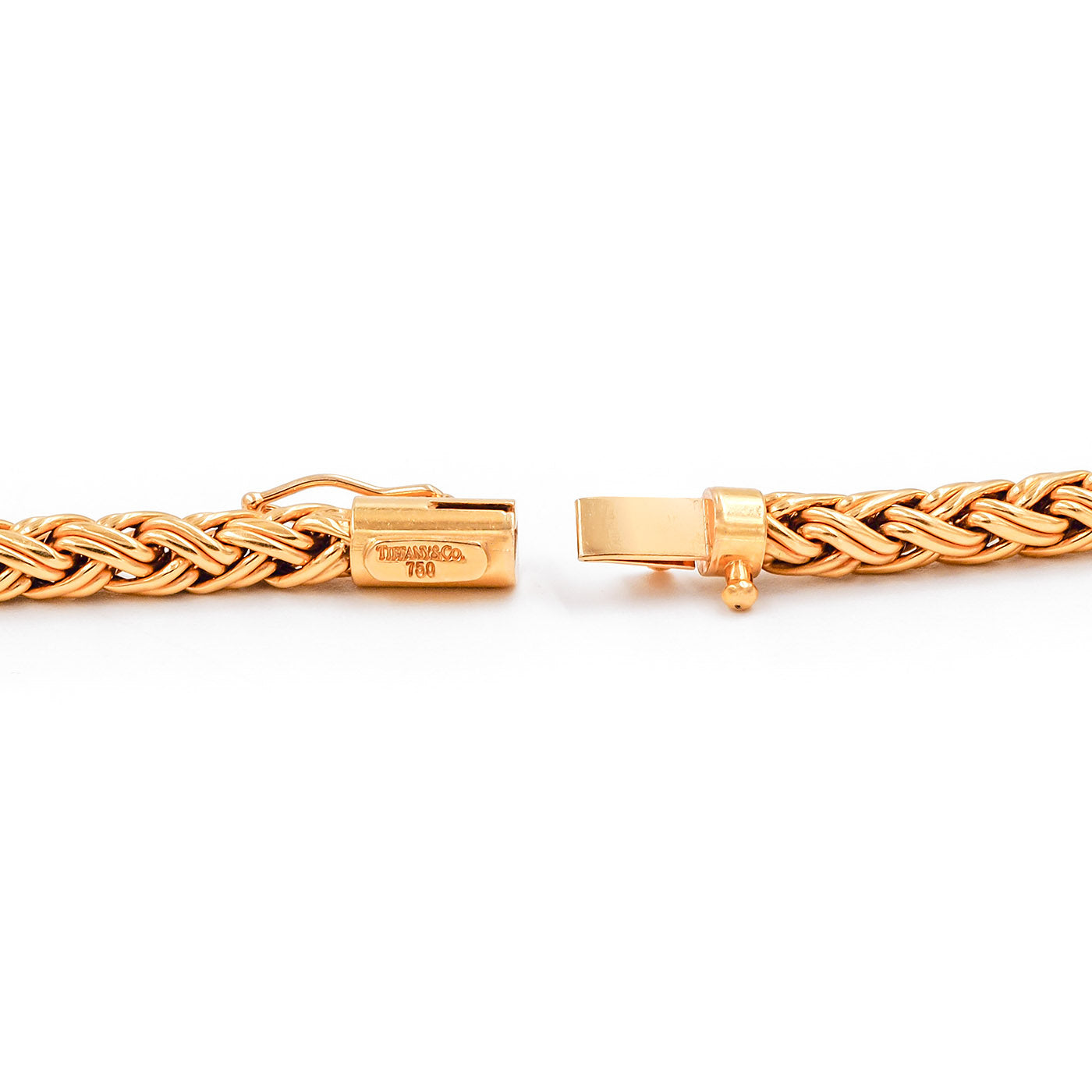 American Vintage Woven Gold Chain Necklace by Tiffany & Co., composed of 18k yellow gold. The style of the chain is reminiscent of a woven gold braid. The necklace measures approximately 16″ long and 4.3 mm wide, weighs 27.5 grams; with a clasp and latch. Circa 1980’s.