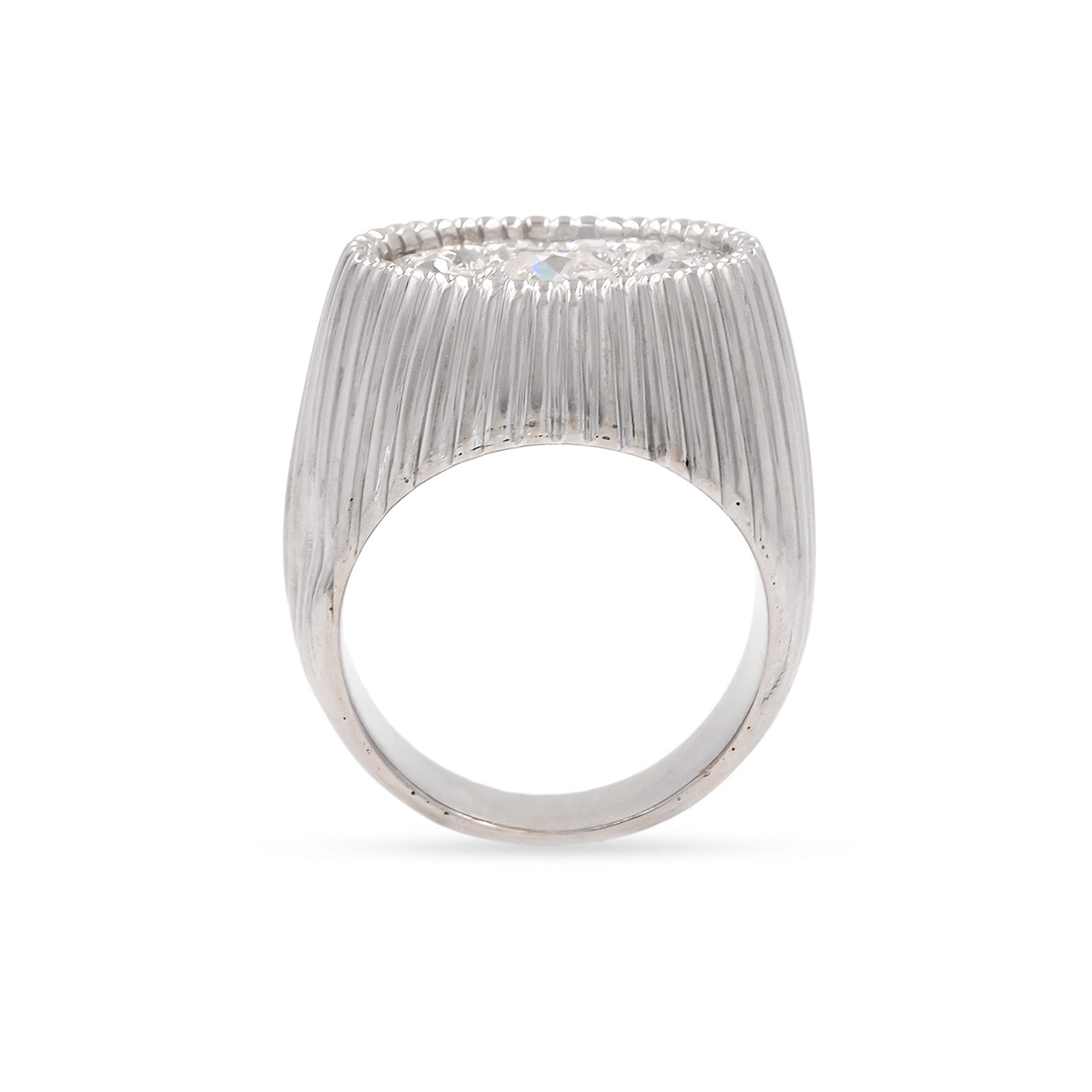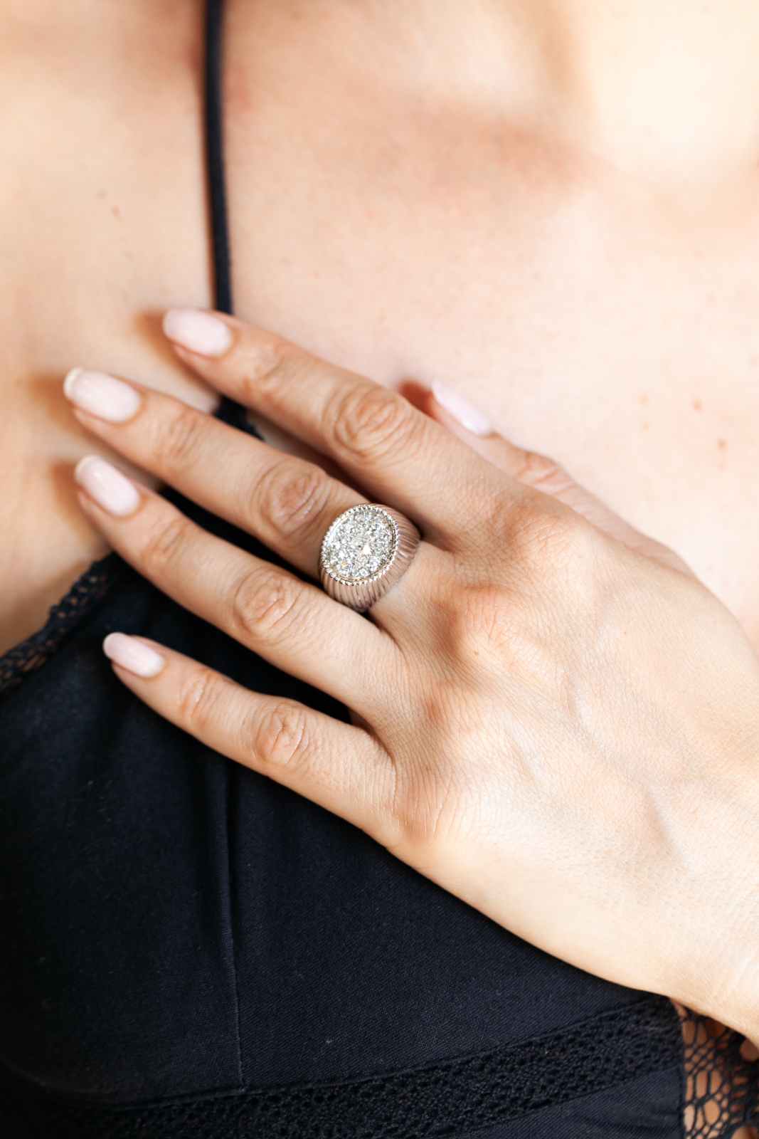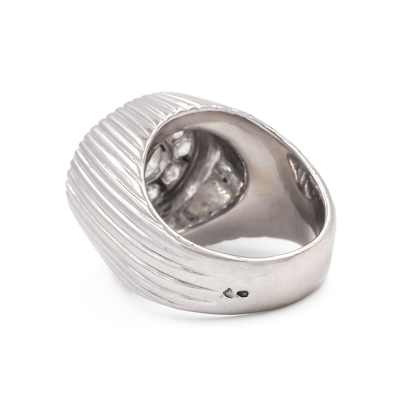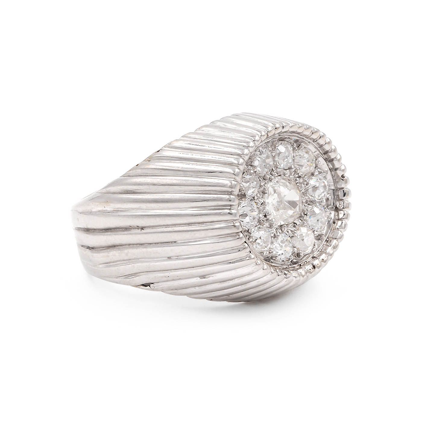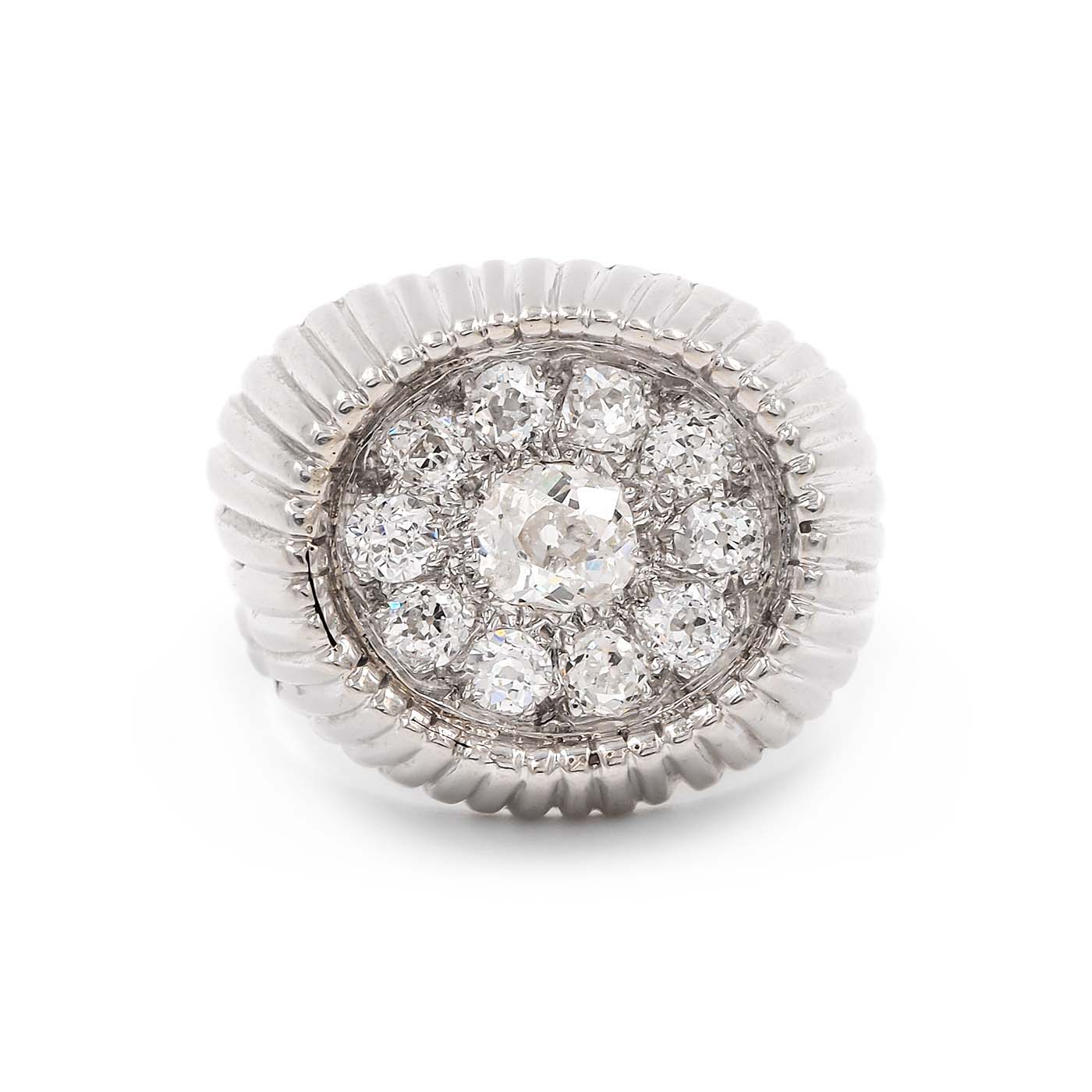 French Retro 1.45 Ctw. Old Mine Cut Diamond Oval Cluster Cocktail Ring composed of 18k white gold and platinum. With a central Old Mine Cut diamond that is estimated to be 0.45 carats, surrounded by an additional 10 Old Mine Cut diamonds estimated to weigh approximately 1.00 carat in total. The diamonds are set into a platinum top that is surrounded and held by the 18k white gold setting with vertical groove details. The front of the ring measures approximately 18.2 mm tall by 18.8 mm wide and sits 6.4 mm off of the finger; weighs 15.8 grams. Hallmarked for French origin. With a small dent to one of the ring’s shoulders, consistent with normal wear of vintage jewelry. Circa 1940-1950.