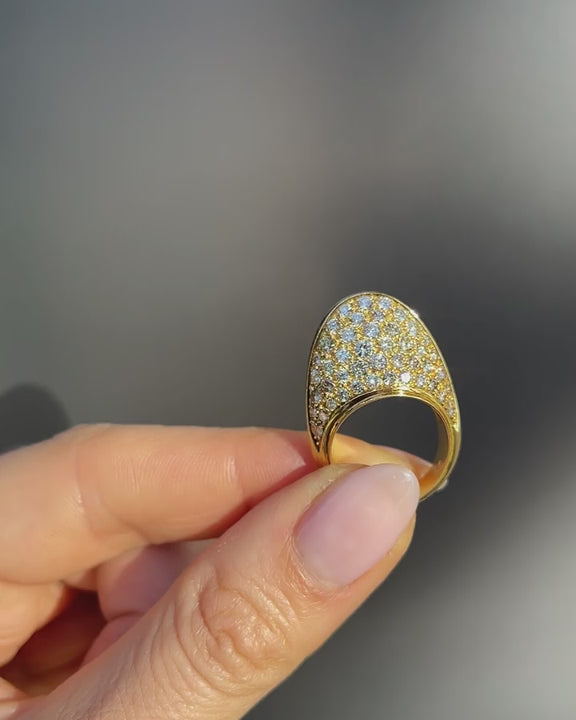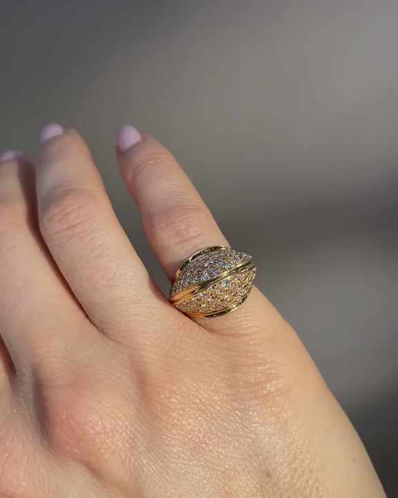 Vintage 2.50 Ctw. Round Brilliant Cut Diamond High Dome Ring composed of 18k yellow gold. With 90 Round Brilliant Cut diamonds set into the 2 sides of the ring that weigh approximately 2.50 carats in total, with colors estimated to range J-K-L and clarities estimated to be VS1. The diamonds are pavé-set flush into the highly domed top of the ring; the ring sits approximately 14.3 mm tall off the finger. The ring weighs 10.07 grams. Circa 1970's.