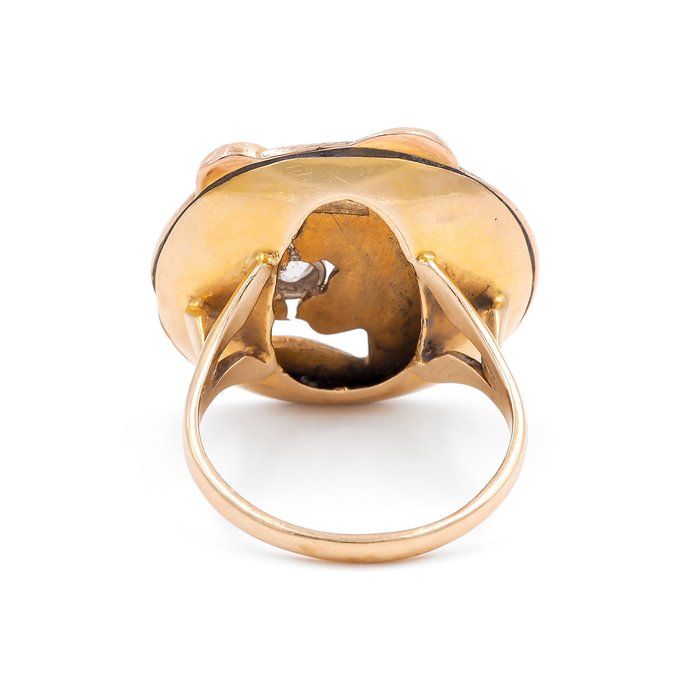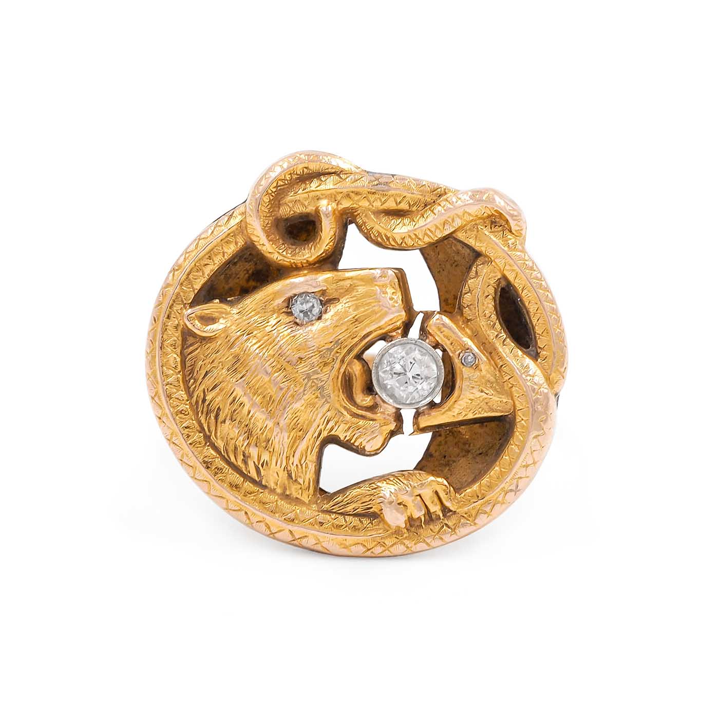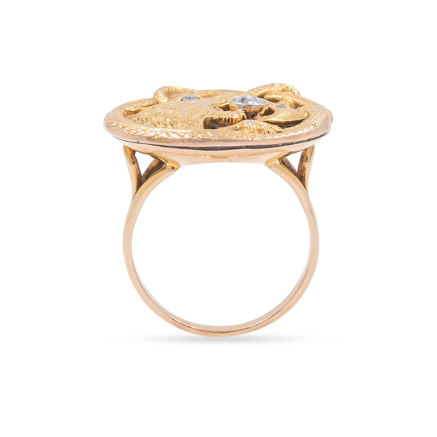 Art Nouveau era Panther & Snake Diamond Ring composed of 14k yellow gold. Featuring an ornate depiction of a panther and snake holding a diamond between them, 1 bezel-set Old European Cut diamond estimated to weigh approximately 0.28 carats. The panther and snake are both intricately detailed and lifelike. The front of the ring measures approximately 24.9 mm tall by 25.2 mm wide; the ring weighs 6.7 grams. This ring was likely converted from a brooch. Circa 1905.