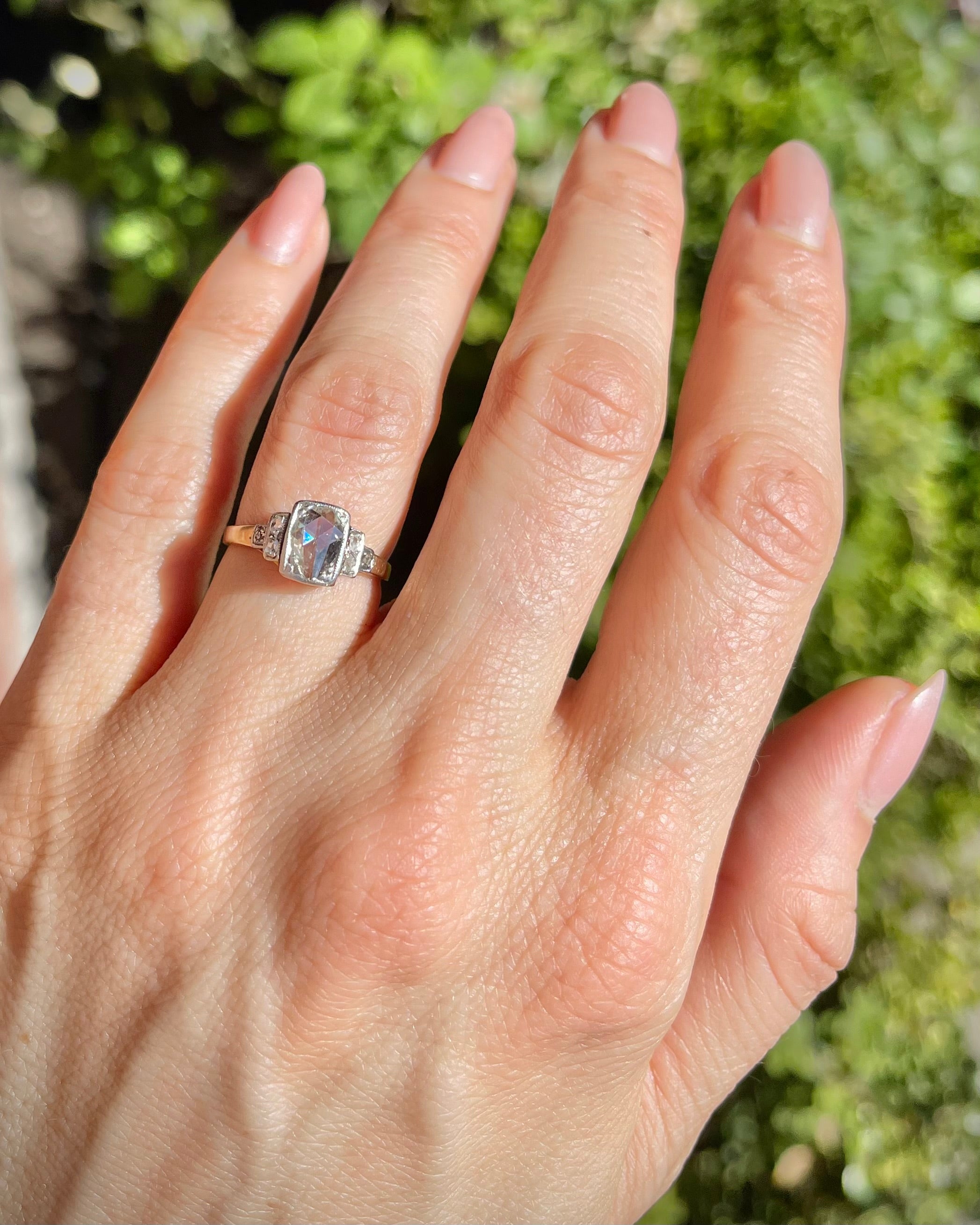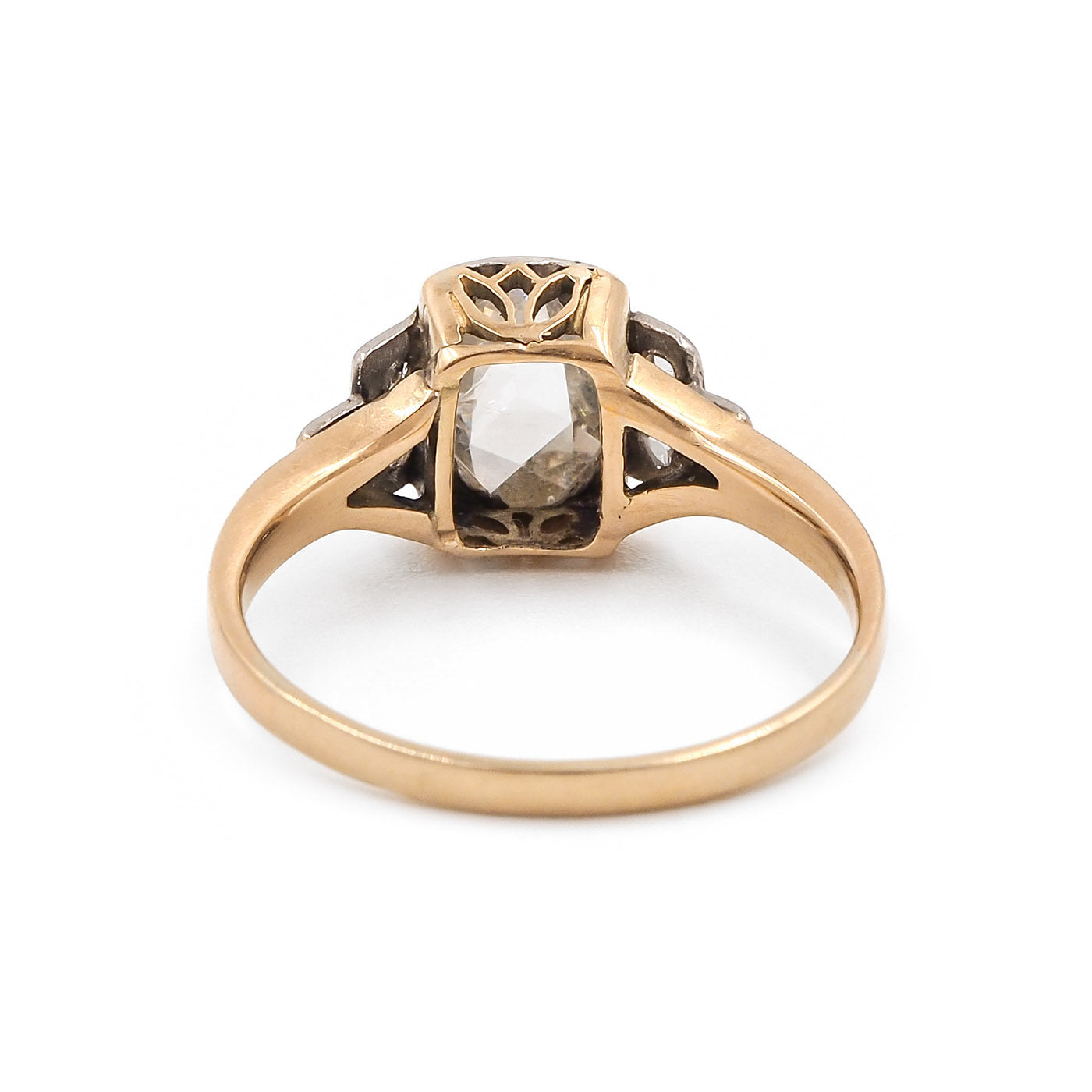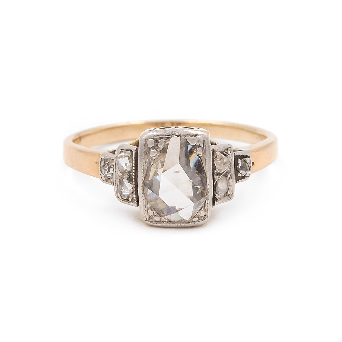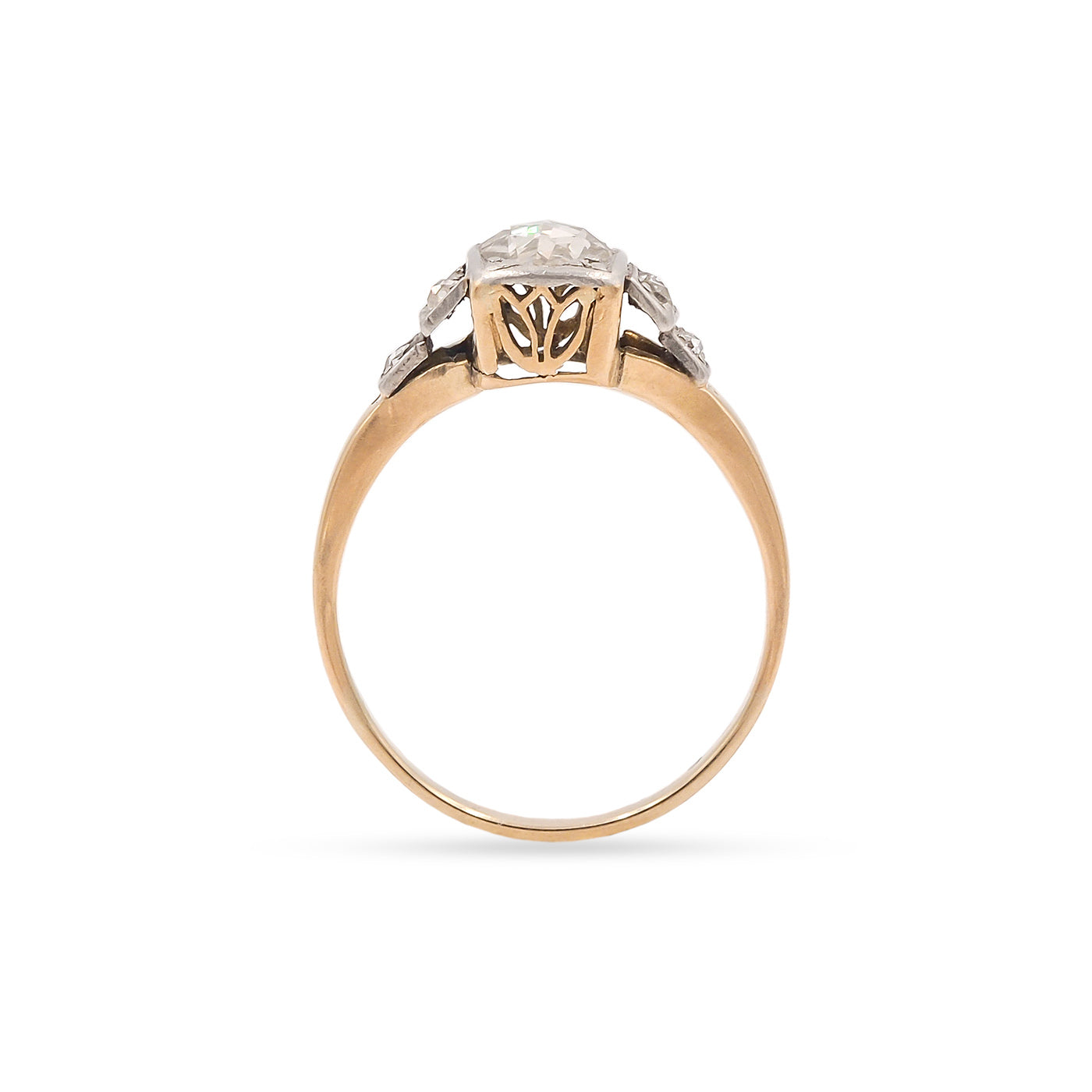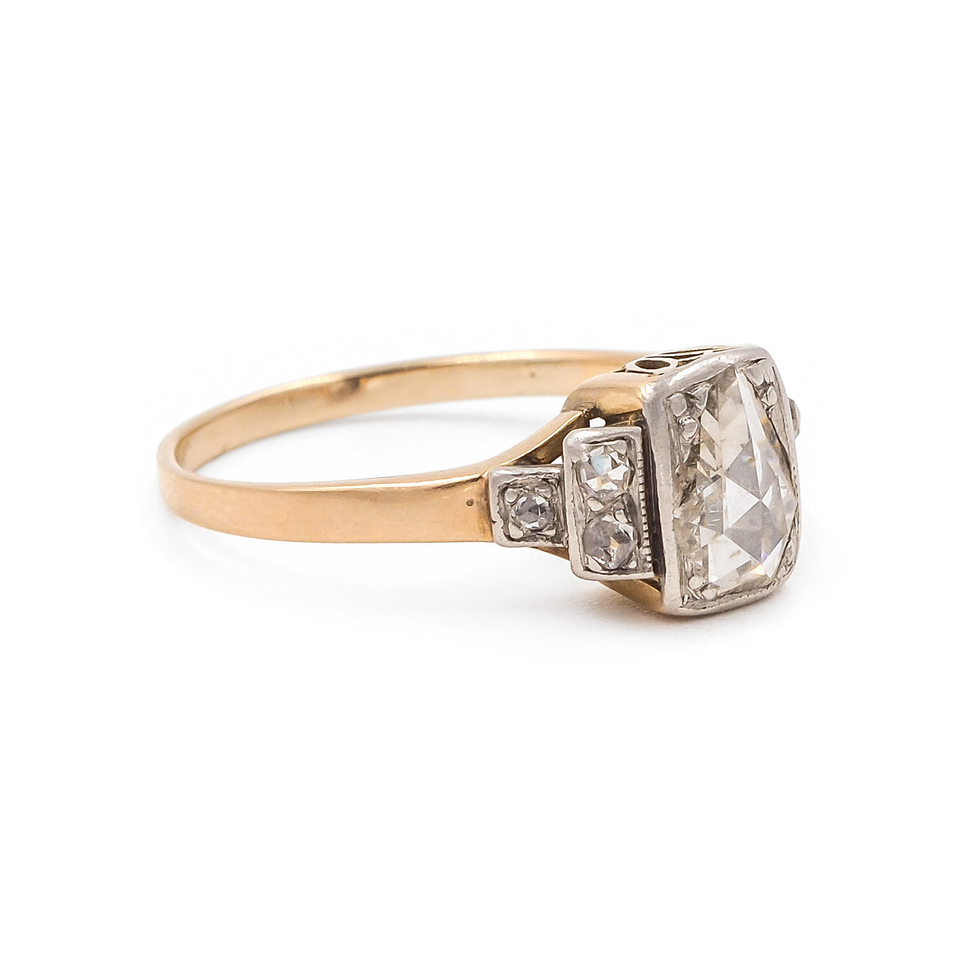 Art Deco era 0.40 Ct. Pear-Shaped Rose Cut Diamond Engagement Ring composed of platinum and 14k yellow gold. With a 0.40 carat pear-shaped Rose Cut diamond at the center. With an additional 6 Rose Cut diamonds, weighing approximately 0.05 carats in total. The diamonds are set within the platinum mounting, upon a 14k yellow gold basket and shank. Circa 1920.