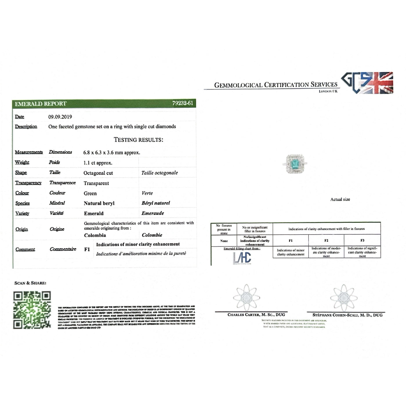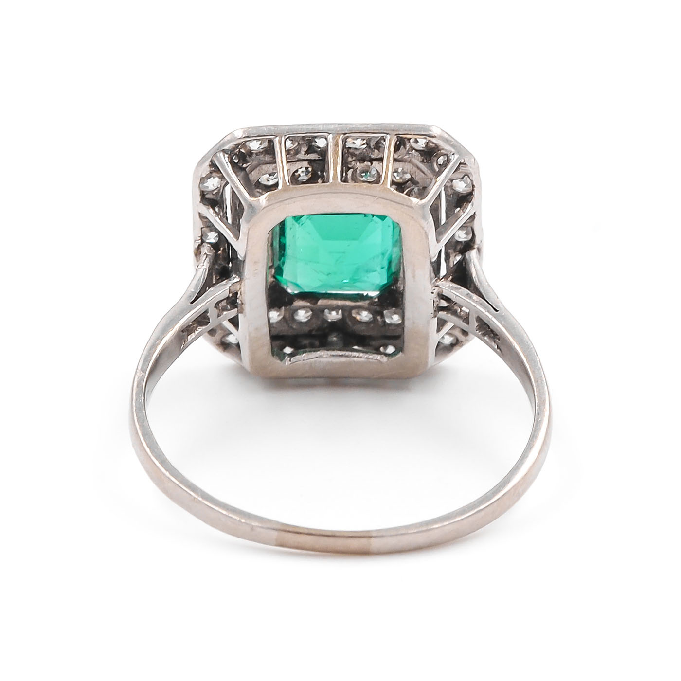 Art Deco era 1.10 carat Emerald & 0.54 Ctw. Old Single Cut Diamond Square Dinner Ring composed of platinum. Featuring a 1.10 carat Step Cut emerald at the center, GCS certified to have Colombian origin with Minor Oil Treatment. The emerald is framed by two rows of Old Single Cut diamonds (with diamonds accenting the shoulders as well), weighing approximately 0.54 carats in total. The ring has a square shape with angled corners, fine milgrain throughout, and linear cutouts. The setting measures approximately 14.1 mm tall by 13.5 mm wide at the front. Circa 1920.