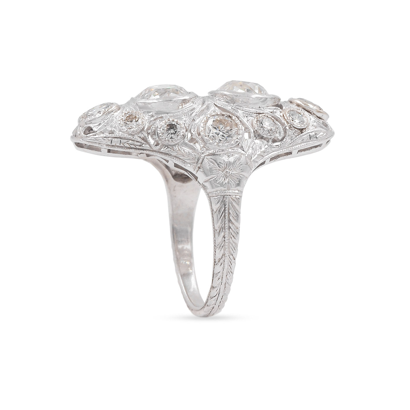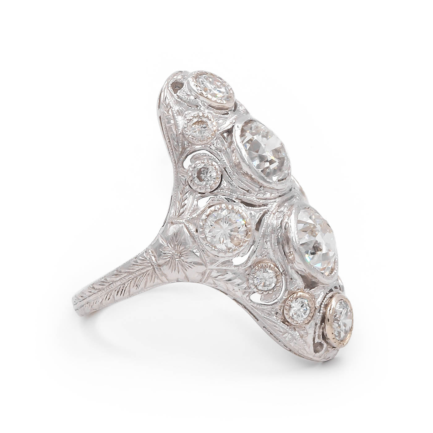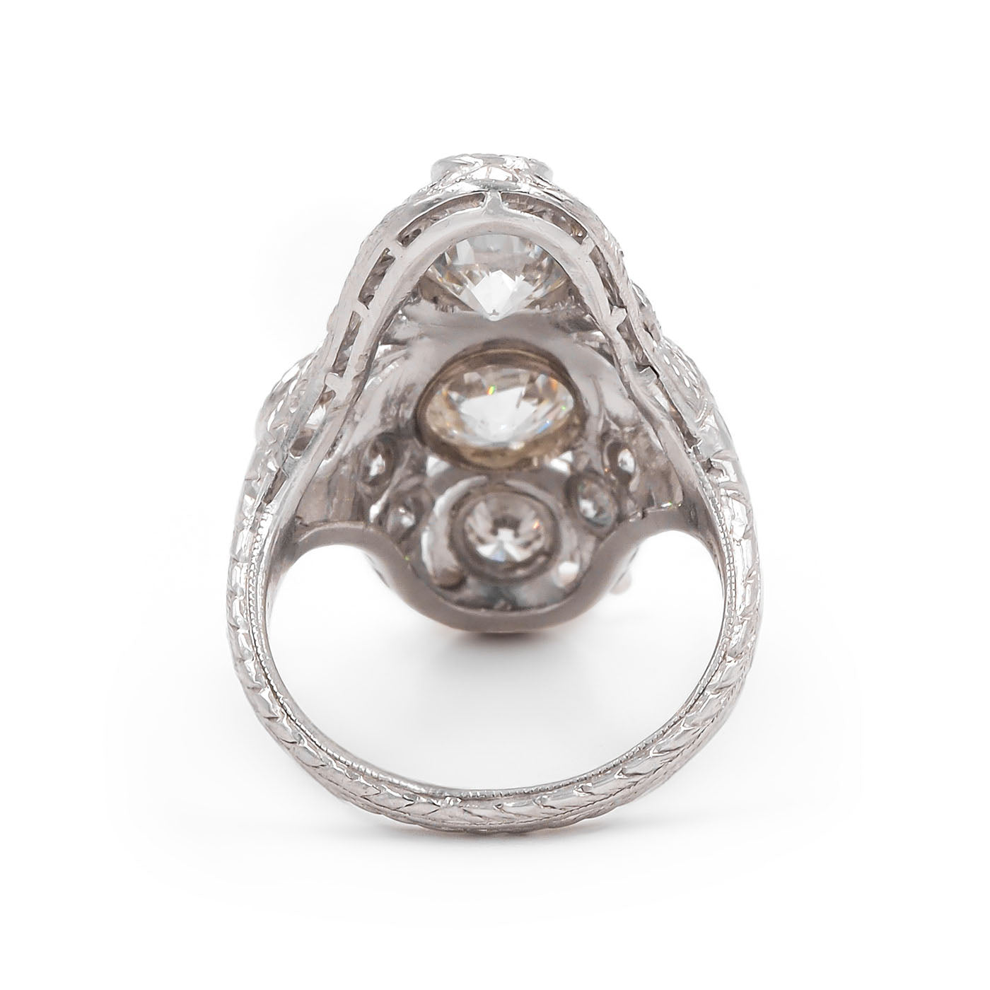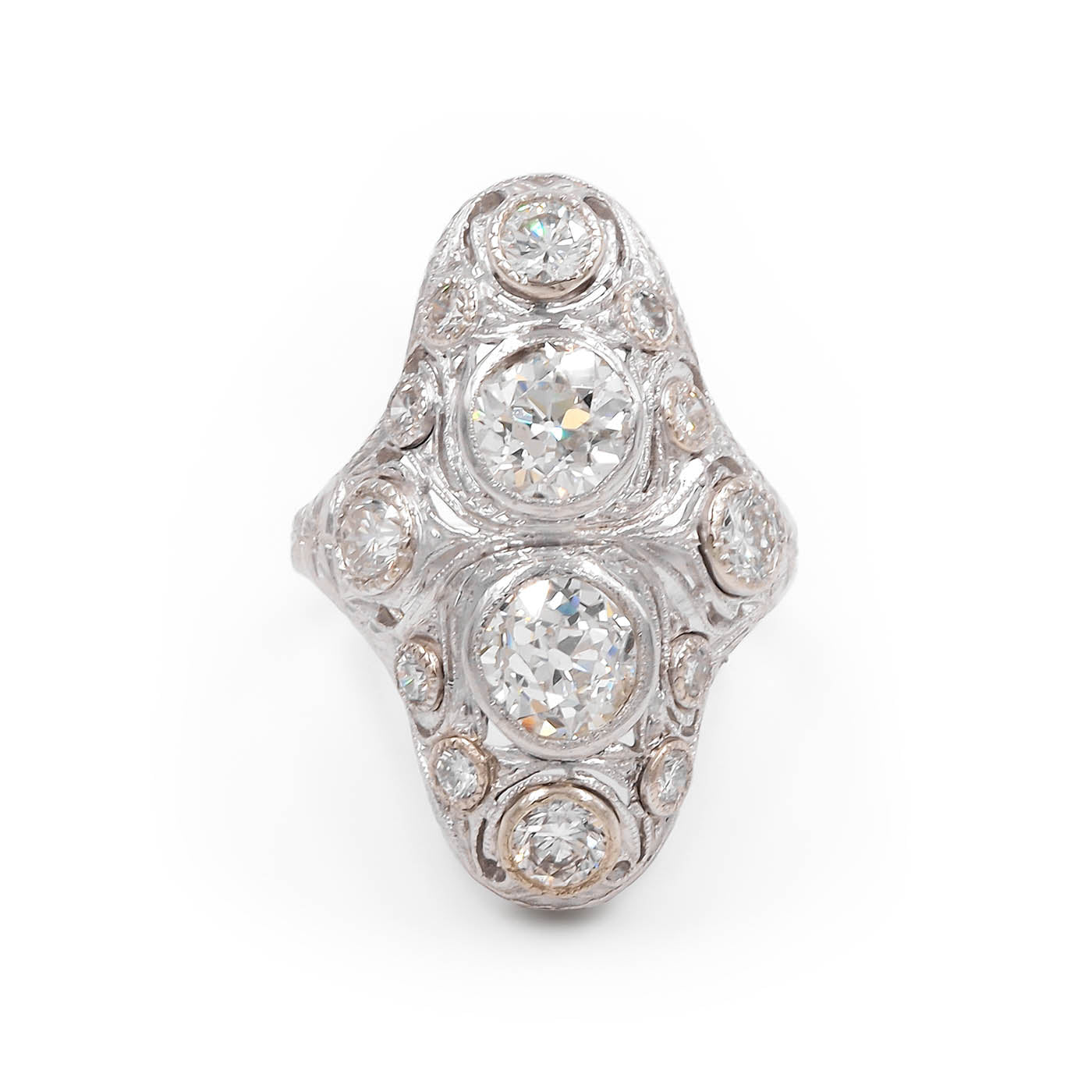Art Deco era 1.79 Ctw. Old European Cut Diamond Navette Dinner Ring composed of platinum. Featuring 2 main Old European Cut diamonds that weigh approximately 1.79 carats in total, with colors estimated to be K-L and clarities estimated to be SI2. There are also 12 Round Brilliant Cut diamonds weighing approximately 0.76 carats in total that accent the elongated navette-shaped setting; with ornately engraved details, swirling geometric cutouts, and fine milgrain throughout. Circa 1920.