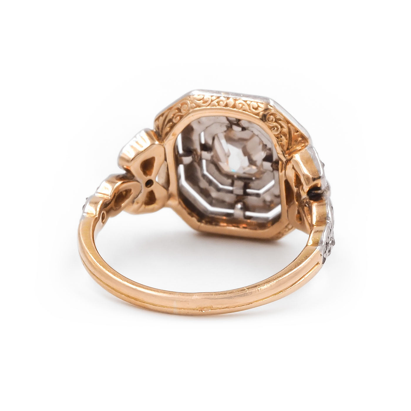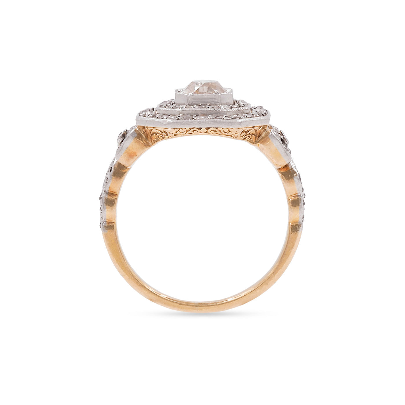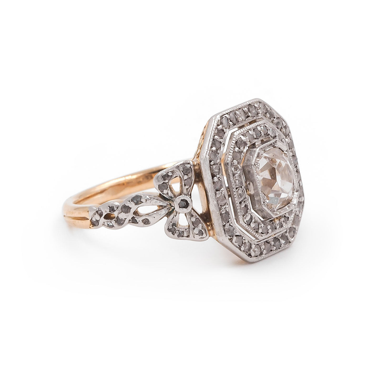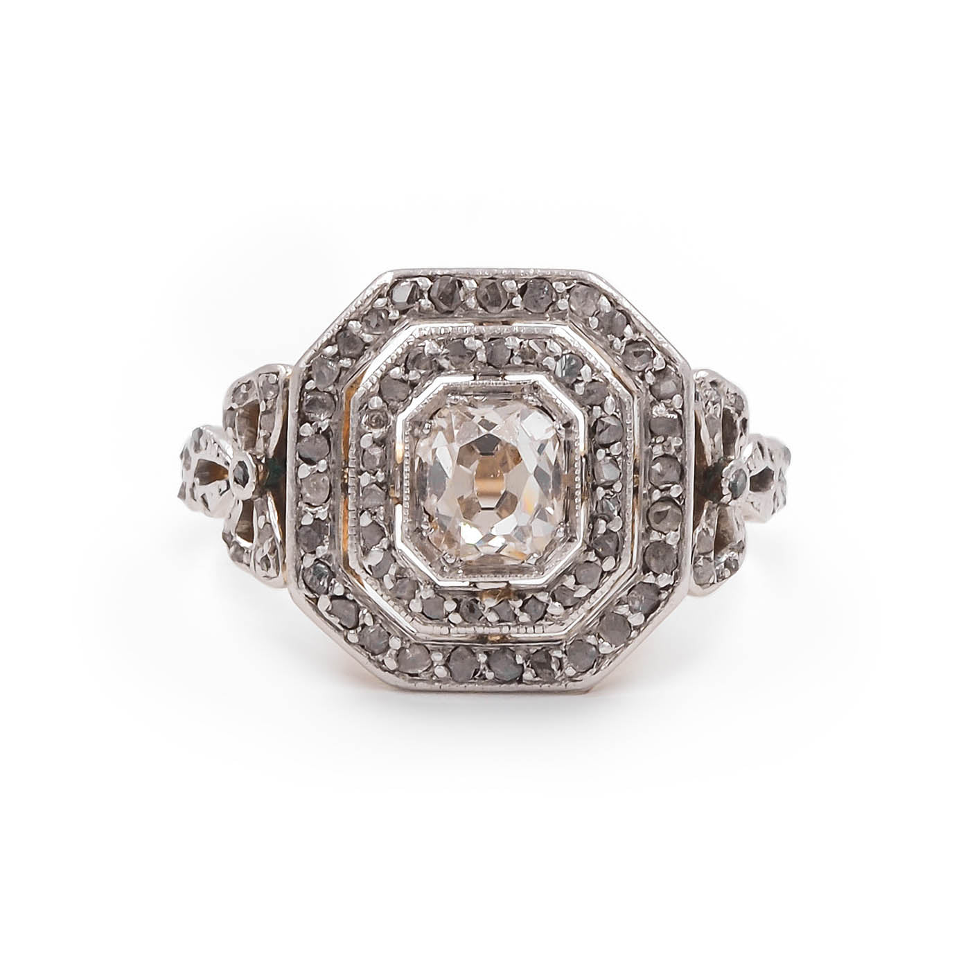 French Edwardian era 0.65 Ct. Old Mine Cut Diamond Octagonal Cluster Ring composed of platinum & 18k yellow gold. With an estimated 0.65 carat Old Mine Cut diamond at the center, with the color estimated to be K-L-M and the clarity estimated to be SI2. The center diamond is framed by two rows of diamonds, with diamonds also set into the two bows, 82 Rose Cut diamonds in total estimated to weigh 0.35 carats. The diamonds are set into the platinum top of the ring, with fine milgrain throughout; 18k yellow gold basket & shank. Stamped for French origin. Circa 1910.