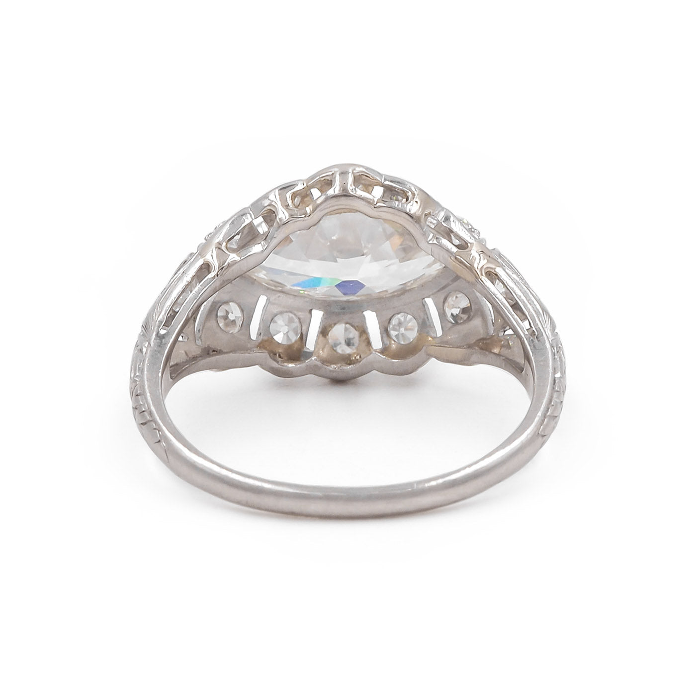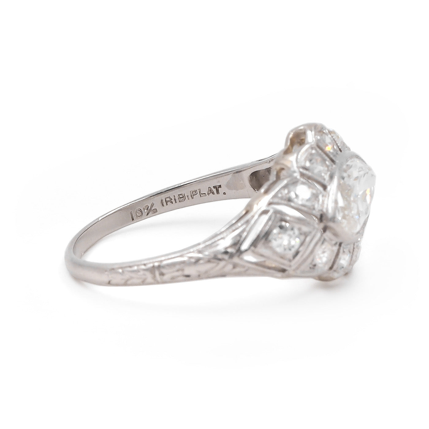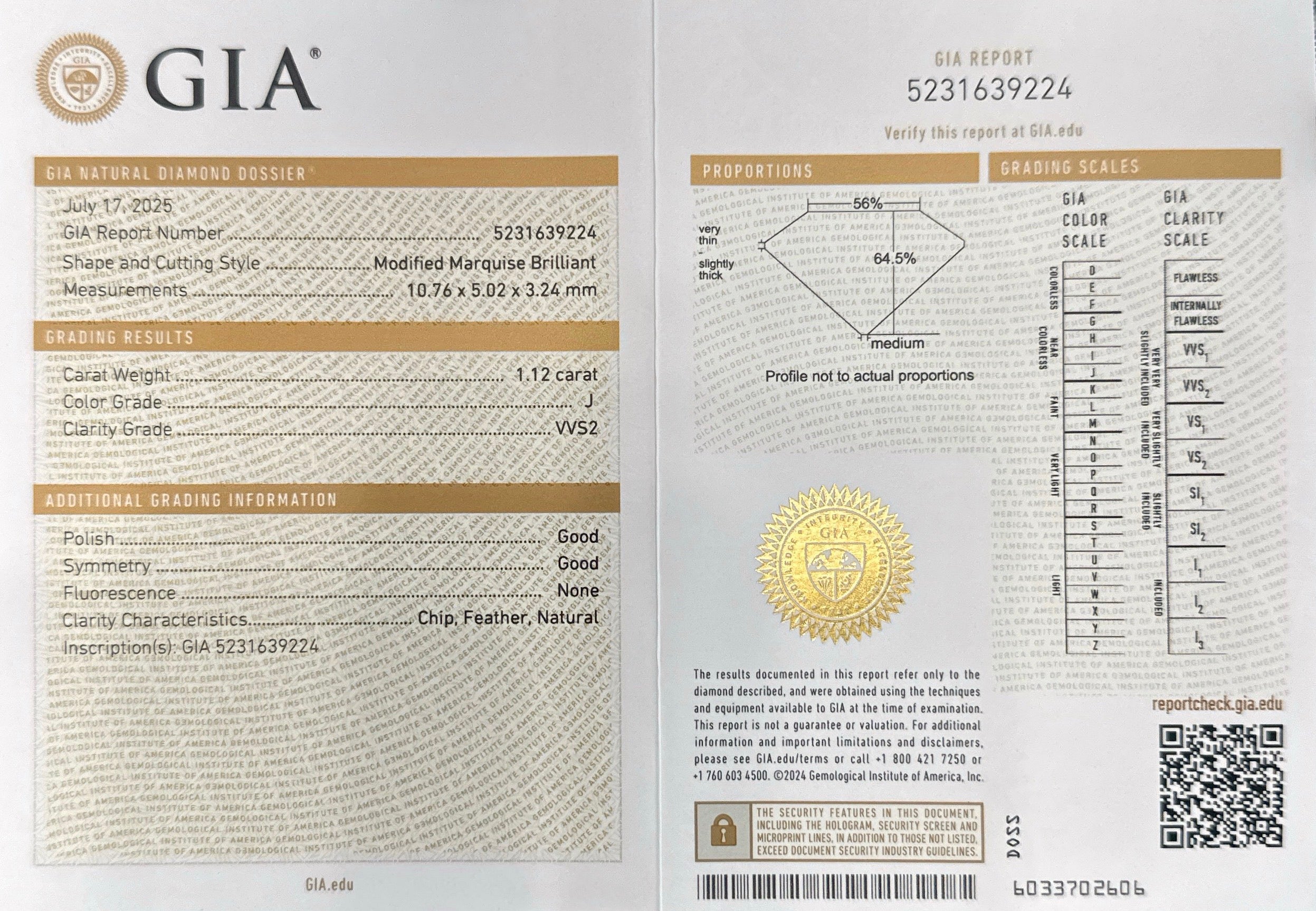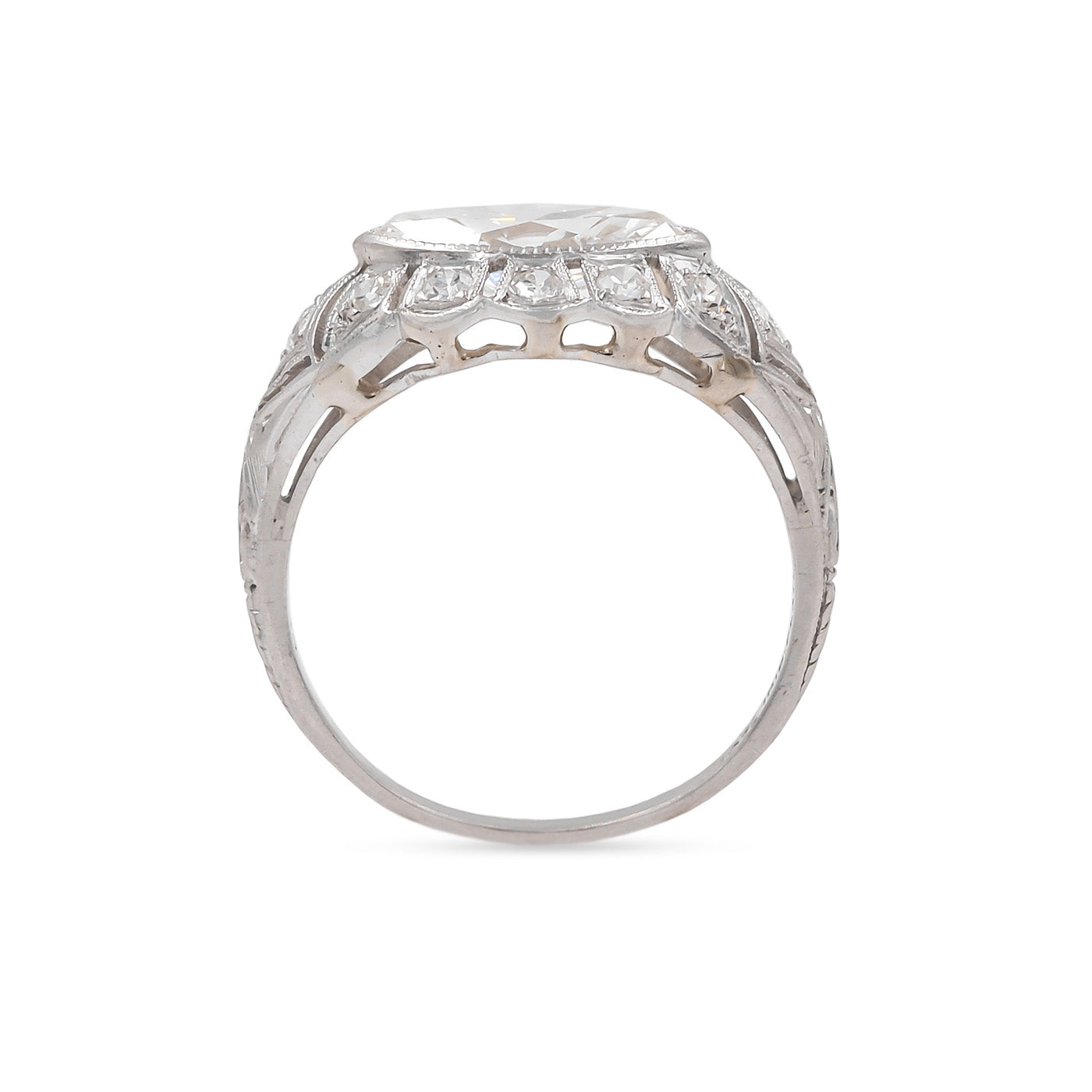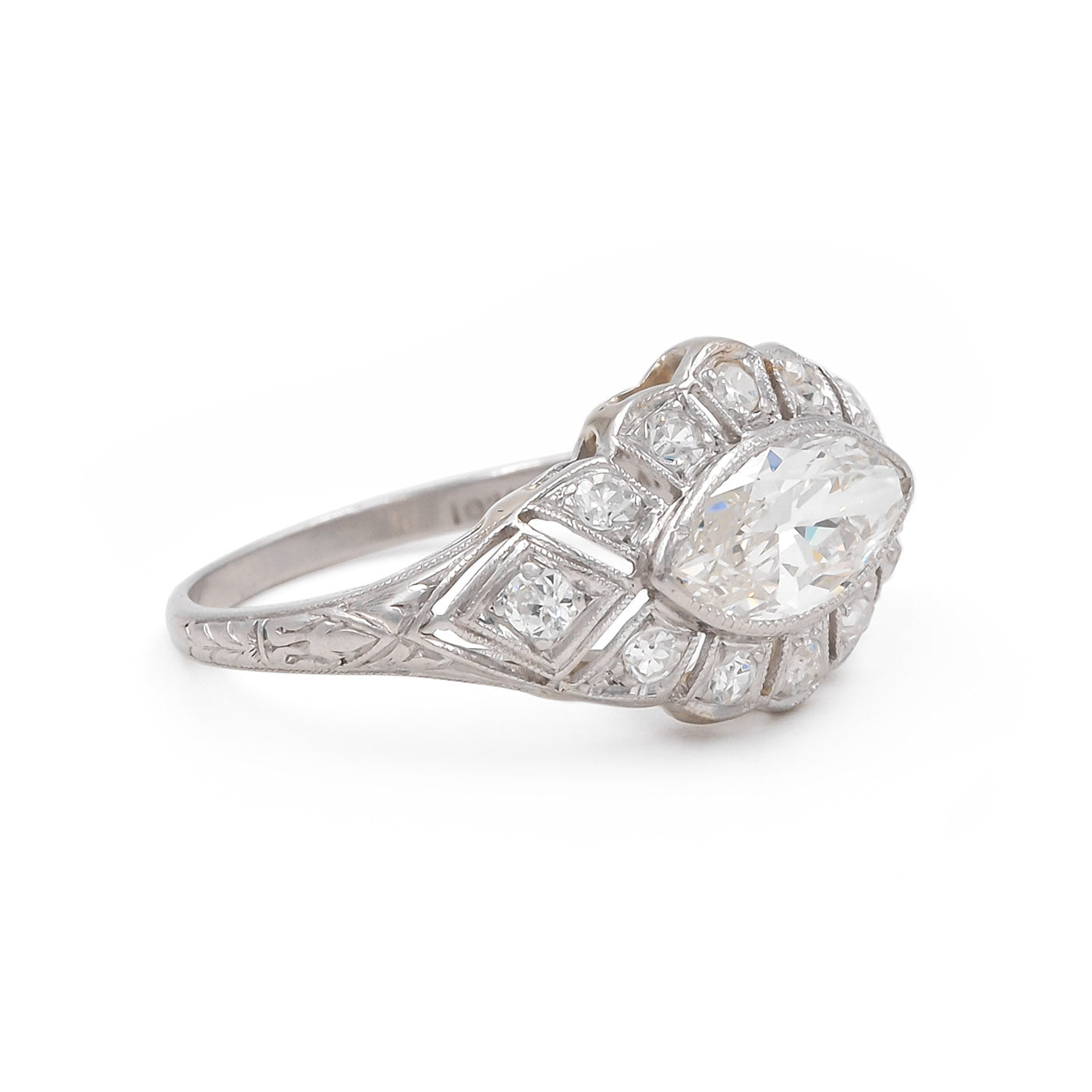Early Art Deco era 1.12 Ct. Marquise Cut Diamond Engagement Ring composed of platinum. The 1.12 carat Marquise Cut diamond is GIA certified J color/VVS2 clarity. The diamond is bezel-set horizontally, framed by ornately cutout details set with 12 diamonds, a combination of Old European Cut and Old Single Cut diamonds, weighing approximately 0.26 carats in total. The front of the ring measures approximately 11.19 mm tall by 18.2 mm wide. Circa 1920.