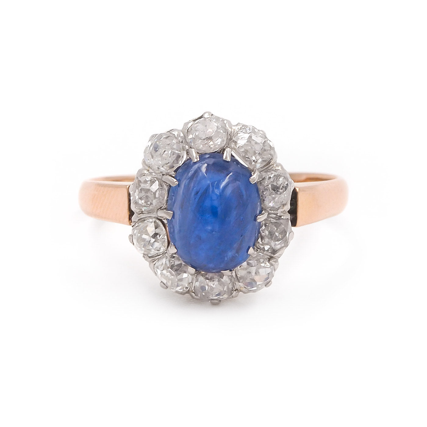 Stones: 2.40 Ct. Cabochon Blue Sapphire; Approximately 1.30 Ctw. Old Mine Cut Diamonds