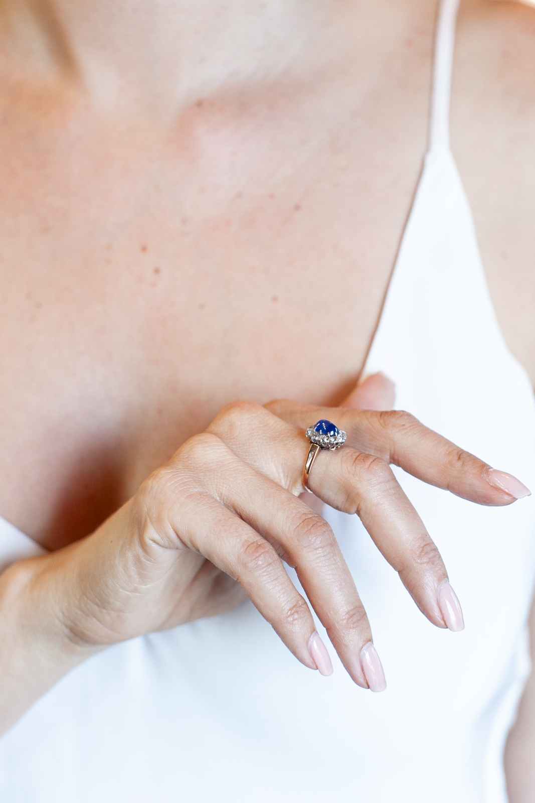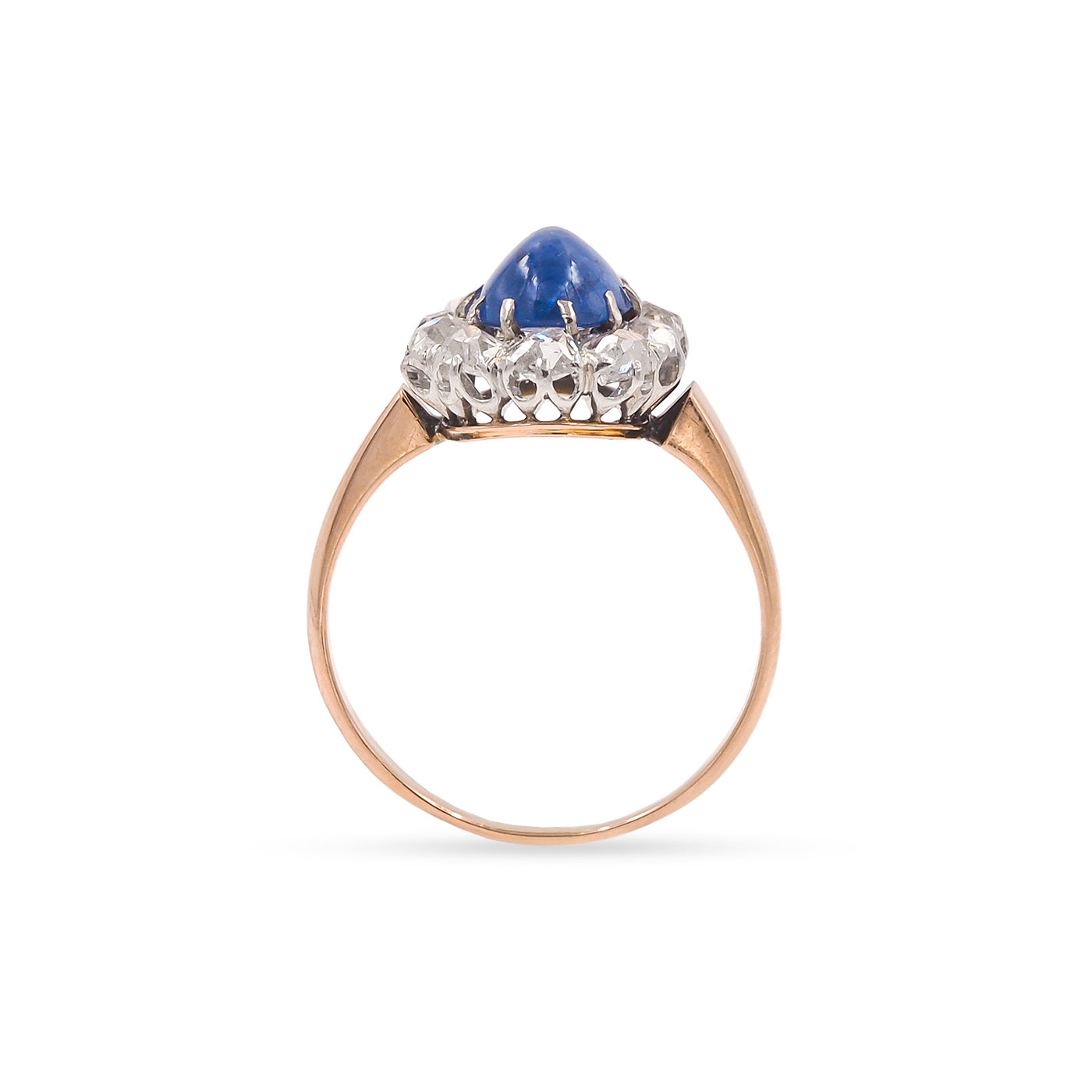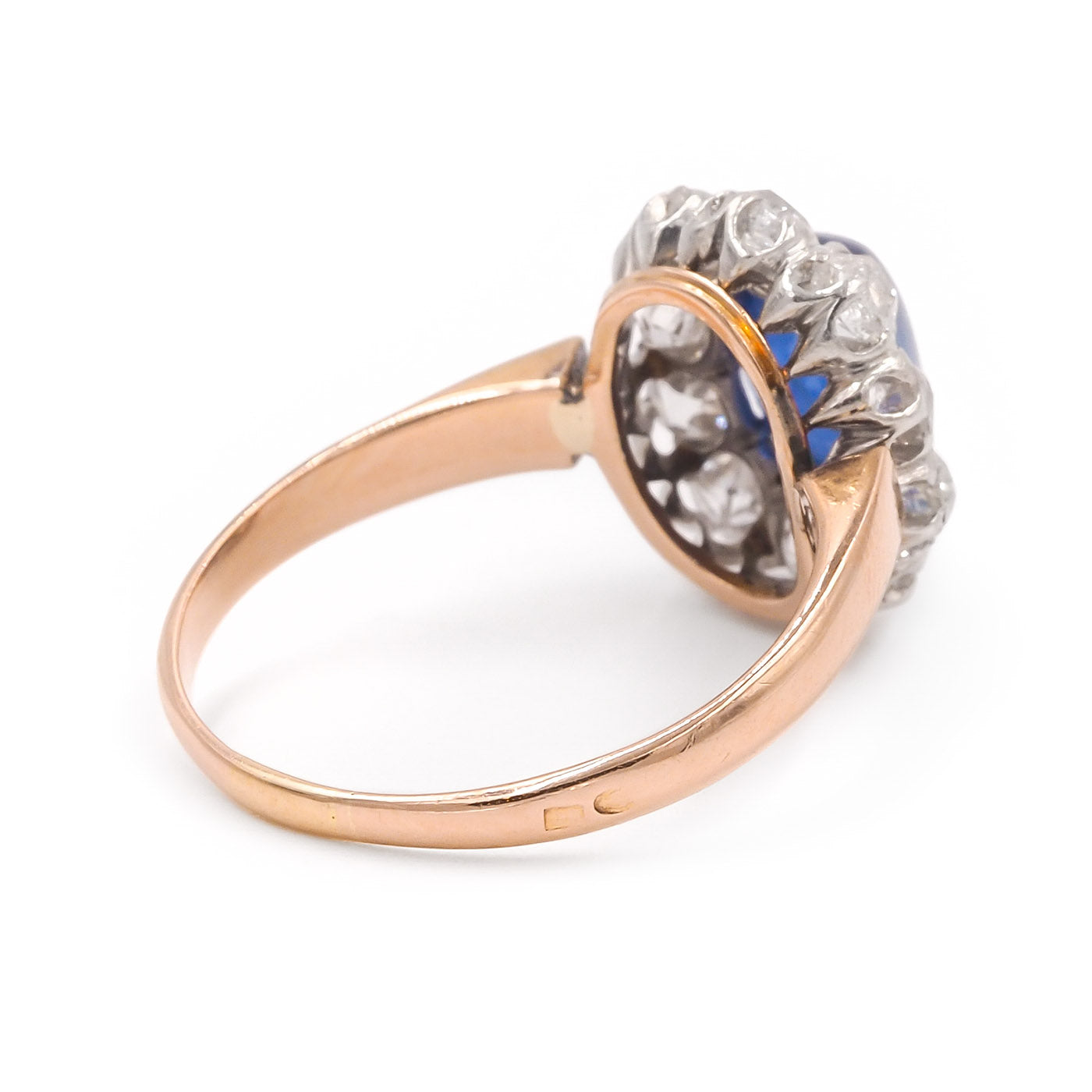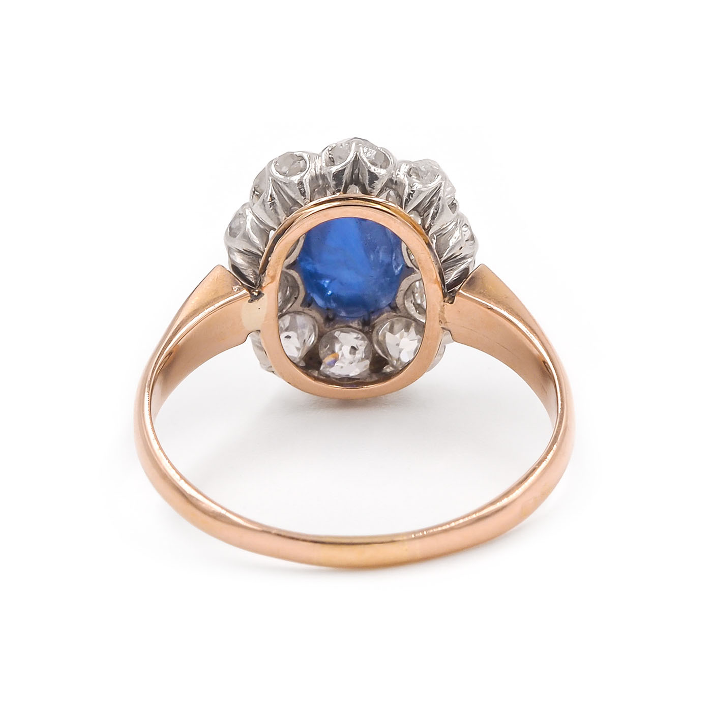 French Import Edwardian era 2.40 Carat Oval Cabochon Sapphire & Old Mine Cut Diamond Cluster Ring, composed of 18k rose gold & platinum. The 2.40 carat Oval Cabochon natural blue sapphire is AGL certified, from Burma and is Unheated. With an additional 10 Old Mine Cut diamonds surrounding the sapphire, weighing approximately 1.30 carats in total. The stones are set into platinum, upon an 18k rose gold shank. With French Import hallmarks. Circa 1905.
