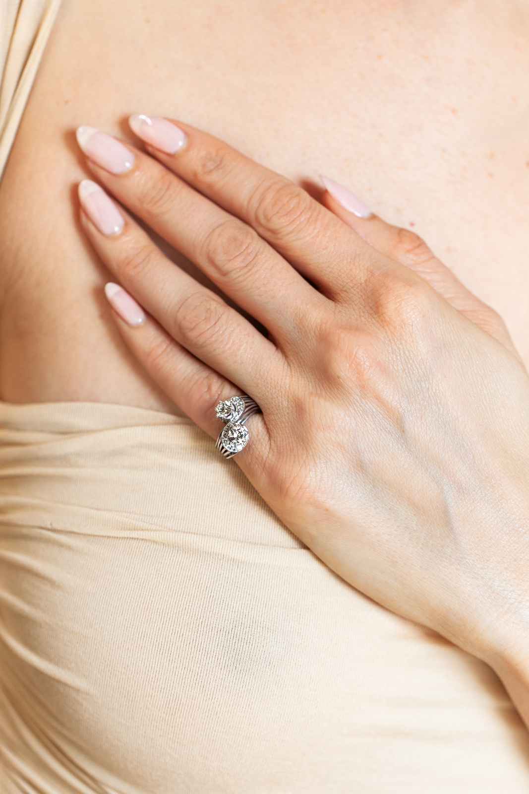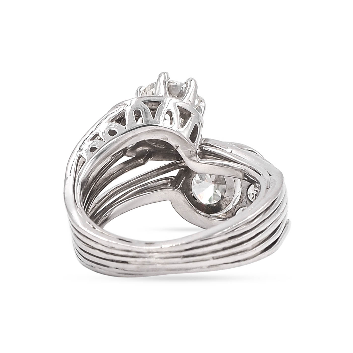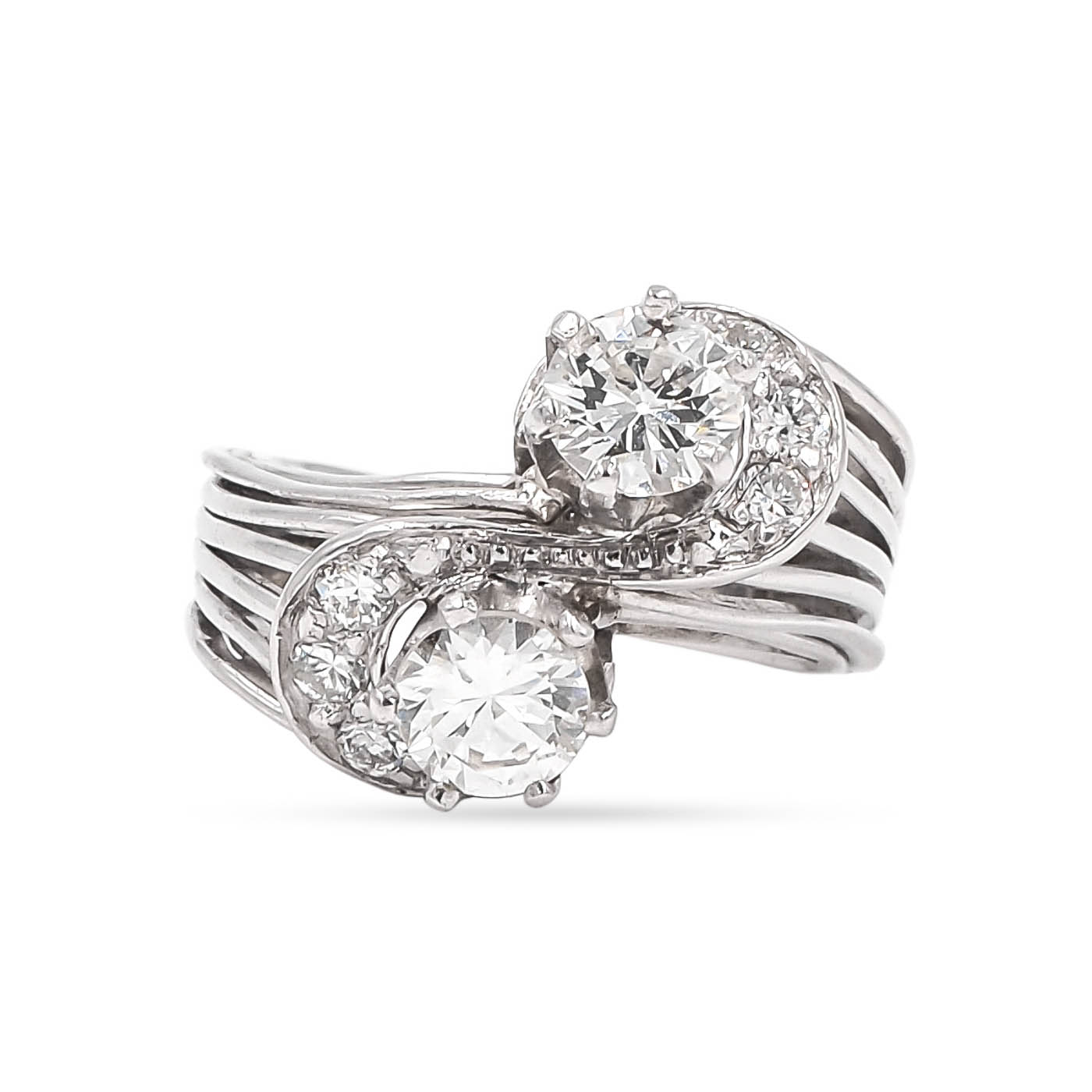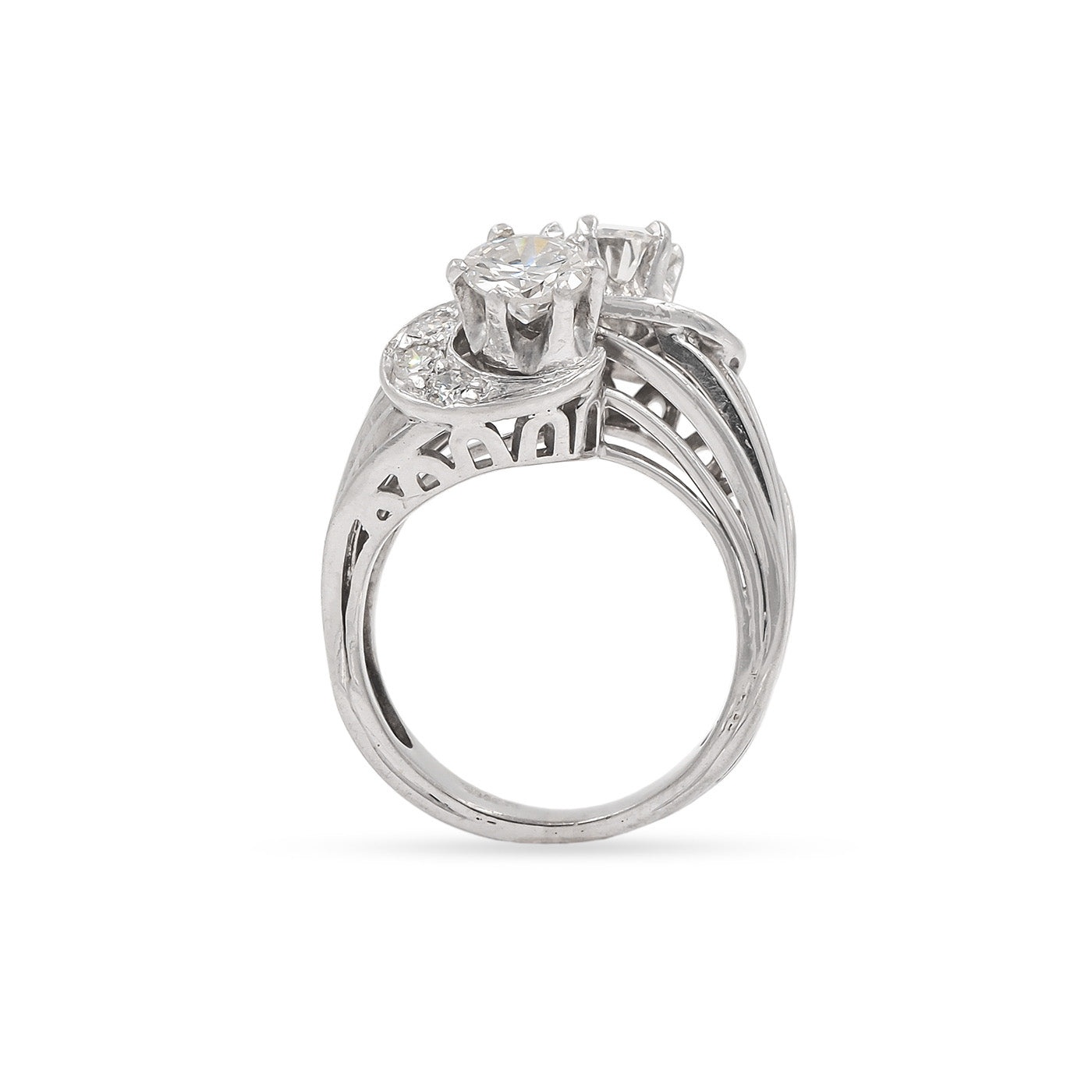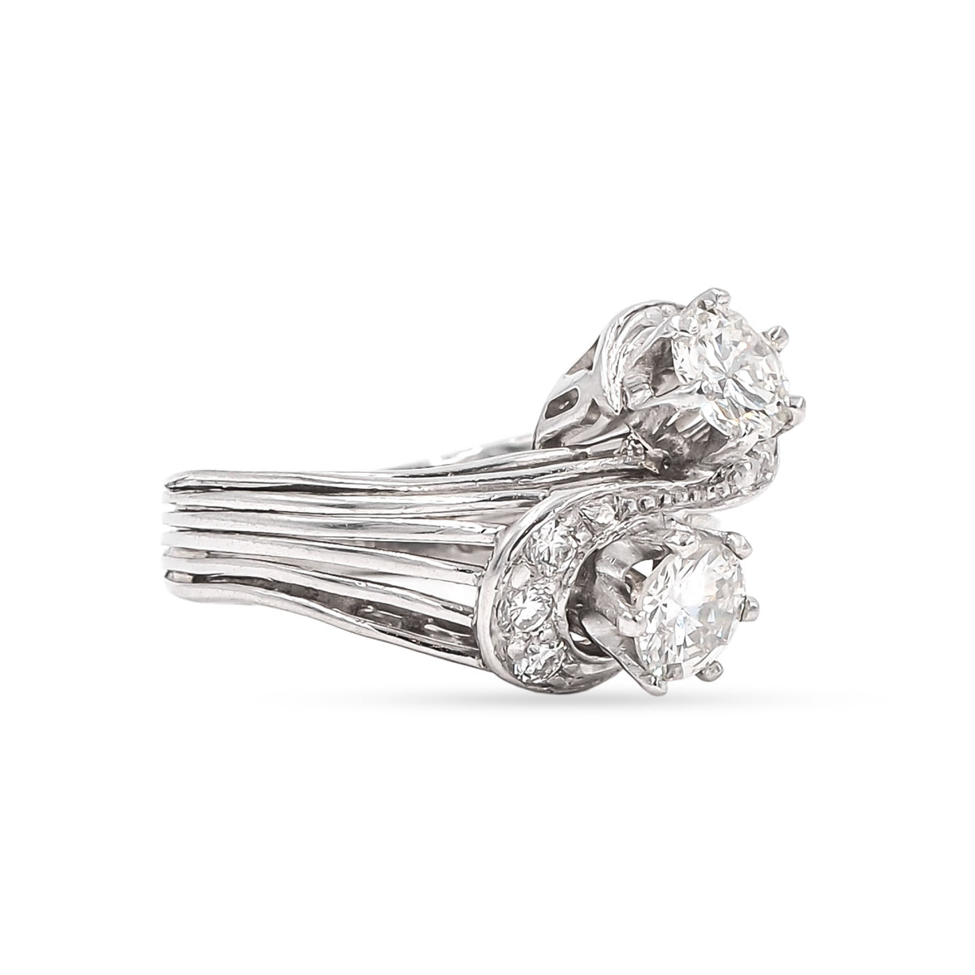 American Mid-Century 0.89 Ctw. Transitional Cut Diamond Toi et Moi Ring composed of 18k white gold. The 2 main Transitional Cut diamonds weigh approximately 0.89 carats in total. With an additional 6 Transitional Cut diamonds set in the bypassing shoulders, weighing approximately 0.18 carats in total. Circa 1950’s.