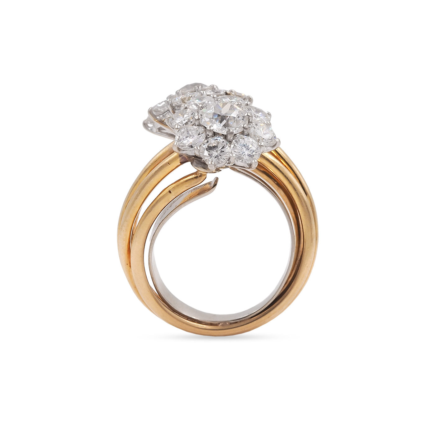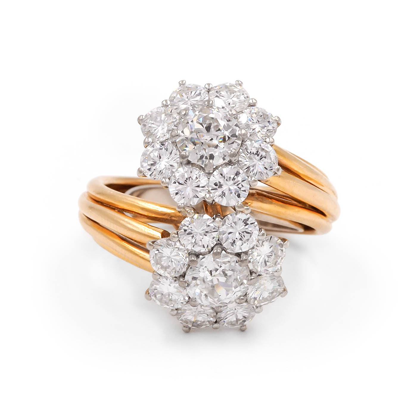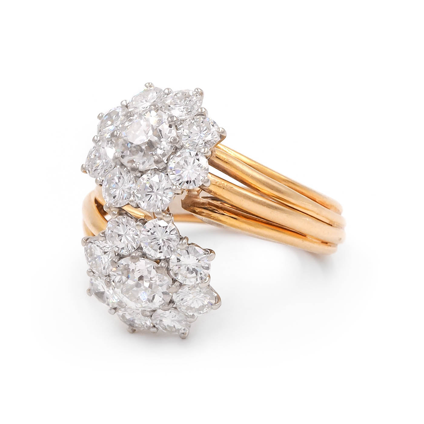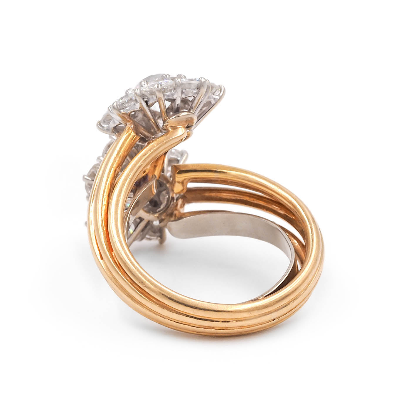 Mid-Century 1.00 Ctw. Old European Cut Diamond Cluster Toi et Moi Ring composed of 18k yellow gold and 18k white gold. The 2 main Old European Cut diamonds weigh approximately 1.00 carat in total. With 16 Round Brilliant Cut diamonds that weigh approximately 2.00 carats in total surrounding the center diamonds in two bypassing, cluster-style mountings. With a integrated sizing band at the interior of the ring that can be removed upon request. Circa 1950’s.
