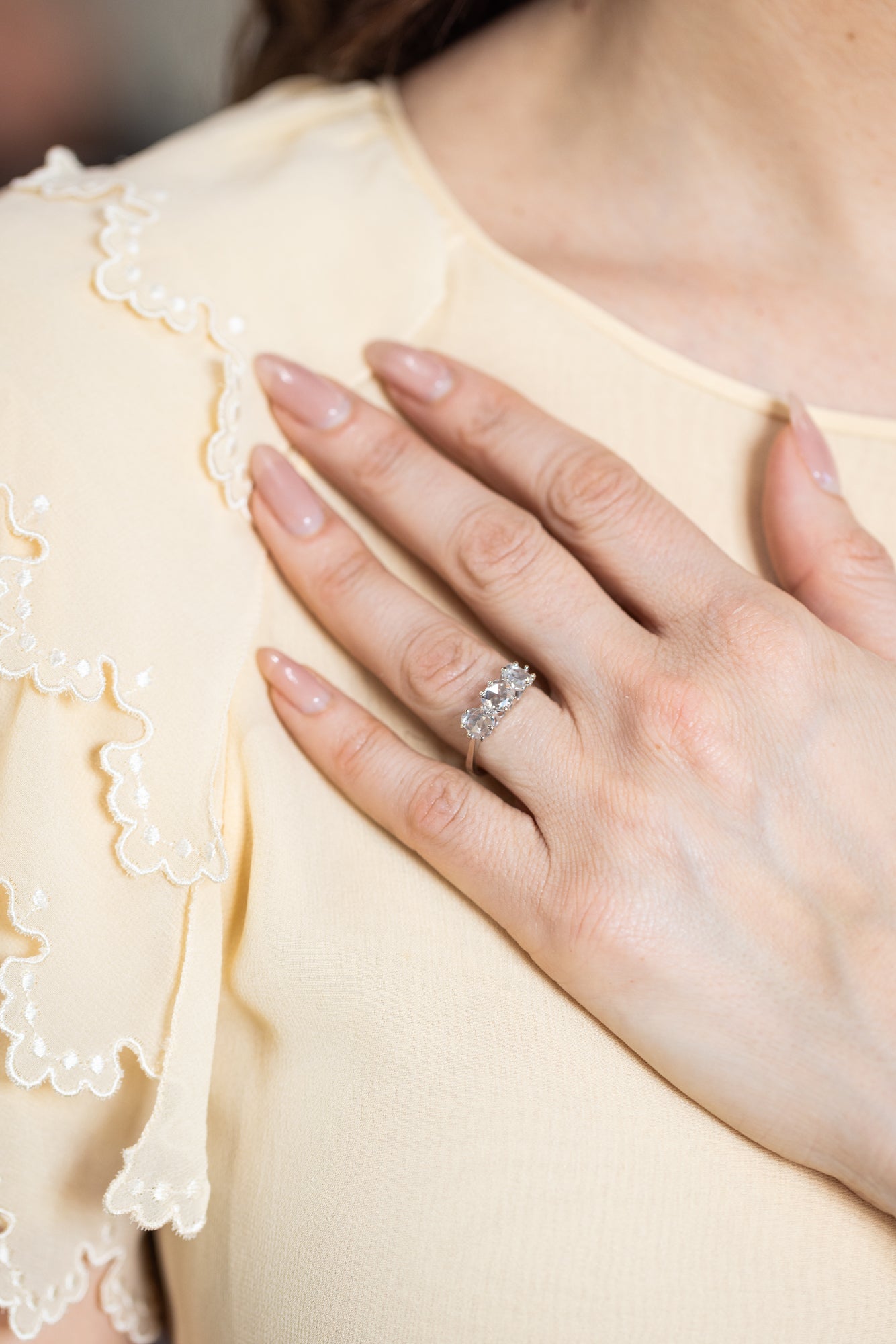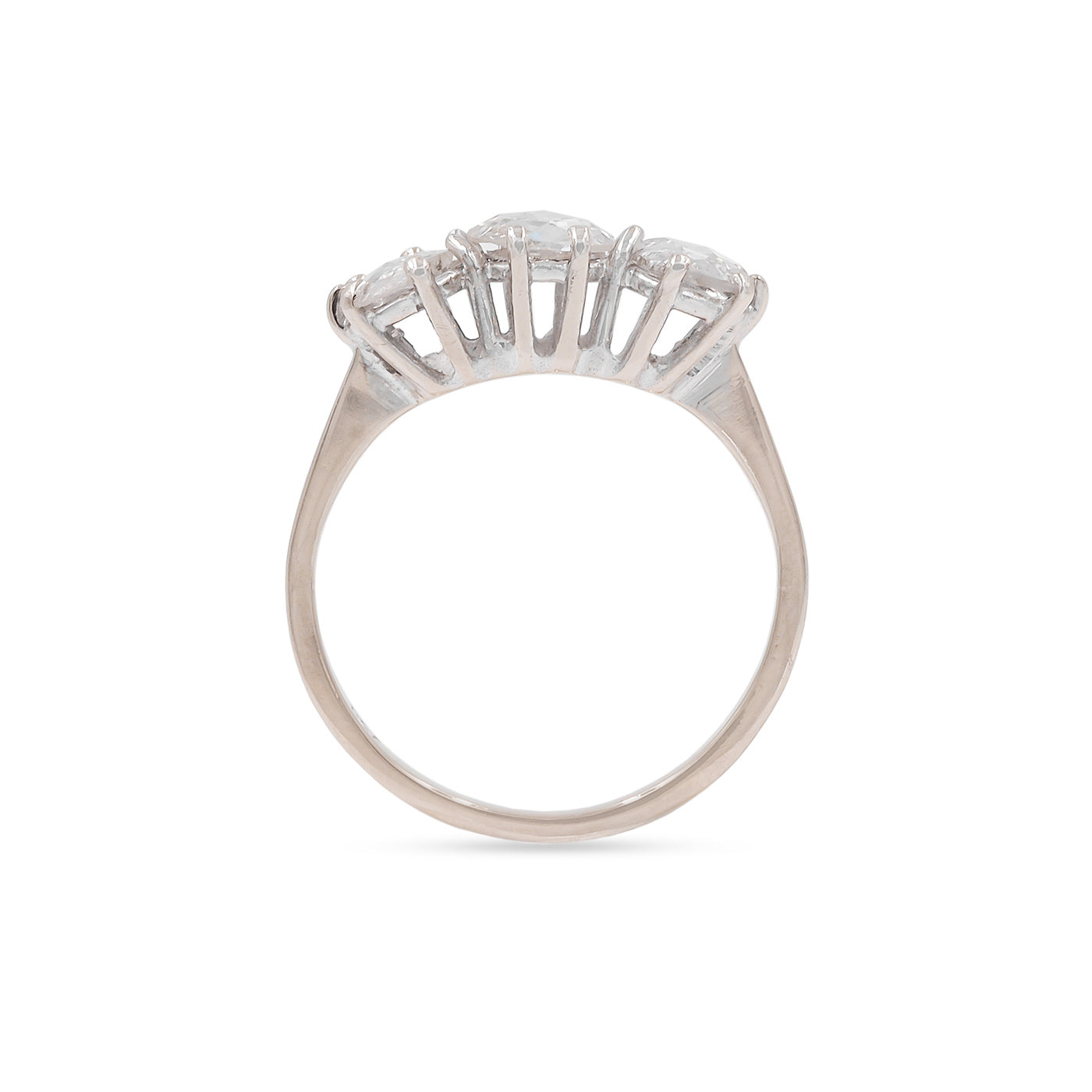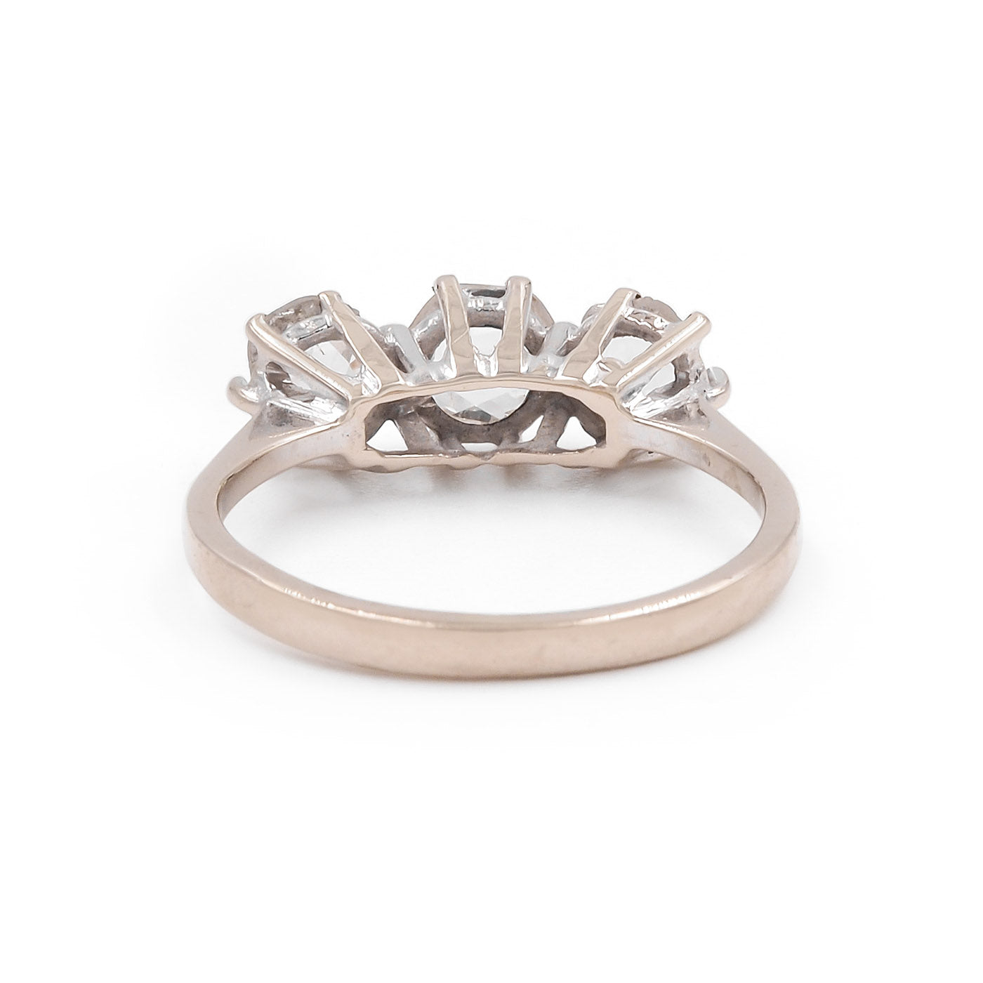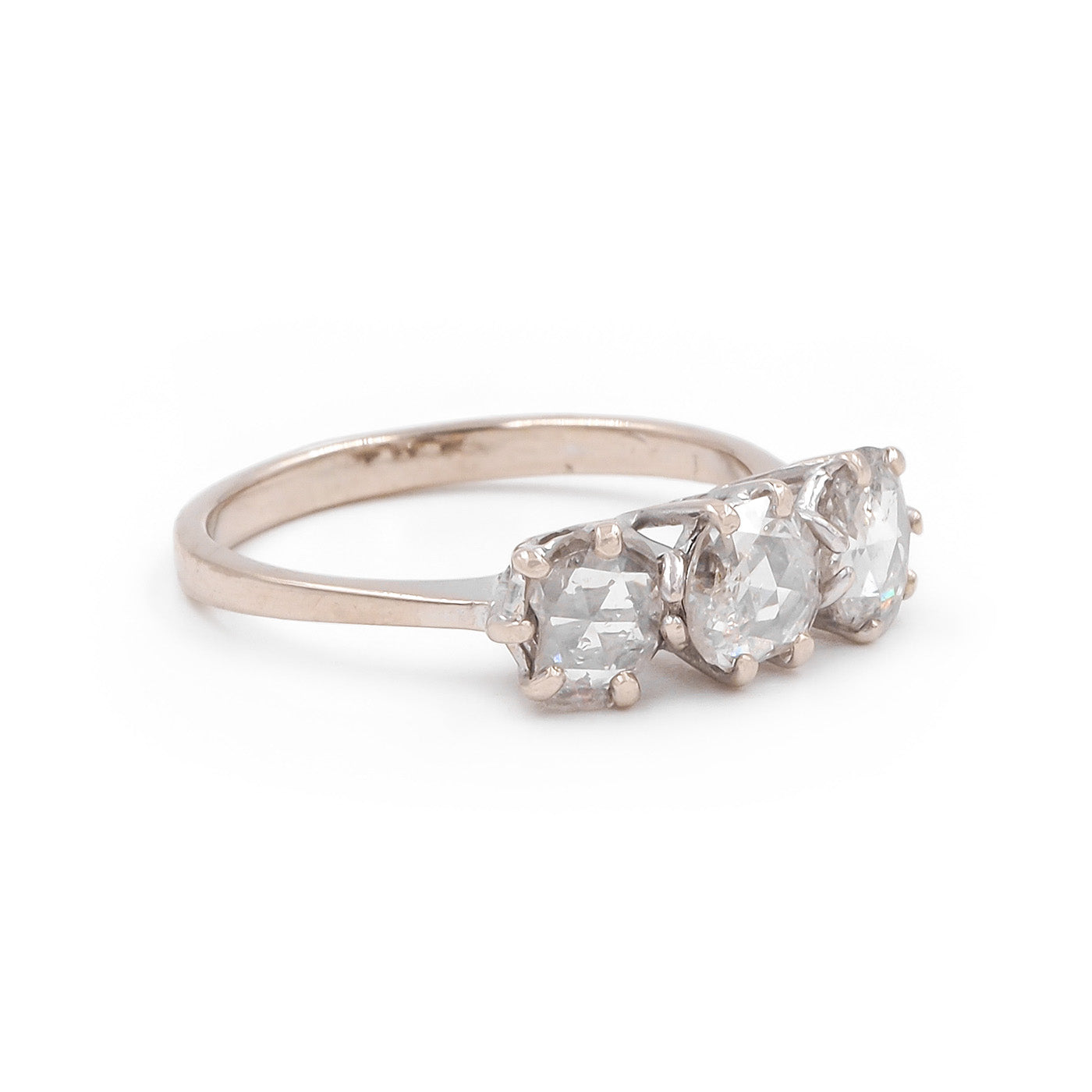 French Import Mid-Century 1.00 Ctw. Rose Cut Diamond 3-Stone Ring composed of 18k white gold. With 3 Rose Cut diamonds, estimated to weigh 0.40 carats, 0.32 carats, and 0.28 carats respectively. The diamonds are set individually within multi-claw prong baskets, upon an 18k white gold shank with tapered shoulders. With French Import hallmarks. Circa 1950.