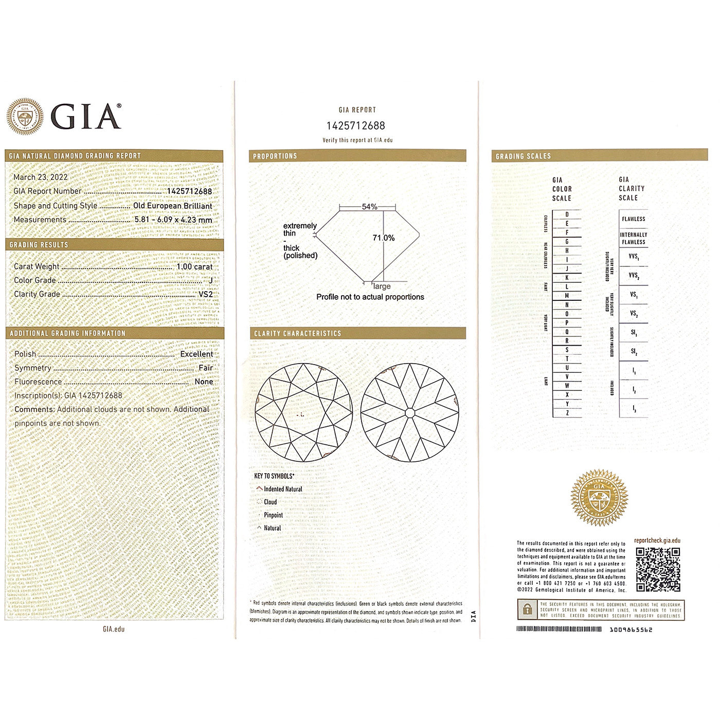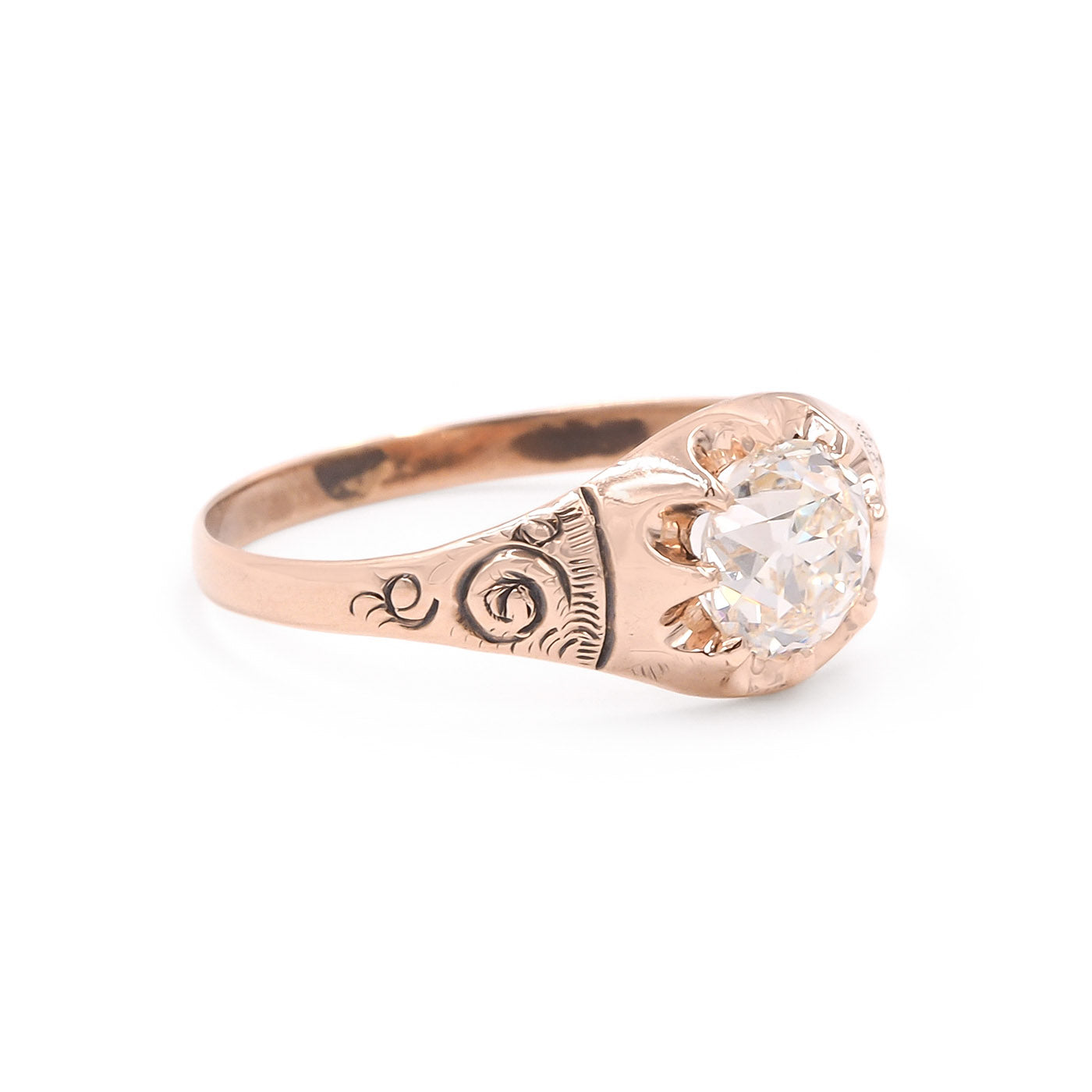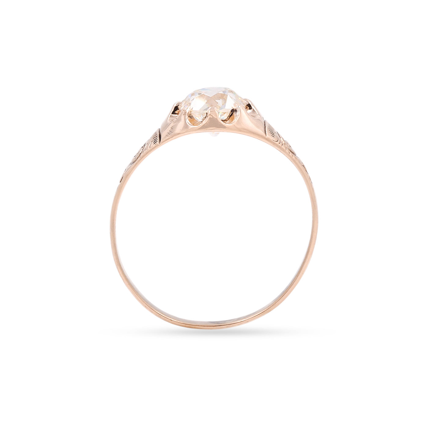 Victorian era 1.00 Carat Old European Cut Diamond Engagement Ring composed of 14k rosy light yellow gold. With a 1.00 carat Old European Cut diamond, GIA certified J color/VS2 clarity. The diamond is set into a buttercup-style mounting with claw prongs; with ornate engraved details down the side of each shoulder with a darkened patina. Circa 1890.