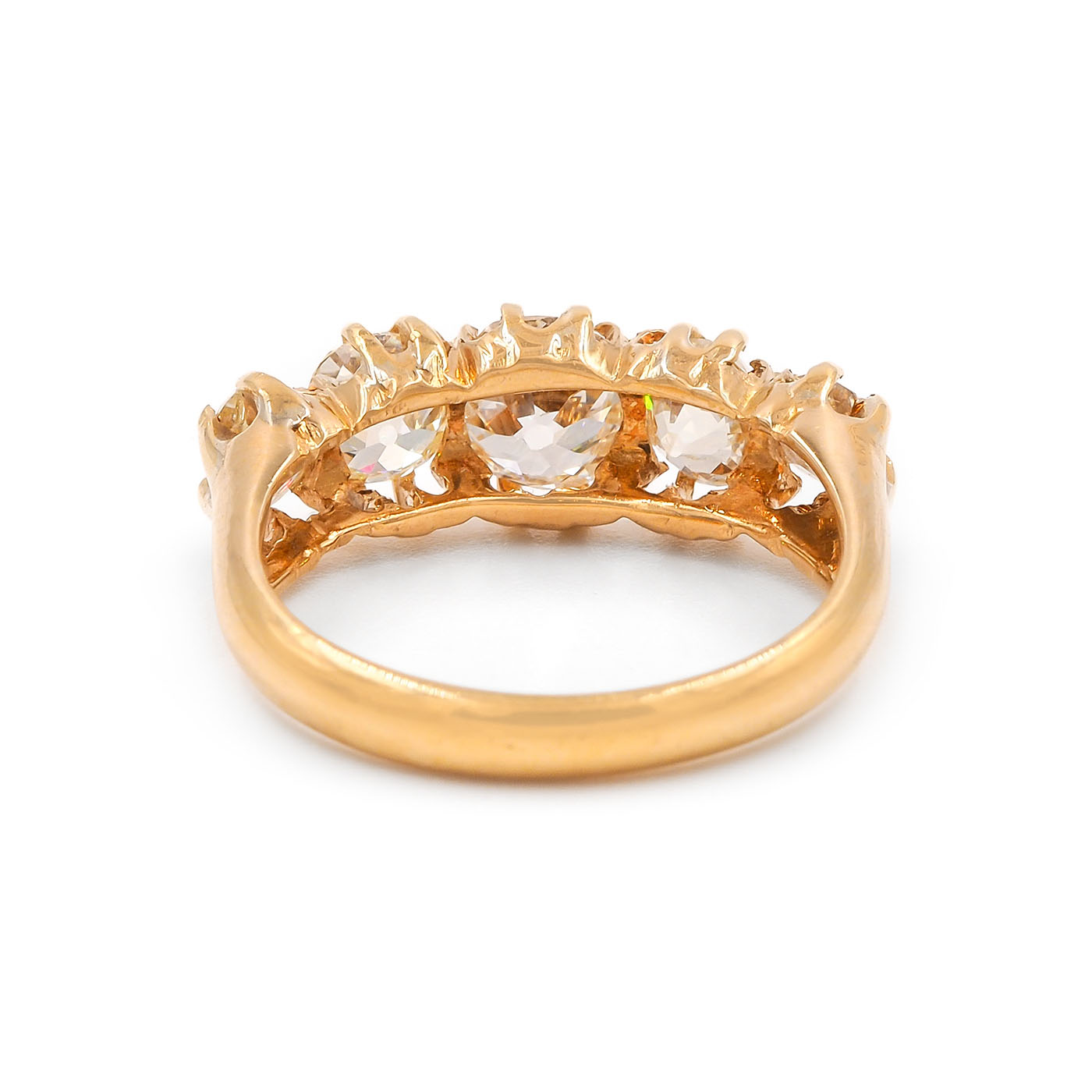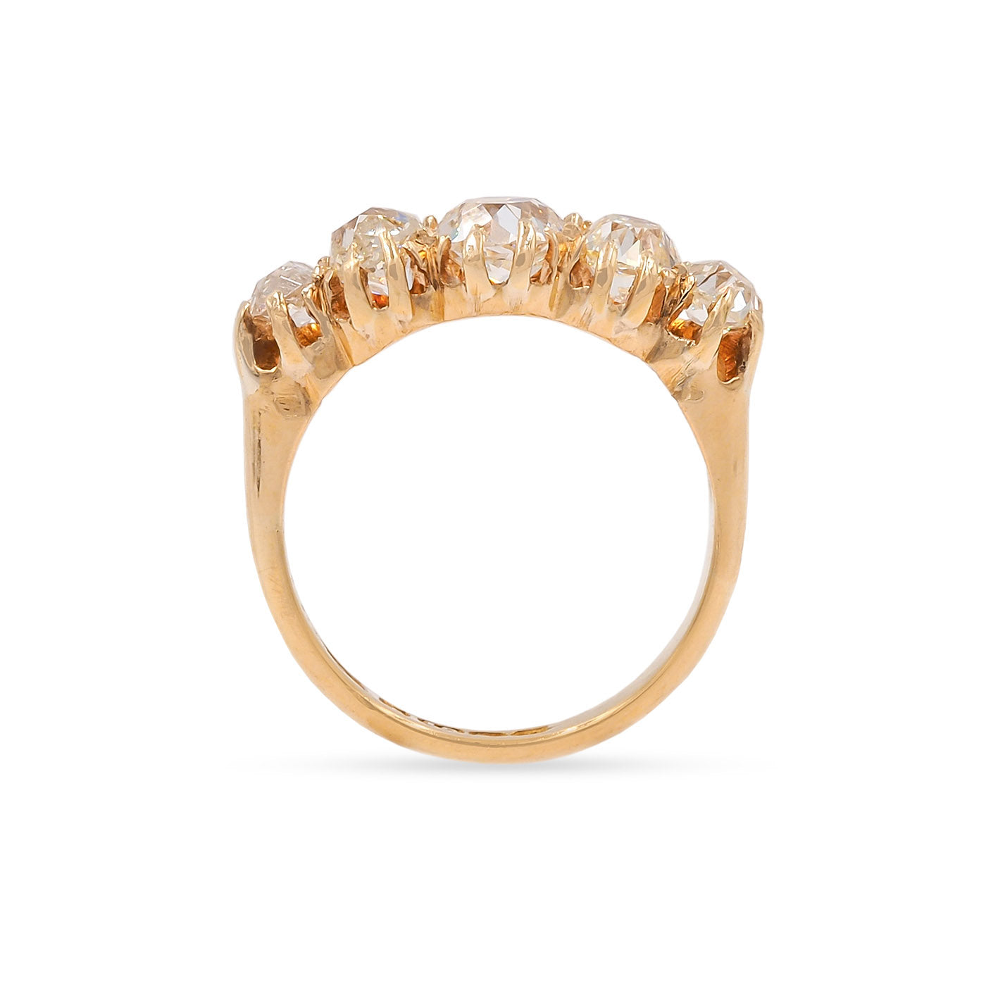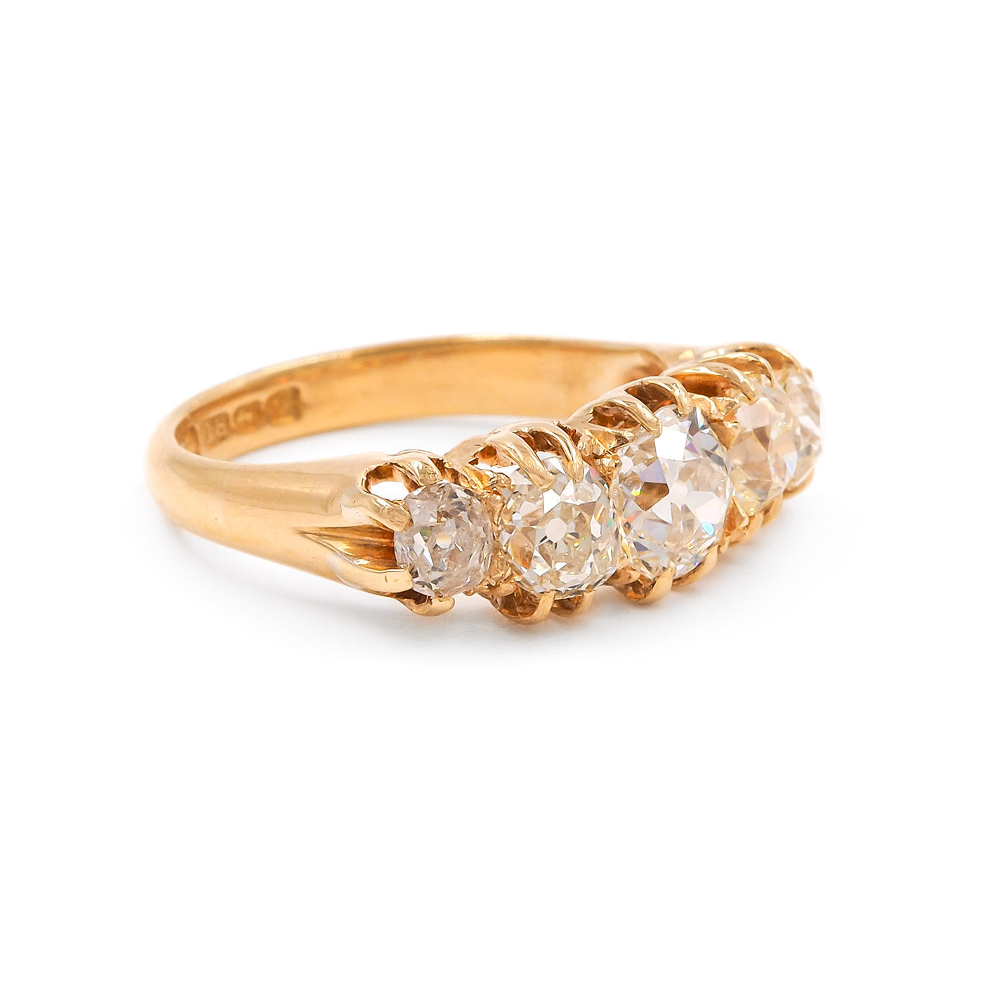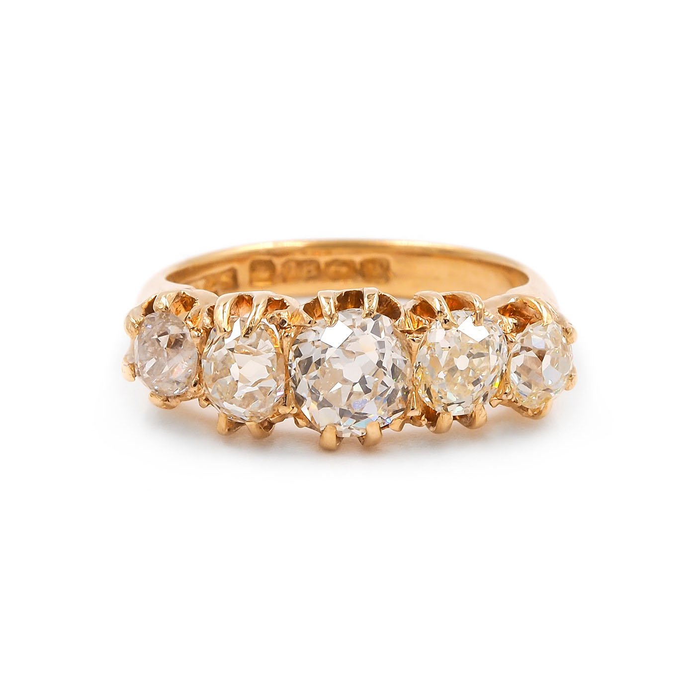English Victorian era 2.45 Ctw. Old Mine Cut Diamond 5-Stone Ring composed of 18k yellow gold. With a center Old Mine Cut diamond that is estimated to be 0.88 carats and M-N color/SI1 clarity. Flanked by 4 Old Mine Cut diamonds weighing approximately 1.57 carats in total, with a color range approximately of M-N-O, clarity range of SI1-SI2. The diamonds are set within multiple claw prongs. Fits like a size 7 approximately (sizable). Fully hallmarked for English origin (Birmingham), Circa 1870.