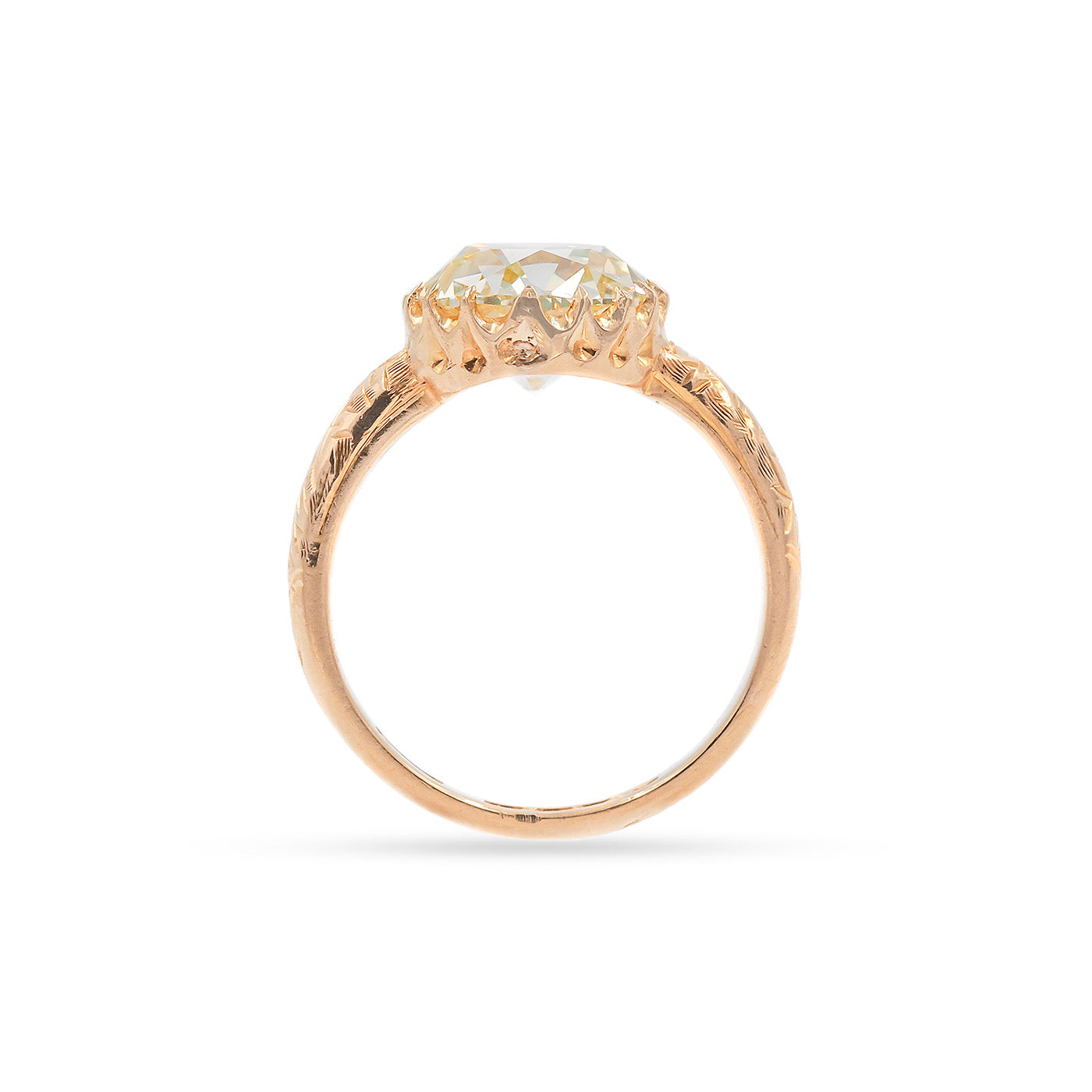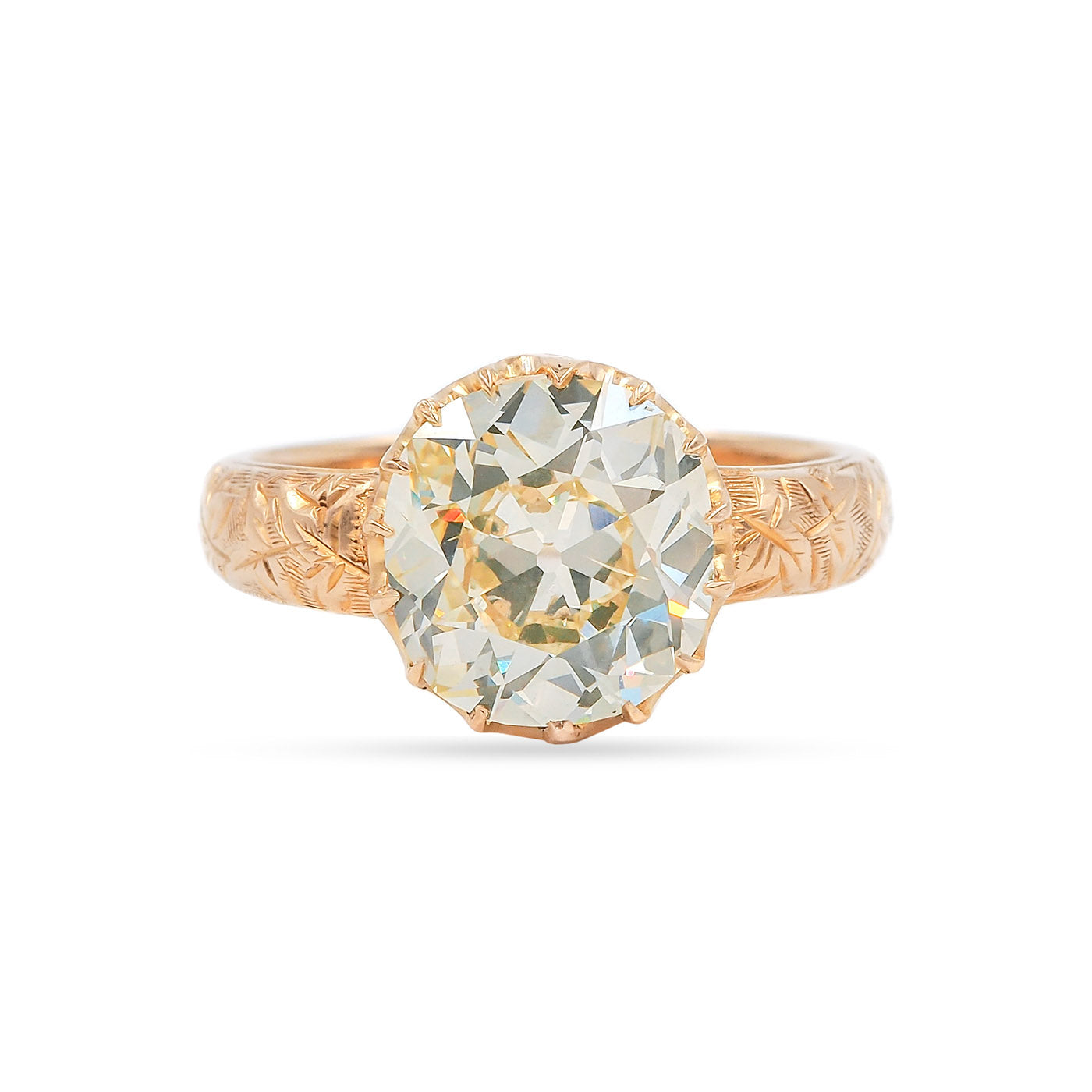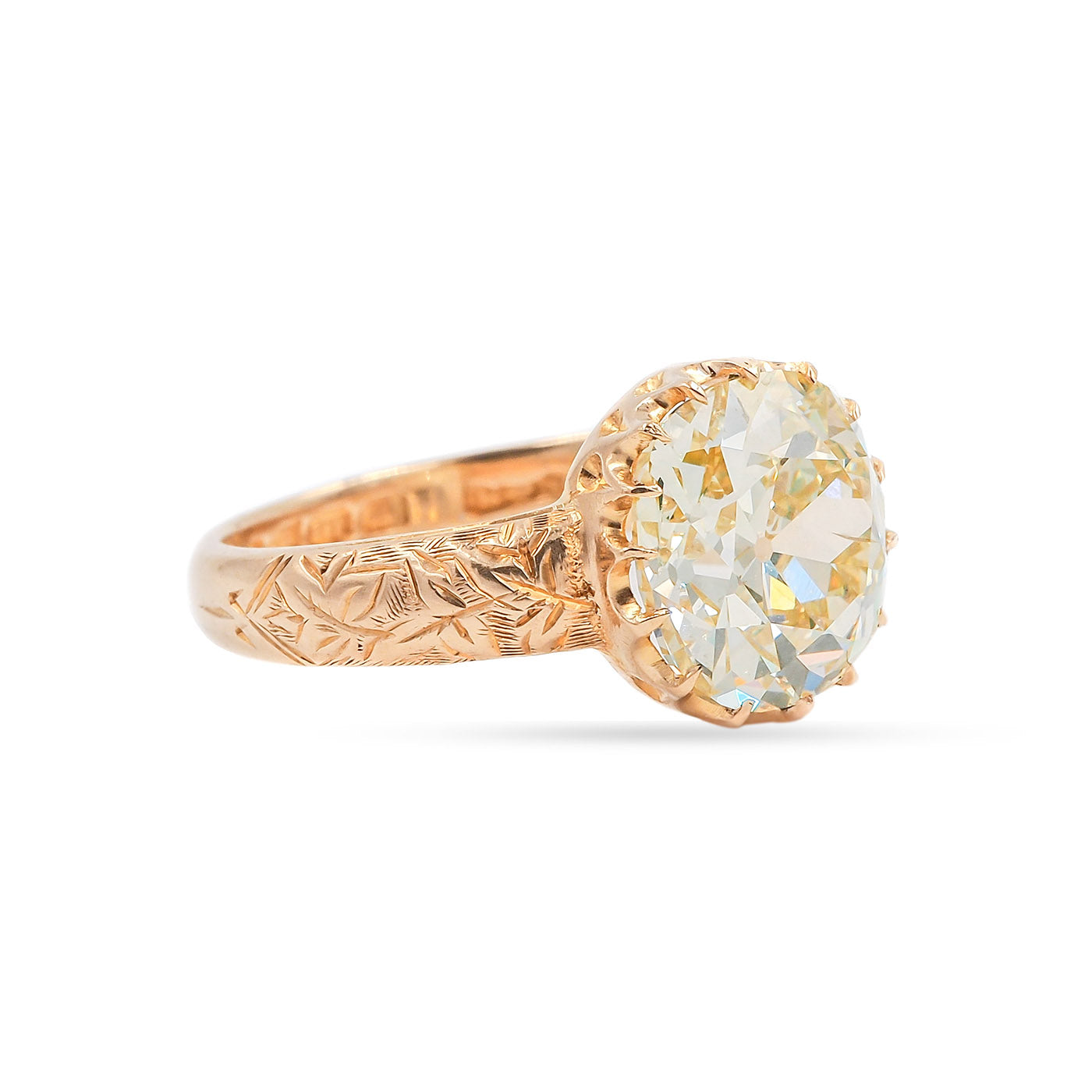 Late Victorian era 4.50 Carat Old Mine Cut Diamond Solitaire Engagement Ring composed of 18k yellow gold. The 4.50 carat Old Mine Cut diamond is GIA certified Natural Fancy Yellow color/SI2 clarity. Diamond is a slightly elongated cushion-shape and is set in a multiple-claw prong setting. With ornately decorated shoulders and shank featuring an ivy vine motif. Fully hallmarked, English origin. Circa 1900.