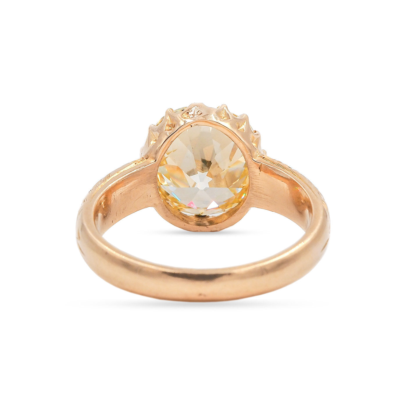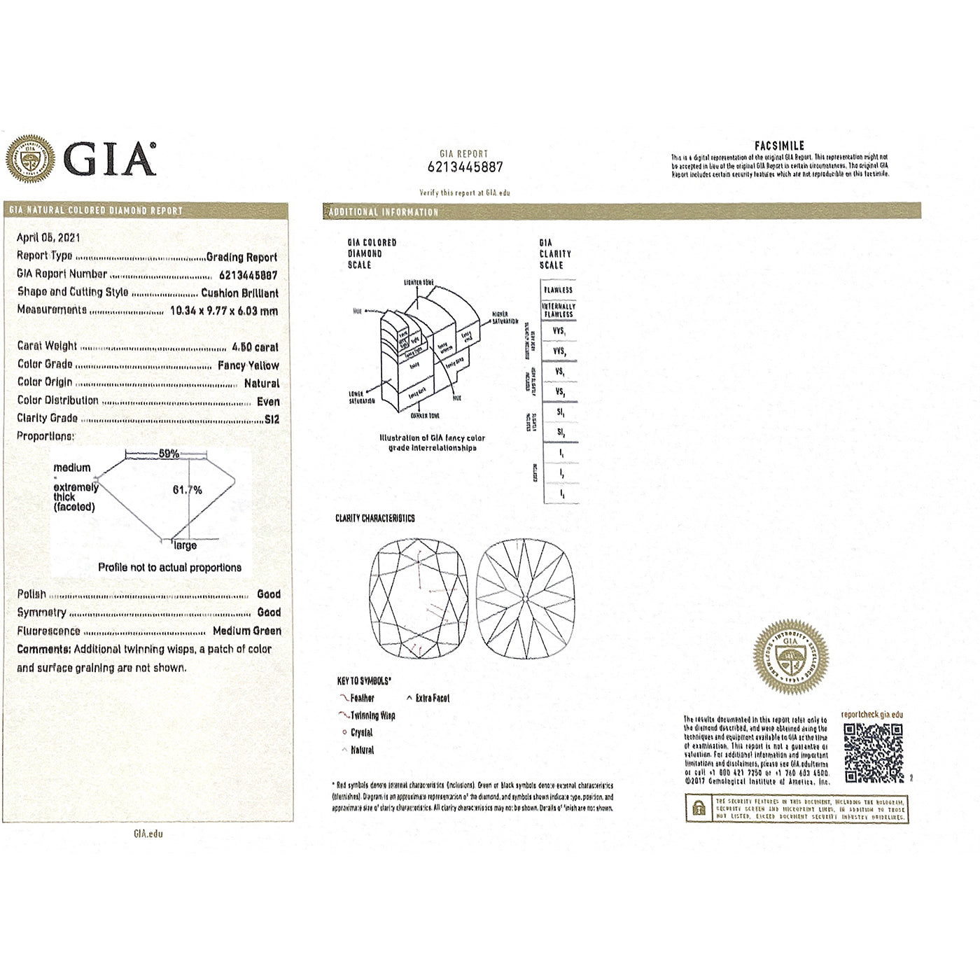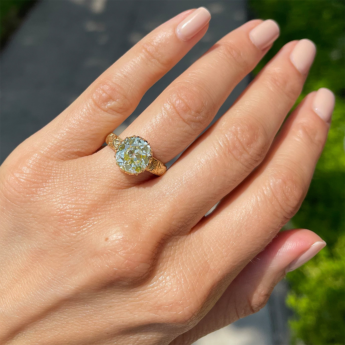 Late Victorian era 4.50 Carat Old Mine Cut Diamond Solitaire Engagement Ring composed of 18k yellow gold. The 4.50 carat Old Mine Cut diamond is GIA certified Natural Fancy Yellow color/SI2 clarity. Diamond is a slightly elongated cushion-shape and is set in a multiple-claw prong setting. With ornately decorated shoulders and shank featuring an ivy vine motif. Fully hallmarked, English origin. Circa 1900.