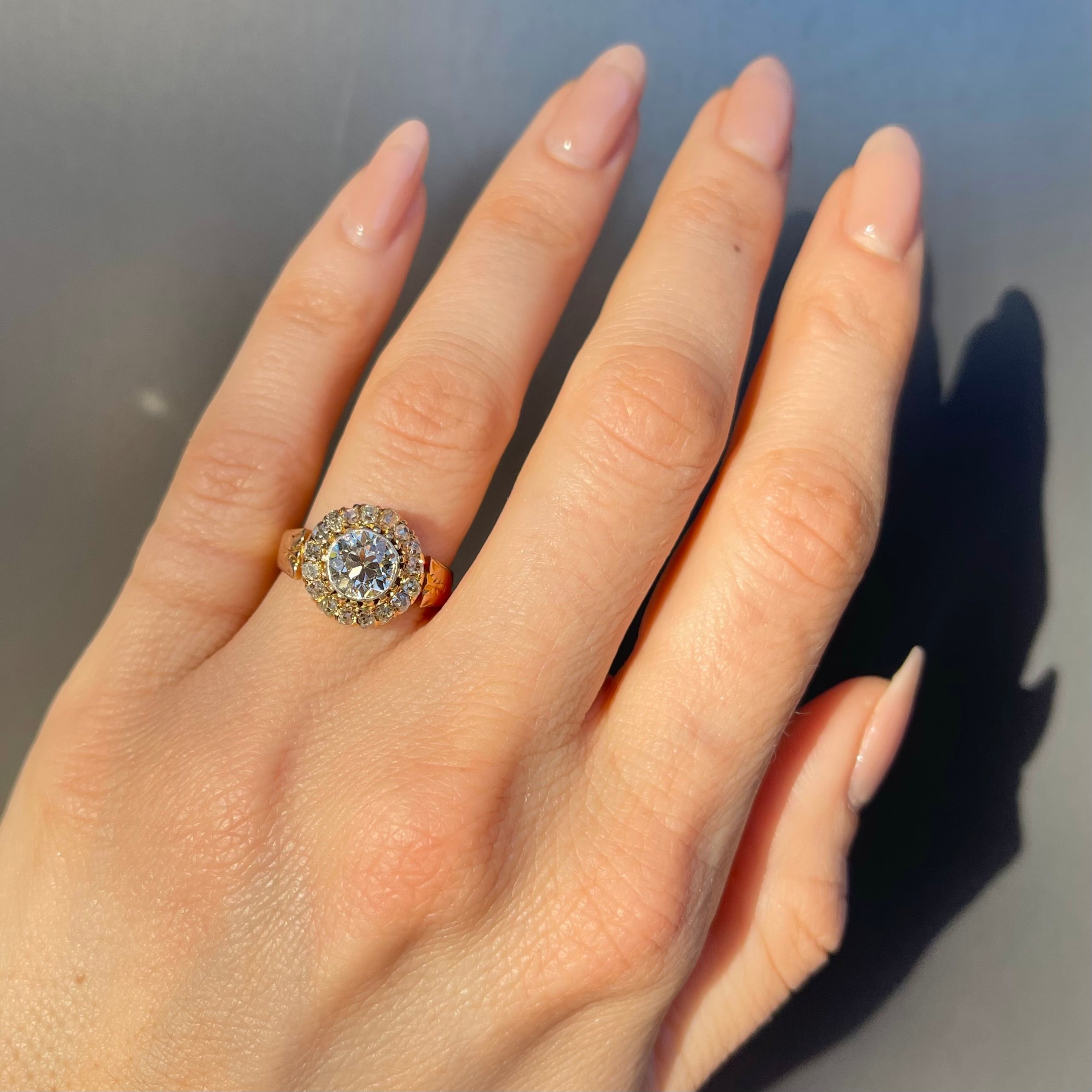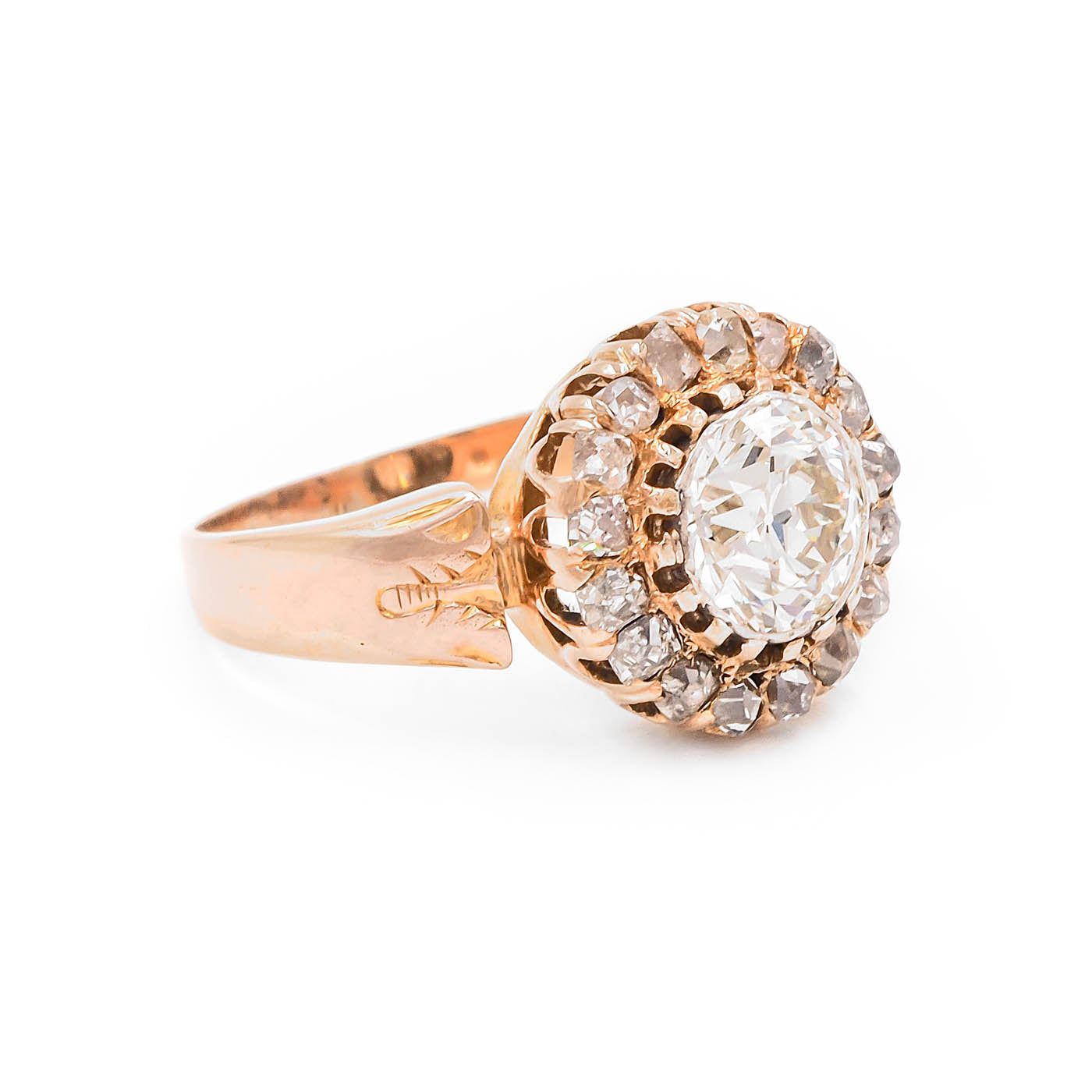 Victorian era 1.43 Ct. Old European Cut Diamond Cluster Engagement Ring composed of 18k yellow gold. Featuring a 1.43 carat Old European Cut diamond, GIA certified N color/VS2 clarity. The center diamond is surrounded by 17 diamonds, a combination of Rose Cut & Old Mine Cut diamonds, weighing approximately 0.50 carats in total. With slightly widened, detailed shoulders. Circa 1890.