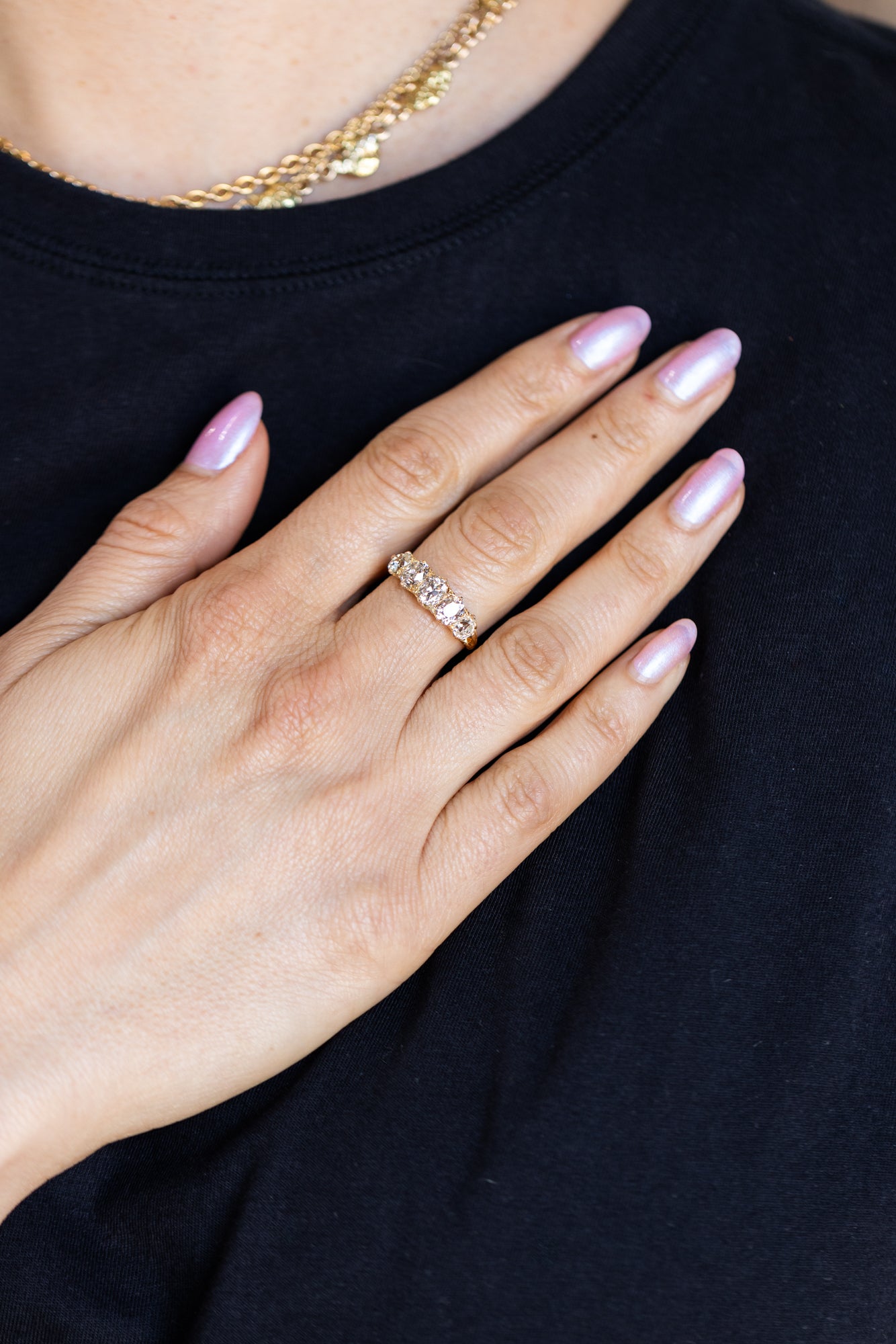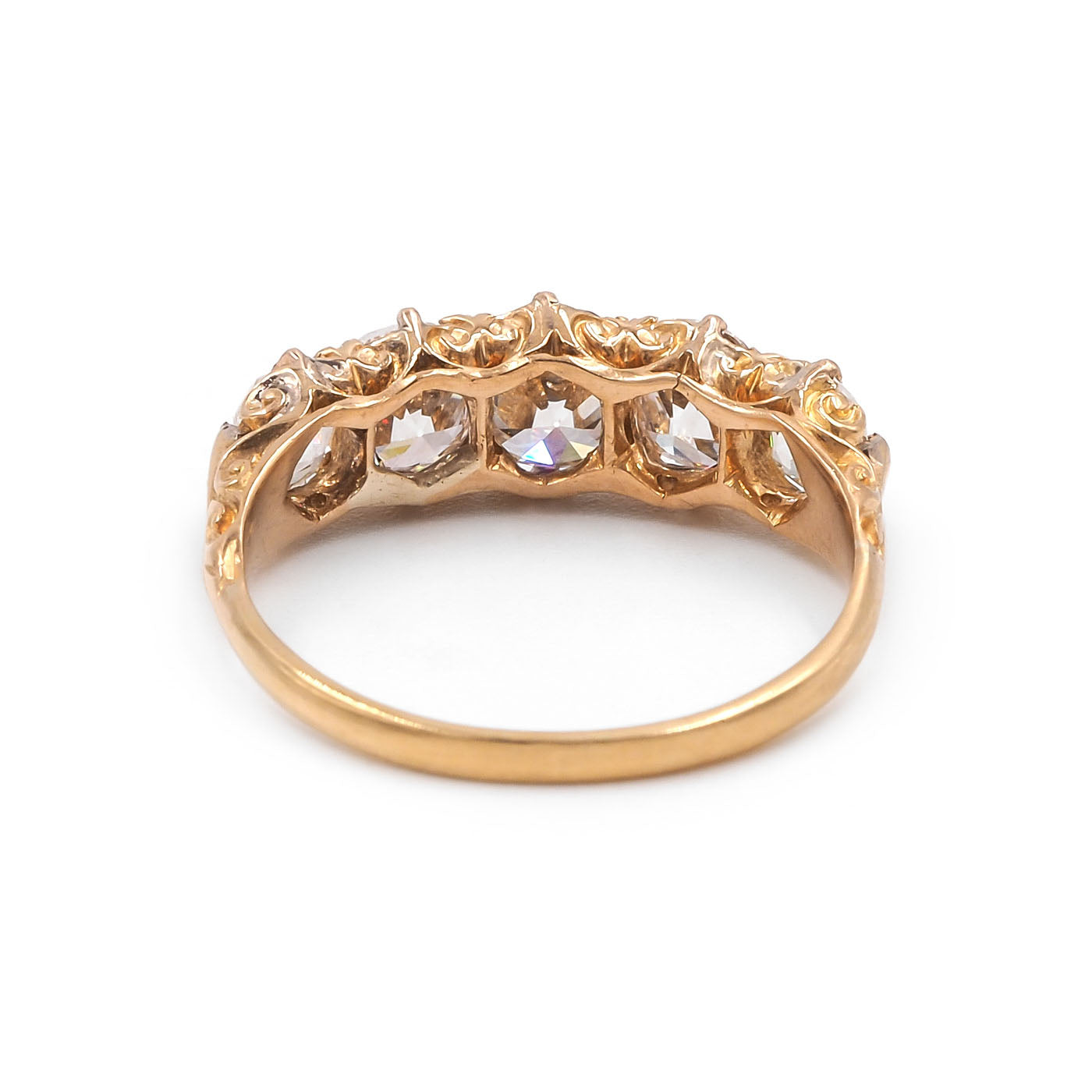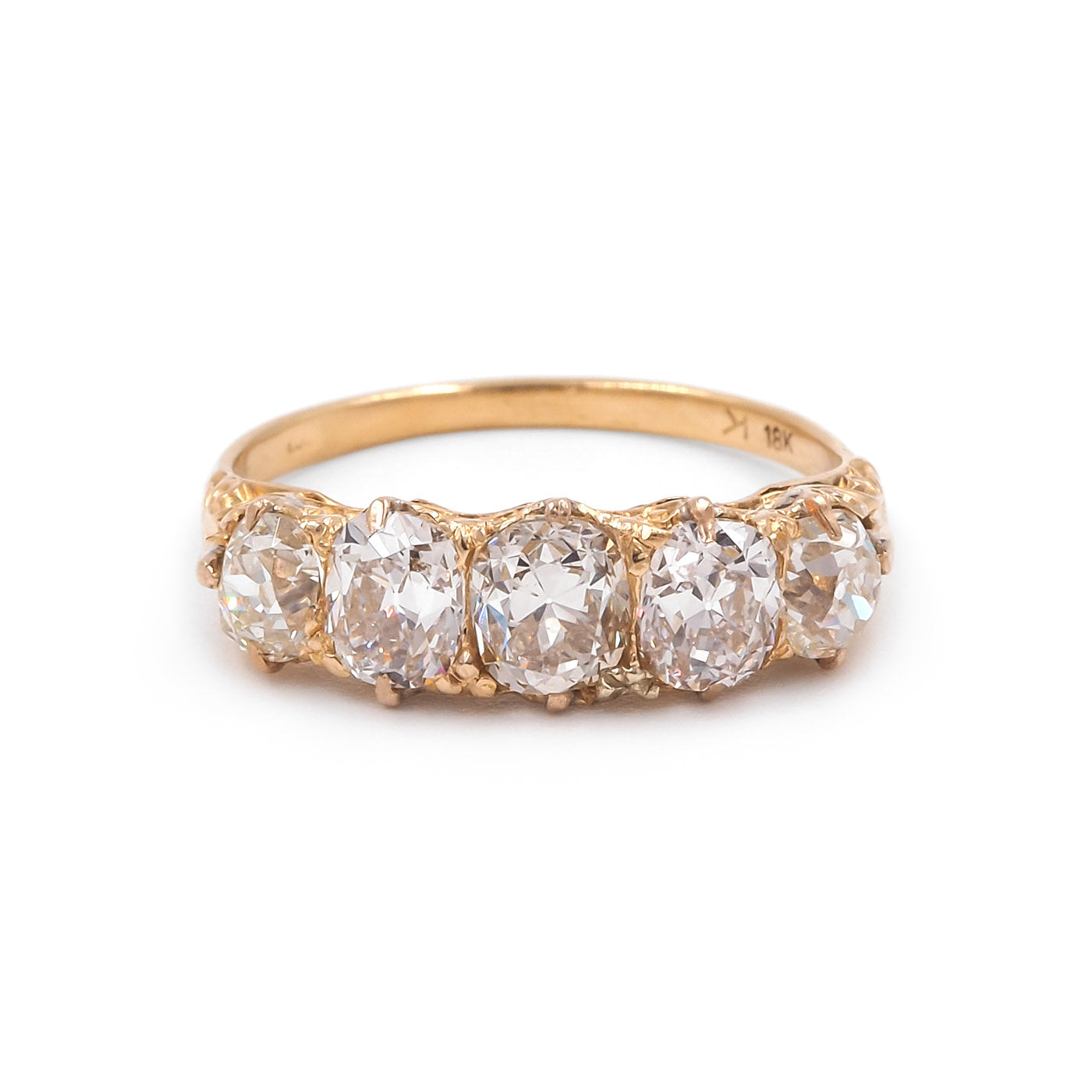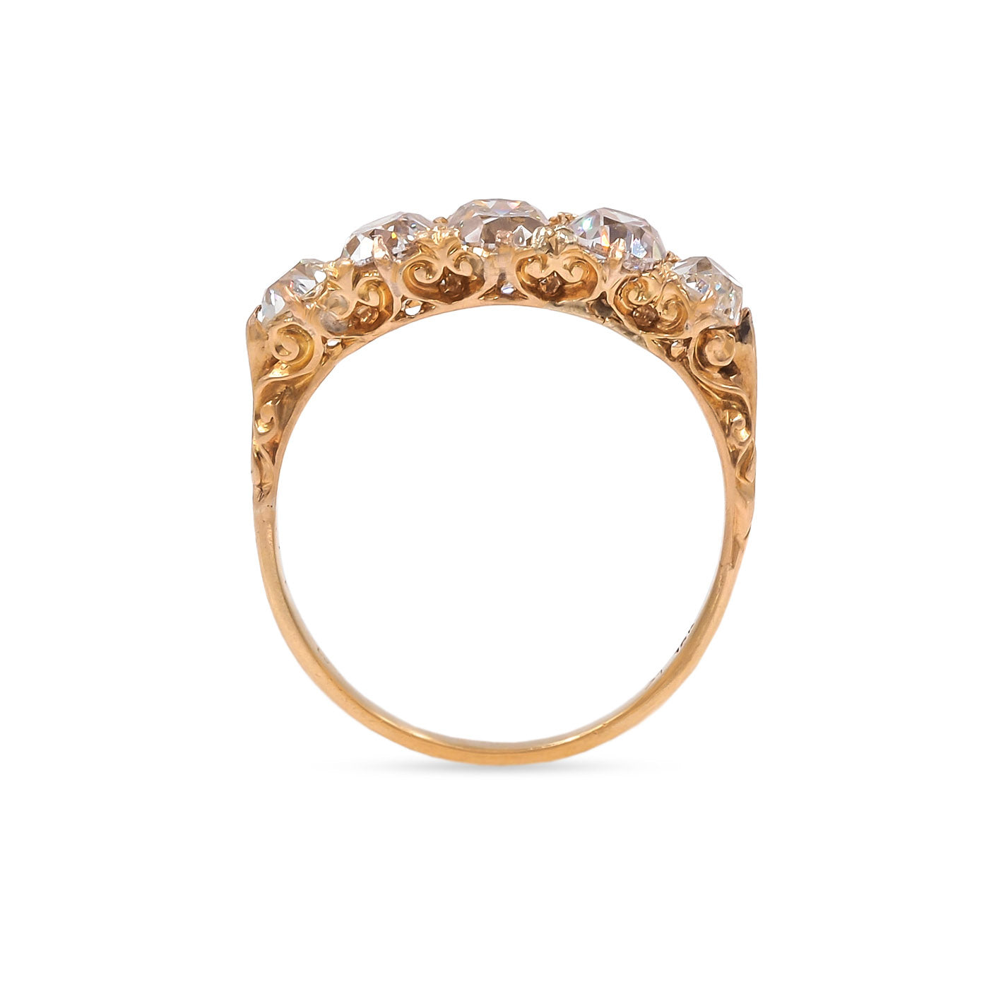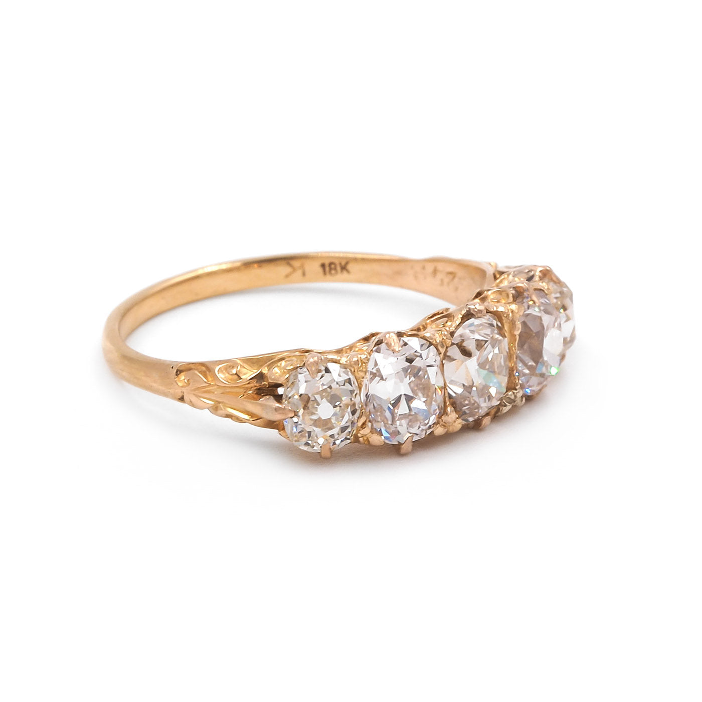 Victorian 2.66 Ctw. Old Mine Cut Diamond 5-Stone Ring composed of 18k yellow gold. With 5 Old Mine Cut diamonds, individual weights estimated to be: 0.73 carats, 0.62 carats, 0.57 carats, 0.39 carats, and 0.37 carats; the diamonds' colors are estimated to range L-M-N and the clarities are estimated to range VS2-SI1. The diamonds are set within multiple claw prongs, with ornate engraved detailing to the ring's basket and shoulders. Circa 1890.