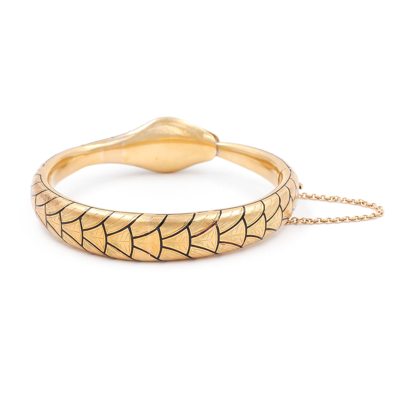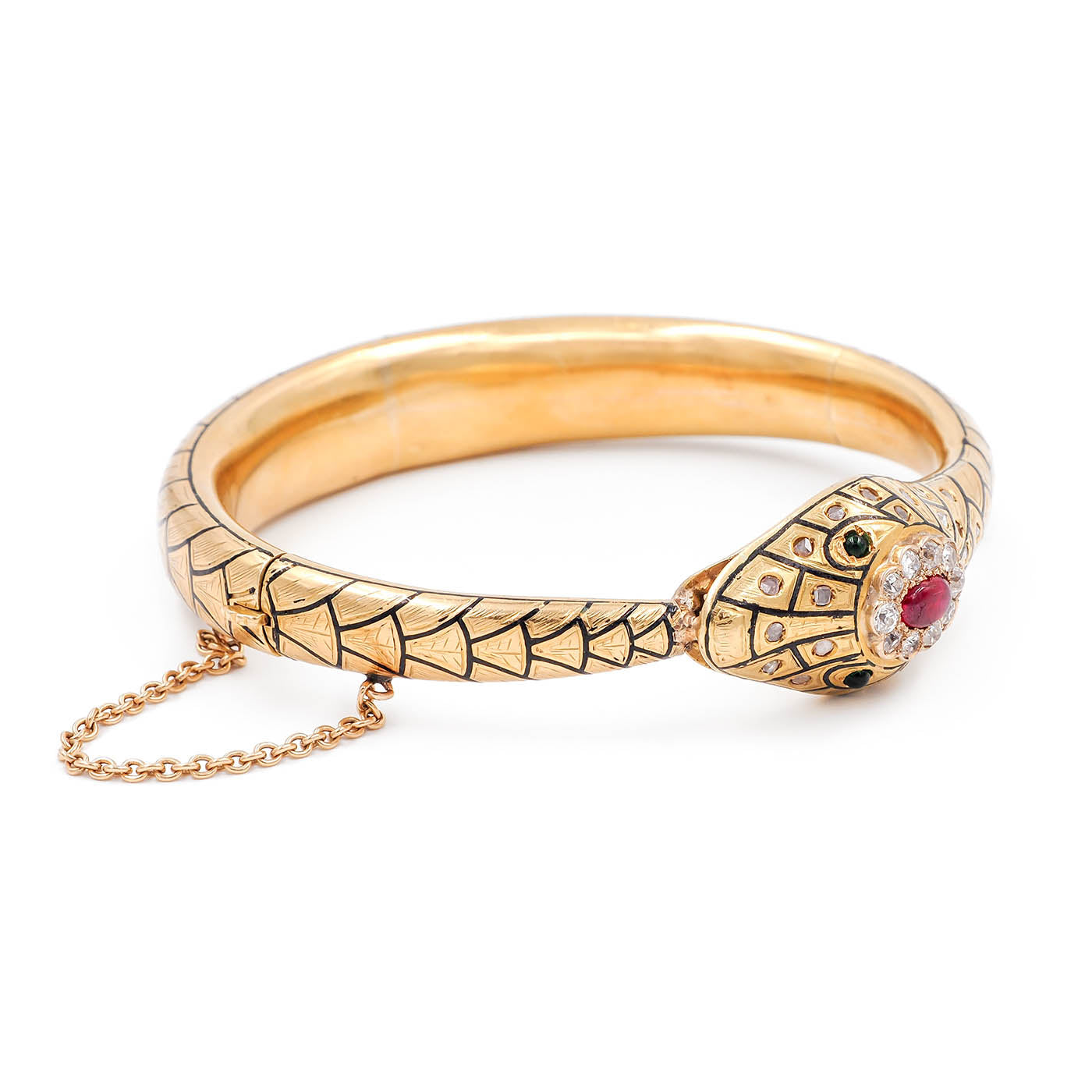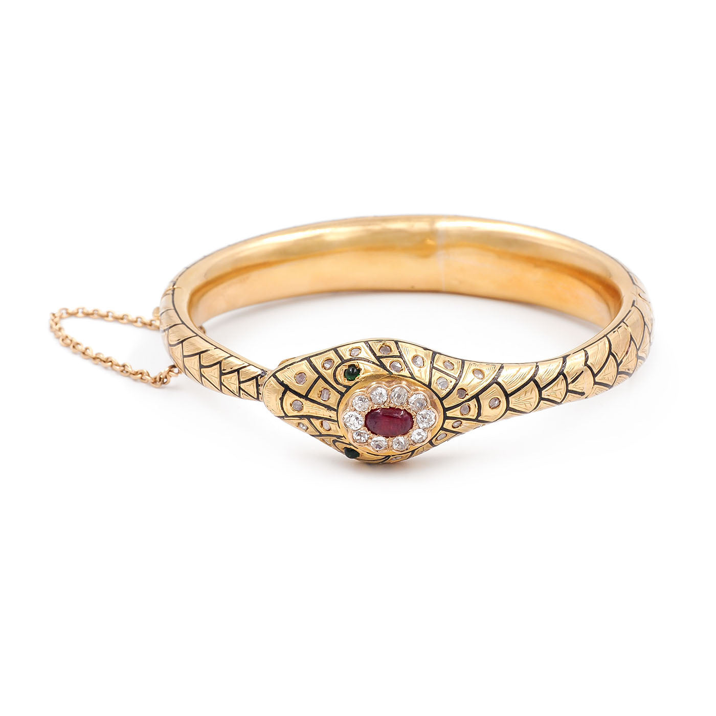 Victorian era Ruby & Diamond Enameled Ouroboros Snake Bangle Bracelet composed of 18k yellow gold. A beautifully detailed snake bangle, with etched and black enameled lifelike scale details throughout the surface of the bracelet. With 25 diamonds, a combination of Old Mine Cut and Rose Cut diamonds, weighing approximately 0.90 carats in total. The diamonds are clustered around a natural Cabochon ruby that weighs approximately 0.80 carats. The snake has 2 Cabochon emeralds for its eyes, detailed teeth, and a classic 'ouroboros' motif. The bracelet weighs 43.2 grams; the front of the head measures approximately 17.2 mm wide. The interior of the bracelet spans 2 1/2" wide & fits a wrist size 7-7.25" approximately. Hinges open, with a clasp closure and safety chain. Circa 1900-1910.