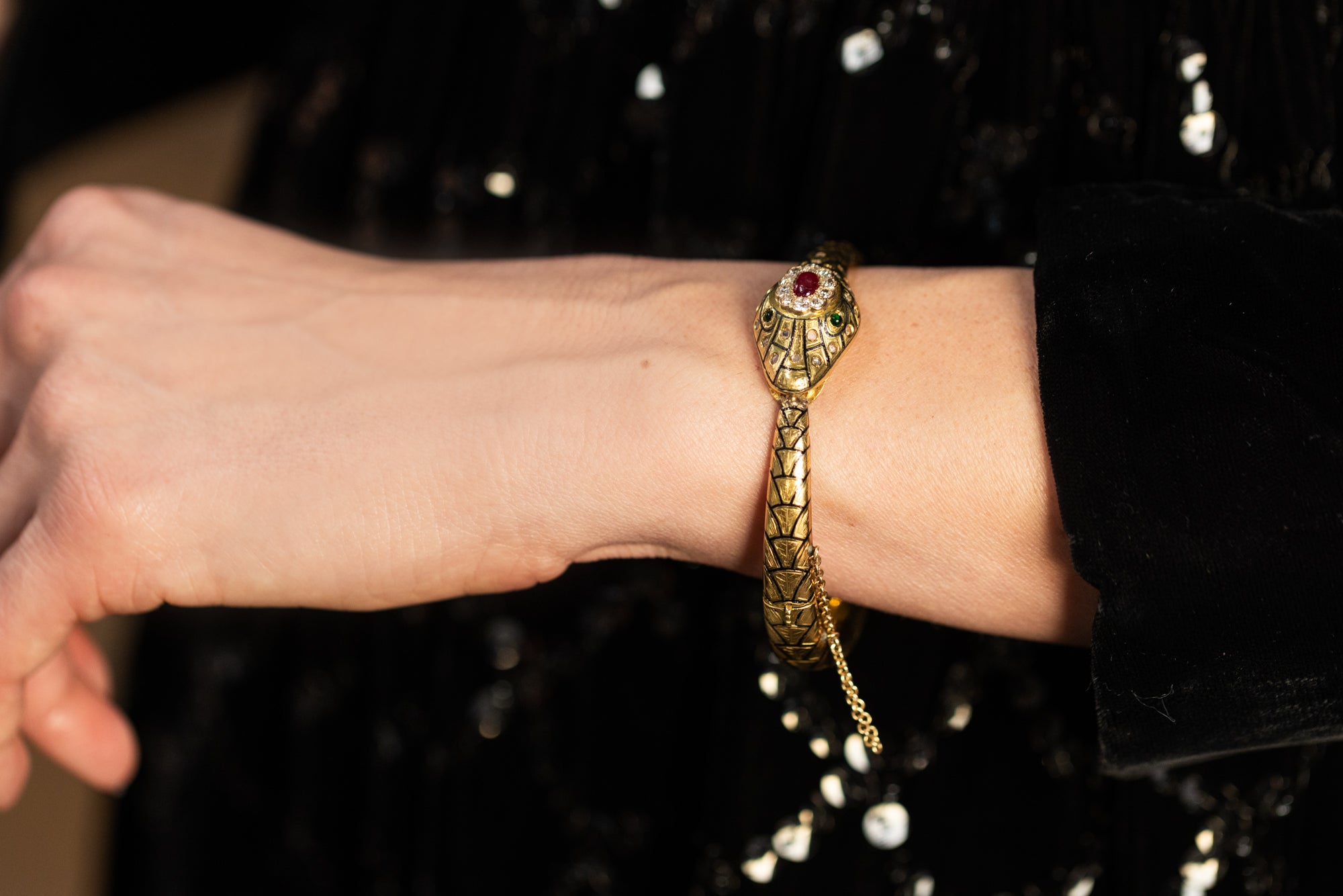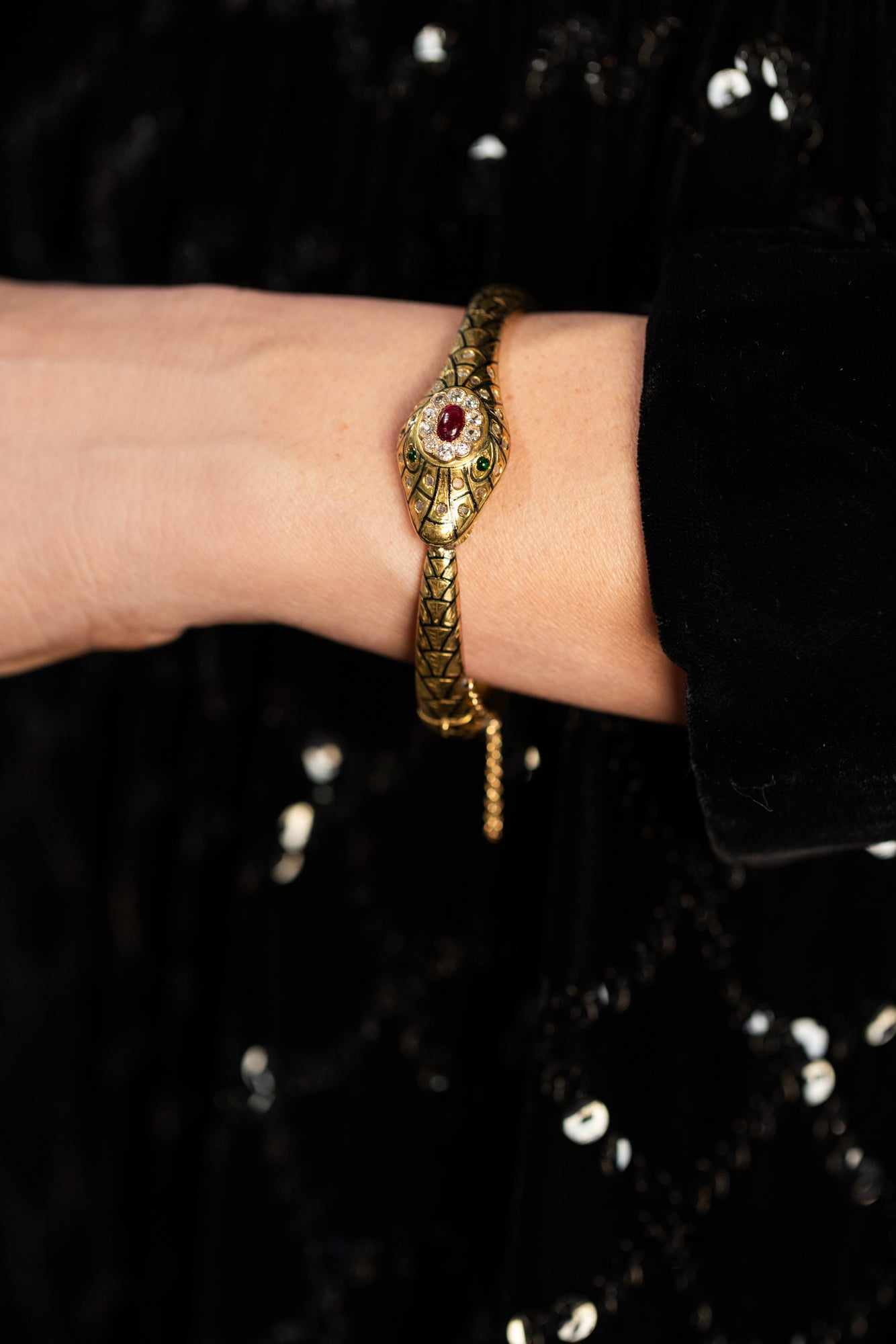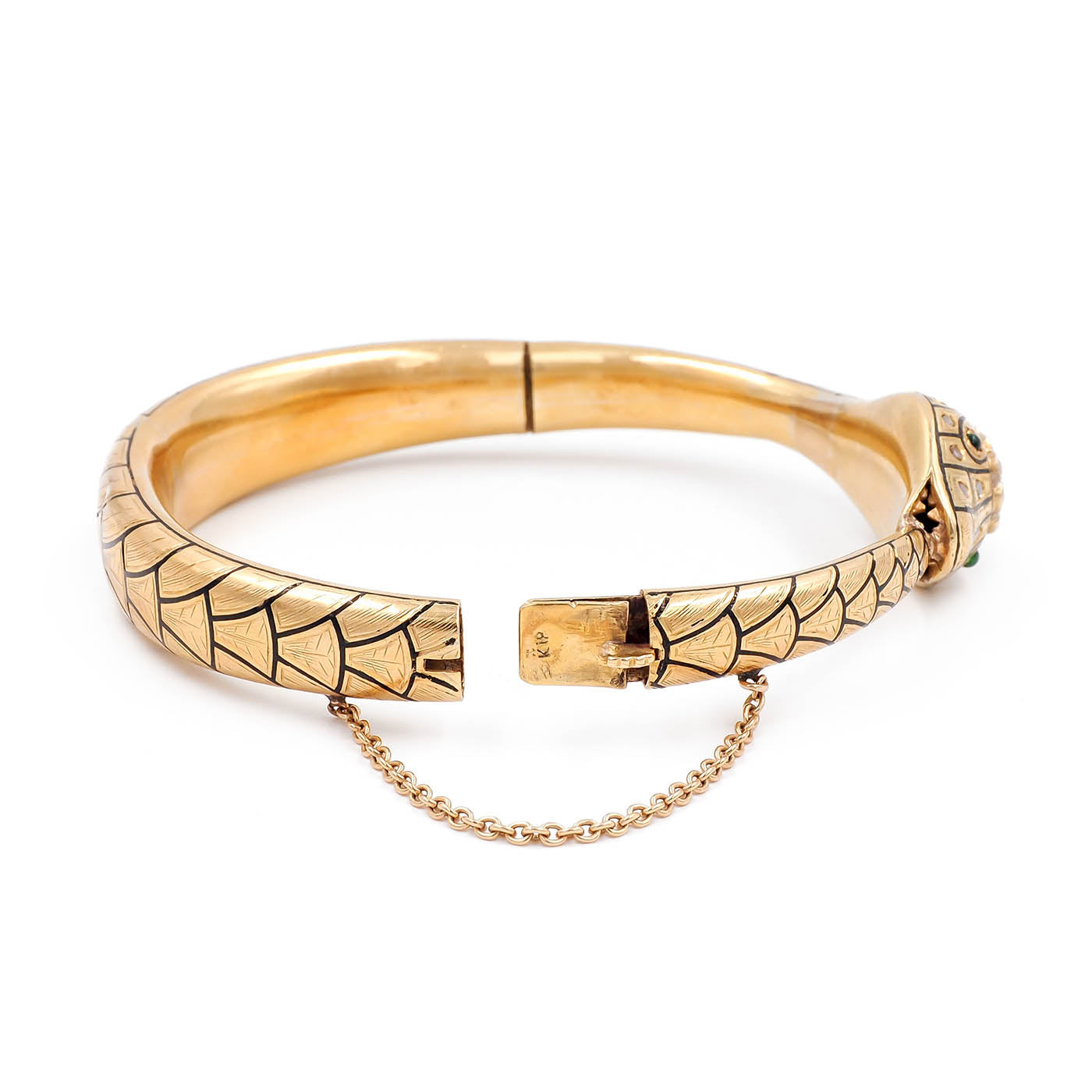 Victorian era Ruby & Diamond Enameled Ouroboros Snake Bangle Bracelet composed of 18k yellow gold. A beautifully detailed snake bangle, with etched and black enameled lifelike scale details throughout the surface of the bracelet. With 25 diamonds, a combination of Old Mine Cut and Rose Cut diamonds, weighing approximately 0.90 carats in total. The diamonds are clustered around a natural Cabochon ruby that weighs approximately 0.80 carats. The snake has 2 Cabochon emeralds for its eyes, detailed teeth, and a classic 'ouroboros' motif. The bracelet weighs 43.2 grams; the front of the head measures approximately 17.2 mm wide. The interior of the bracelet spans 2 1/2" wide & fits a wrist size 7-7.25" approximately. Hinges open, with a clasp closure and safety chain. Circa 1900-1910.