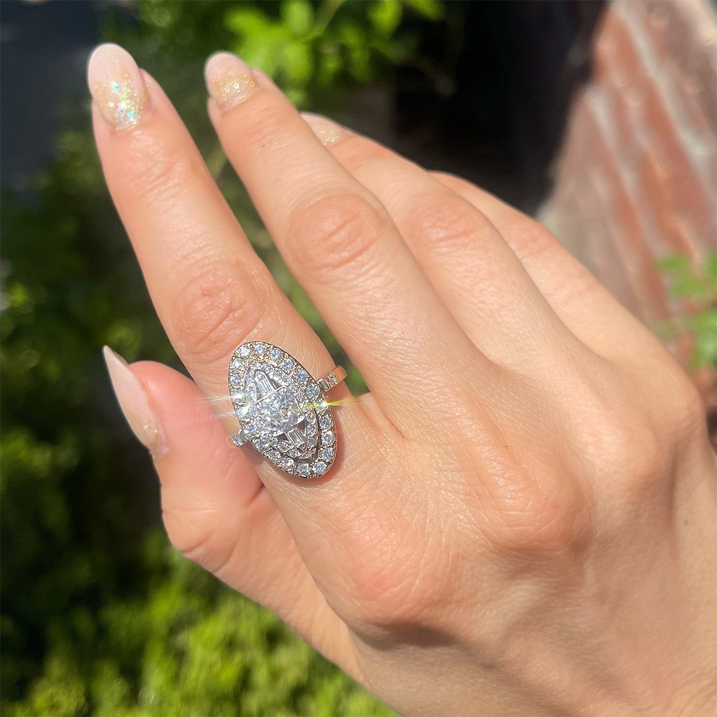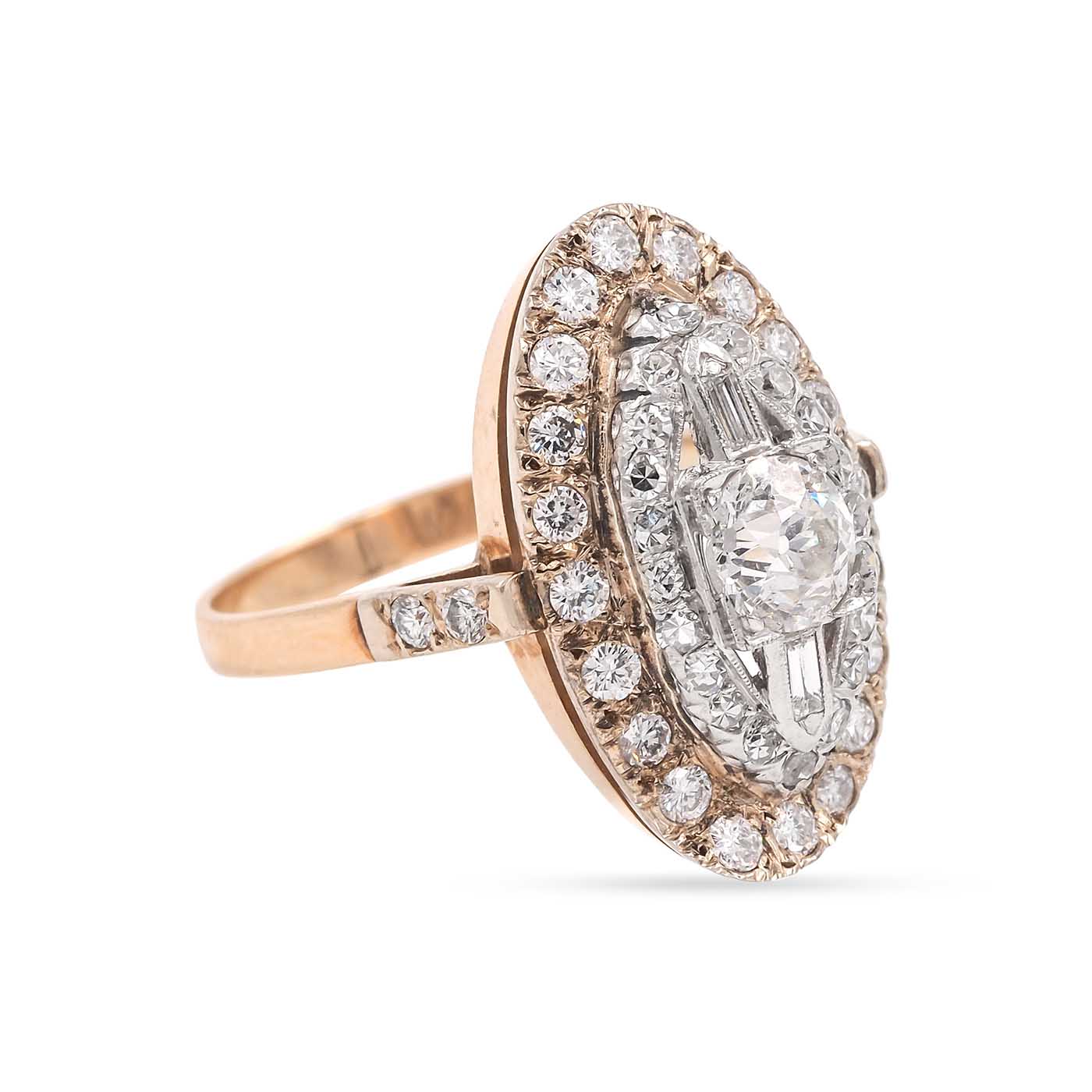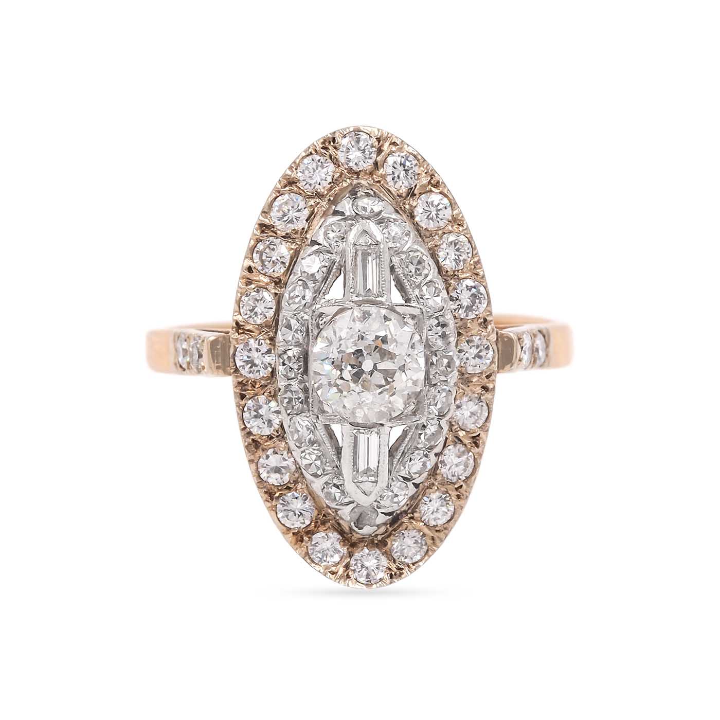 Vintage 1.56 Ctw. Diamond Navette Two-Tone Ring composed of 14k yellow gold and platinum. The center of the ring is a Retro-era mounting that is set with a 0.60 carat Old European Cut diamond and 2 Baguette Cut diamonds — the 2 Baguette Cut diamonds and additional 44 diamonds in the 1960’s-era setting weigh approximately 0.96 carats in total. The ring measures approximately 1″ tall by 1/2″ wide at the front; weighs 6.2 grams. Circa 1935-1960.