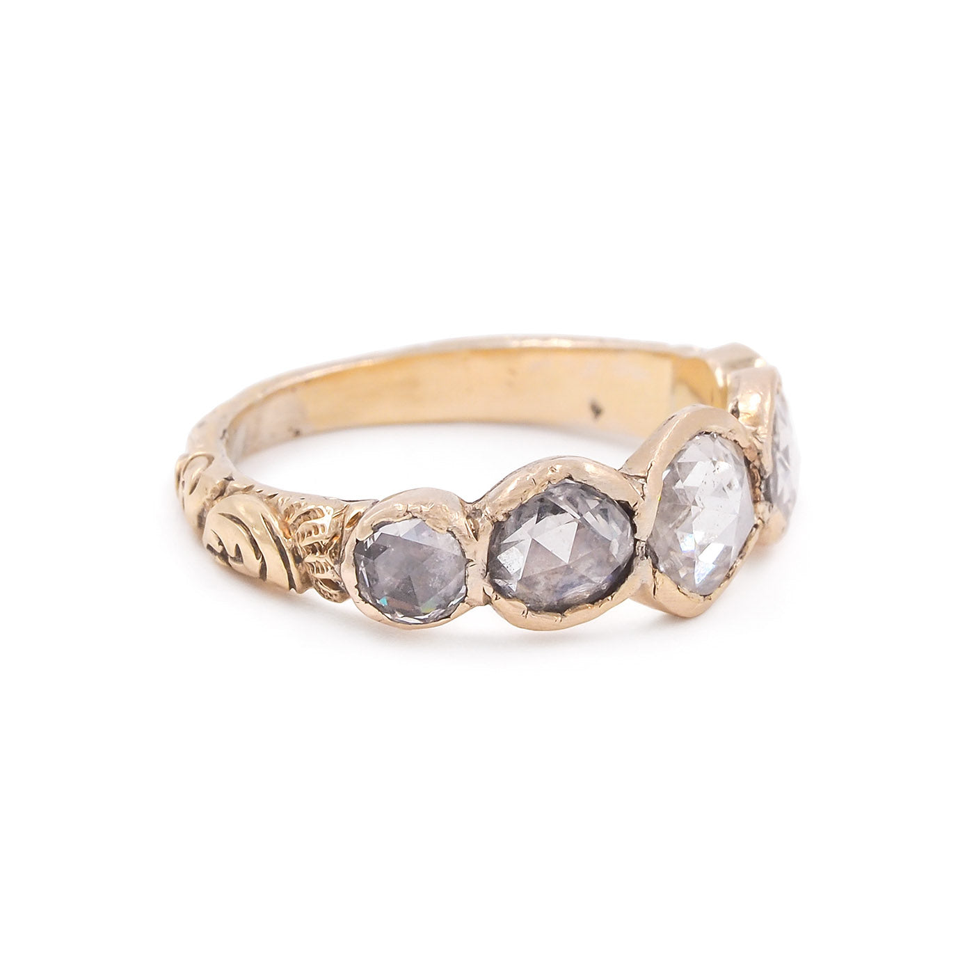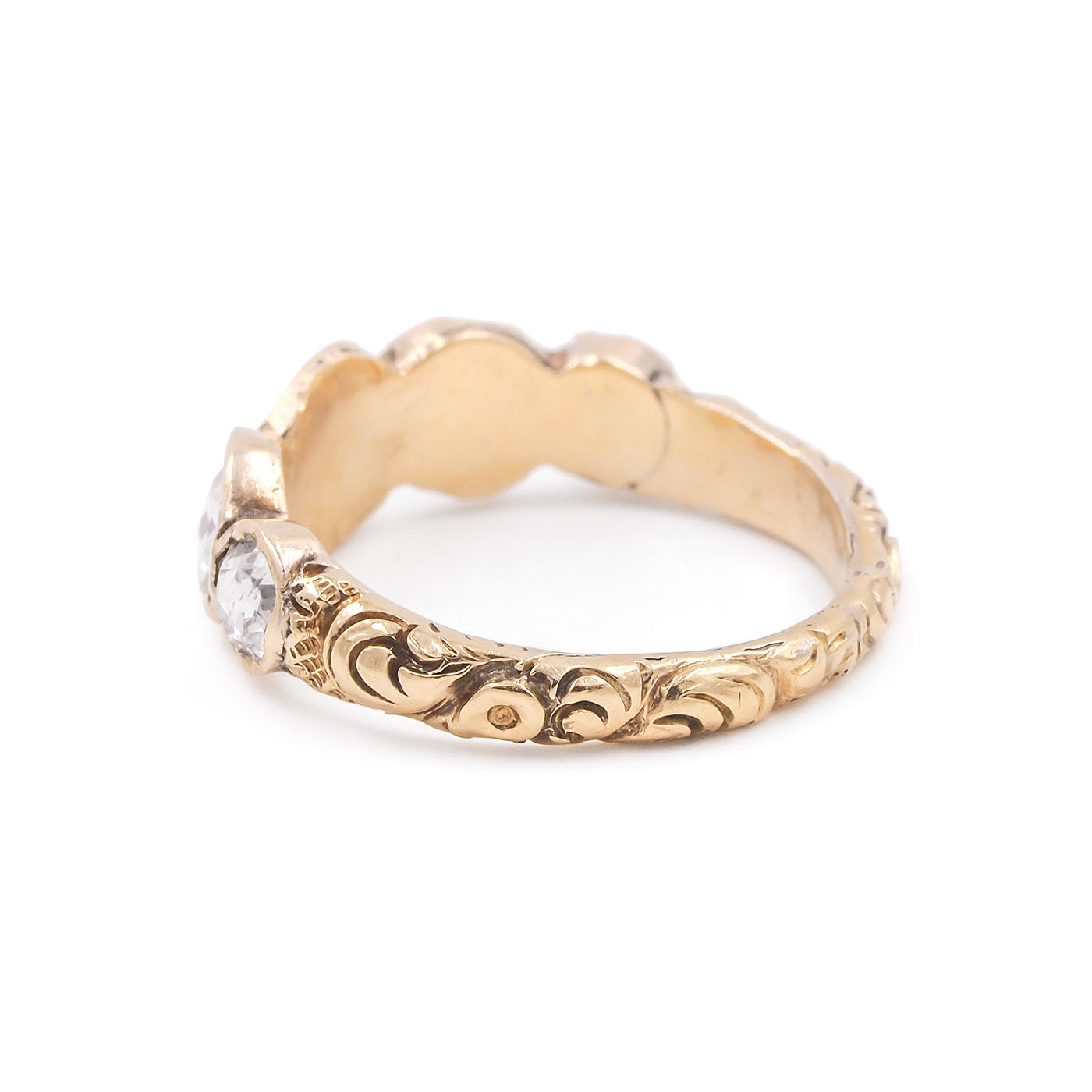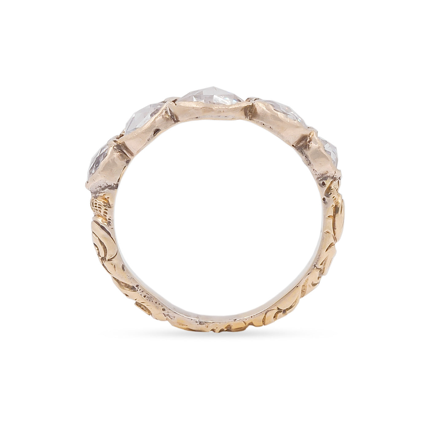 Georgian era 1.08 Ctw. Rose Cut Diamond Half Hoop Ring composed of 18k yellow gold and silver. With 5 Rose Cut diamonds weighing approximately 1.08 carats in total; the diamonds are collet-set and close-backed with foil. With engraved chased details down the shoulders and throughout the shank. Circa 1835.