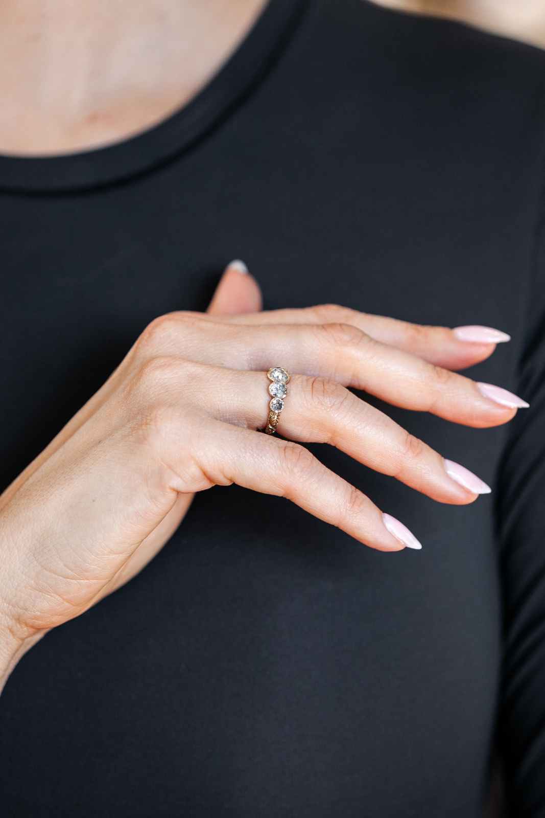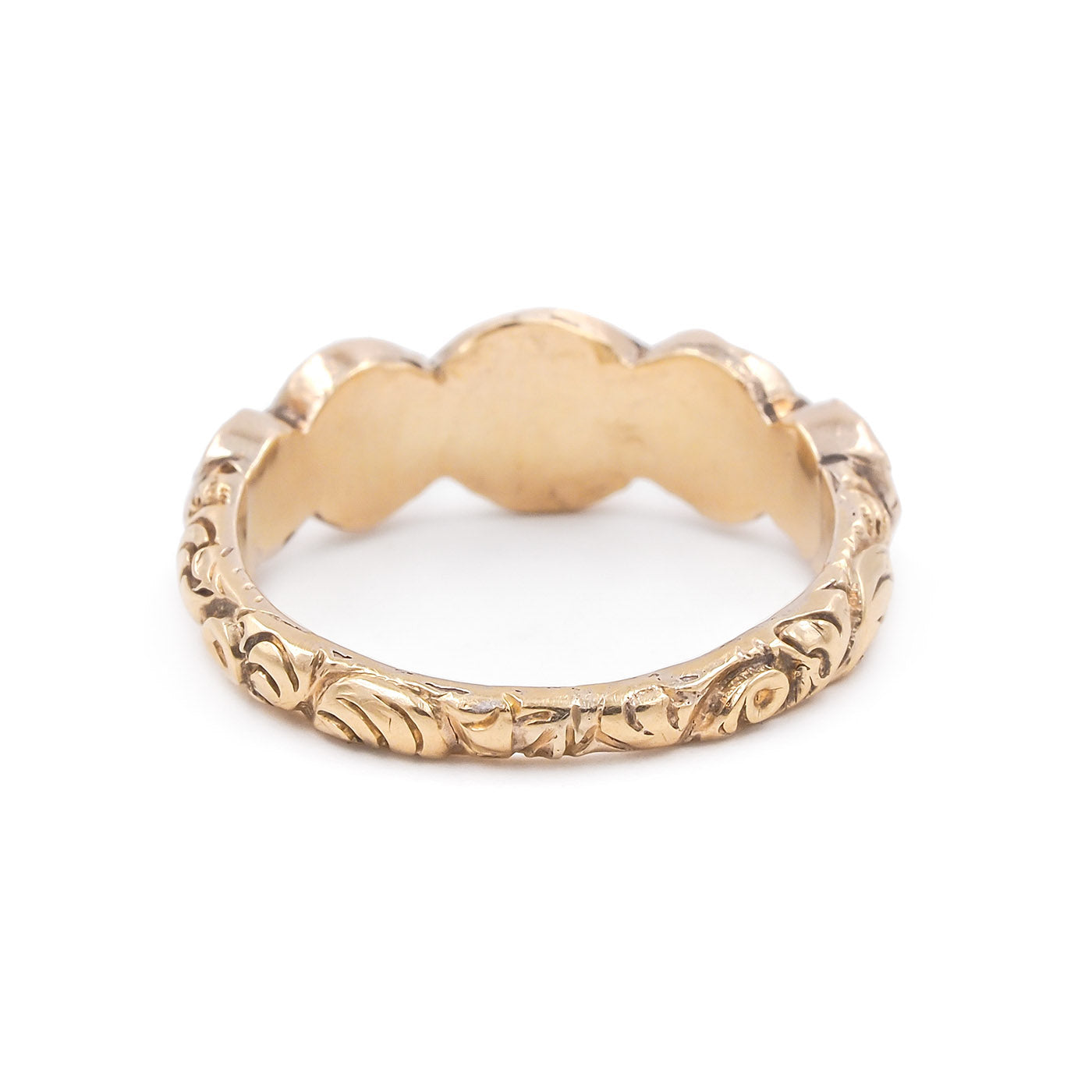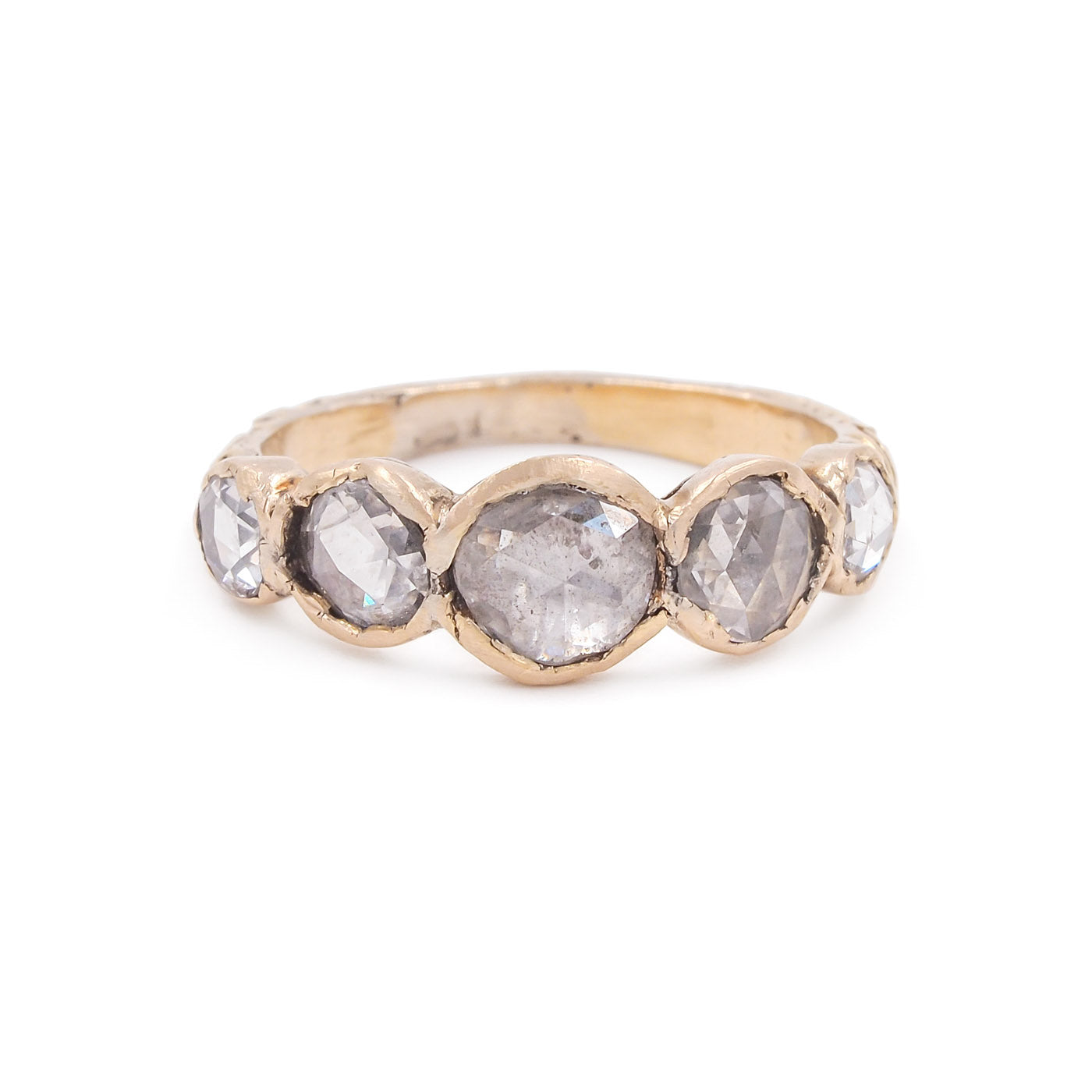 Georgian era 1.08 Ctw. Rose Cut Diamond Half Hoop Ring composed of 18k yellow gold and silver. With 5 Rose Cut diamonds weighing approximately 1.08 carats in total; the diamonds are collet-set and close-backed with foil. With engraved chased details down the shoulders and throughout the shank. Circa 1835.