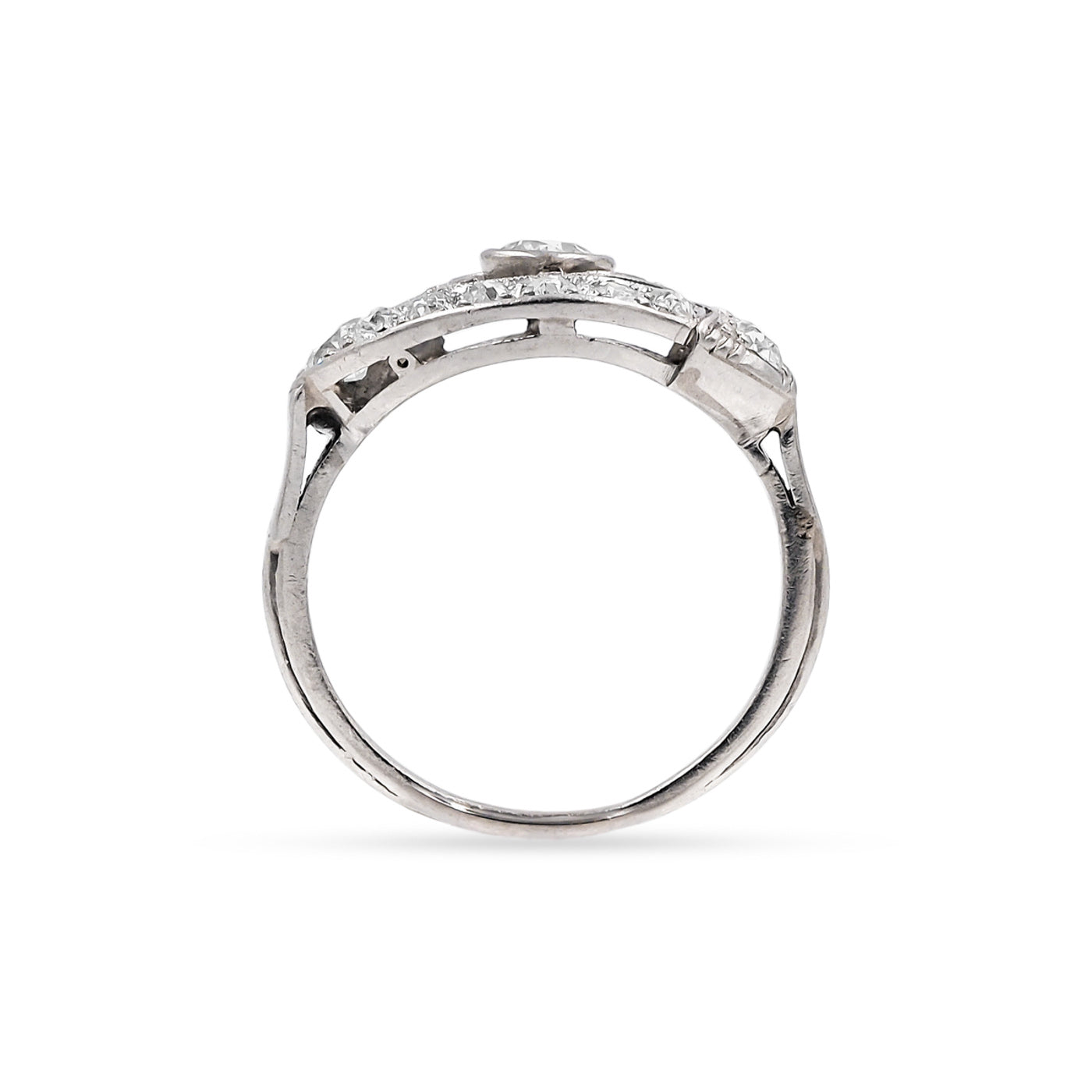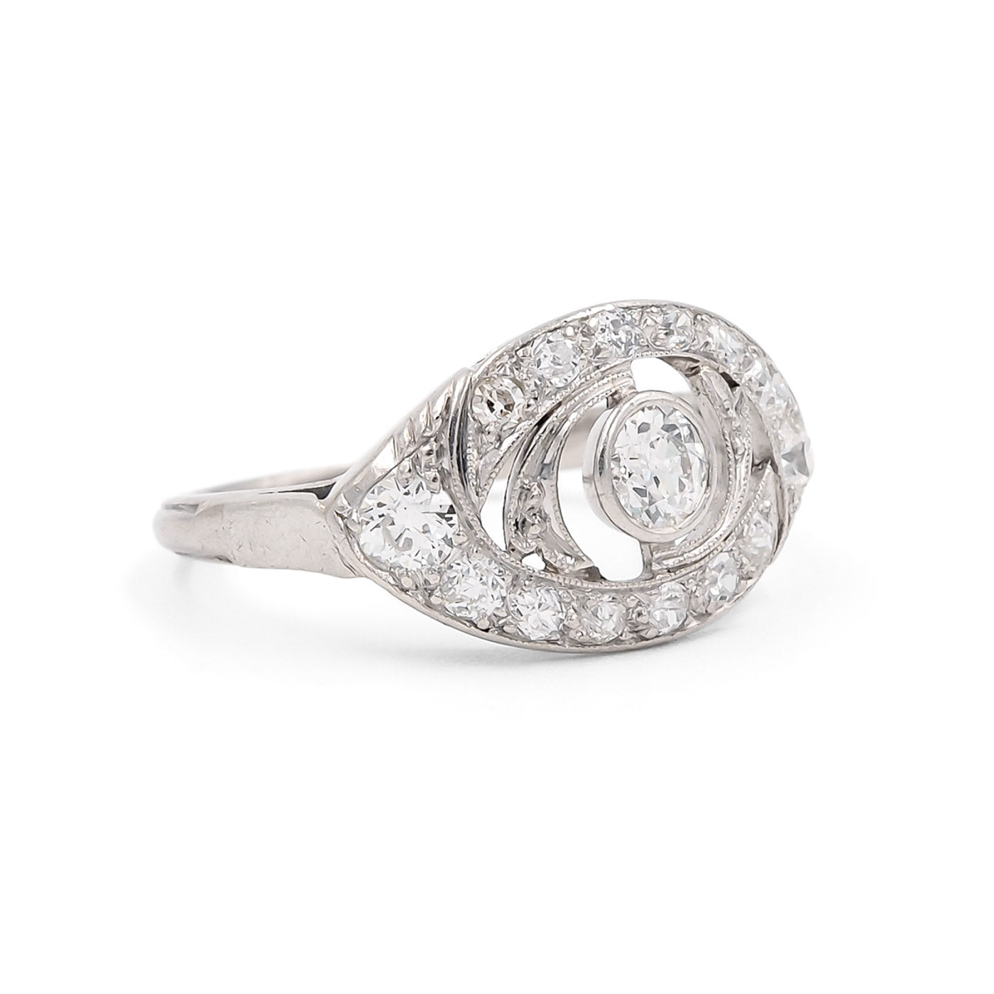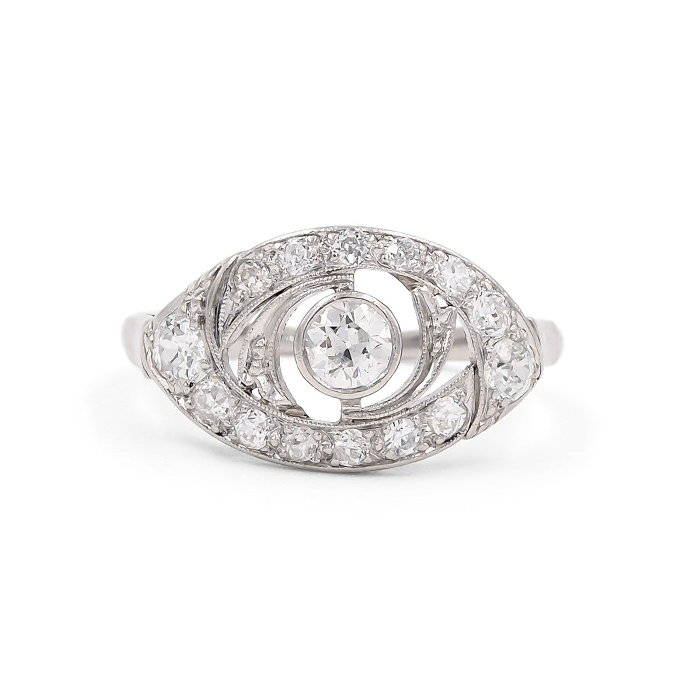 Edwardian era 0.90 Ctw. Old European Cut Diamond ‘Eye’ Ring composed of platinum. Set with 15 Old European Cut diamonds weighing approximately 0.90 carats in total with colors ranging I-K & clarities ranging VS2-I1, arranged in a horizontal oval ‘eye’ motif. With cutout details and fine milgrain throughout. Circa 1915.